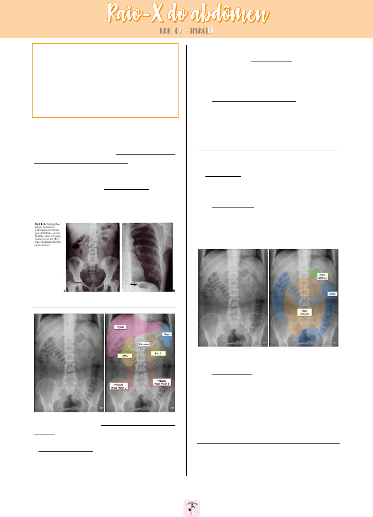 1 Júlia Morbeck – @med.morbeck Tradicionalmente, a radiografia simples do abdome em AP (decúbito dorsal e ortostatismo) e a radiografia de tórax em PA (ortostática) fazem parte do algoritmo de avaliação do abdome agudo. Entretanto, na grande maioria das situações clínicas, os achados radiológicos são inespecíficos, o que muitas vezes impossibilita ou retarda o diagnóstico de doenças graves como pancreatite aguda e isquemia mesentérica, com repercussão negativa no prognóstico destes pacientes. Neste contexto, a ultrassonografia e, principalmente, a tomografia computadorizada têm demonstrado maior acurácia e aceitação na prática médica. ↠ A radiografia simples do abdome é um método rápido, amplamente disponível nos centros médicos e que não utiliza meio de contraste. A sua interpretação requer uma avaliação sistemática. A radiografia em AP (anteroposterior) em decúbito dorsal é a que fornece maior detalhe das anatomias radiológica e patológica. A radiografia em AP, com o paciente em ortostatismo, tem a finalidade de demonstrar níveis hidroaéreos, presença de ar livre acumulado abaixo do diafragma (pneumoperitônio) e avaliar a mobilidade ou fixação das estruturas após a mudança de decúbito. ANATOMIA ↠ Podemos identificar no hipocôndrio direito o contorno hepático, permitindo identificar hepatomegalia, por exemplo. No hipocôndrio esquerdo podemos identificar o contorno esplênico, permitindo suspeitar de esplenomegalias ↠ Nas regiões paravertebrais logo abaixo das últimas costelas vemos as sombras renais (a esquerda um pouquinho mais alta, geralmente) e as sombras dos músculos psoas maiores. ↠ Já o pâncreas, não conseguimos ver seus contornos, mas podemos inferir sua localização (a cabeça fica anterior à projeção do rim direito e a cauda junto do hilo esplênico), o que permite identificar algumas alterações como calcificações pancreáticas na pancreatite crônica. ↠ Podemos ainda avaliar, com bastante qualidade, a distribuição dos gases intestinais nos órgãos ocos. O estômago pode ou não conter gás. Geralmente observamos em pequena quantidade, o que chamamos de bolha gástrica, que fica localizada normalmente no hipocôndrio esquerdo, abaixo da cúpula diafragmática esquerda. ↠ O intestino delgado apresenta bem pouco ou quase nenhum gás normalmente (exceto nas crianças que choram e acabam engolindo bastante ar). Observamos geralmente pequenas bolhas localizadas na região central do abdome. ↠ O intestino grosso constitui a moldura da radiografia abdominal. Os cólons tem posição periférica e geralmente são preenchidos por gás e fezes. Além de sua característica posição no abdome, podemos identificar alças cólicas pela sua assinatura que são as haustrações, saculações que são identificadas como pregas incompletas nas paredes dos cólons. INCIDÊNCIA • Avaliar pelo menos duas incidências; • Decúbito supino + ortostase; • Decúbito lateral com raios horizontais; LAB. 02 - IMAGEM Radiografia de abdome em incidência frontal (decúbito dorsal). 2 Júlia Morbeck – @med.morbeck • Abdome agudo: decúbito supino + ortostase + radiografia de tórax (devido a dor referida). Fígado: flexura direita mais baixa; Ampola retal: tem ar. COMO EU AVALIO UM RAIO-X DE ABDOME? ↠ Existem várias sequências possíveis de avaliação da radiografia de abdome. Você pode inclusive criar a sua própria! O importante é que você sistematize a avaliação em um checklist, para que não esqueça de nada. ↠ Uma sequência bastante útil na prática é a A-B-C-O-D: A: Ar ↠ Procure ar onde não deveria ter: fora de alça intestinal. Este achado é observado em afecções abdominais geralmente graves como abdome agudo perfurativo ou isquêmico e, por isso, o primeiro passo da avaliação da radiografia de abdome é procurar ar fora de alça. Pneumoperitônio: geralmente representa a perfuração de uma víscera oca. As principais causas são: úlcera gástrica perfurada, apendicite/diverticulite perfuradas, pós-operatório (deiscência de anastomoses) e trauma de víscera oca. É identificado com maior facilidade nas imagens em ortostase (RX abdome ortostático ou RX de tórax ortostático) como um acúmulo de gás abaixo das cúpulas diafragmáticas. B: “Bowel” ↠ Procure distensão das alças intestinais e, se houver, tente entender o nível da obstrução intestinal (obstrução alta x obstrução baixa). Obstrução do intestino delgado: pode ser causada por uma obstrução mecânica ou funcional. Dentre as causas mecânicas destacam-se as aderências (causa mais comum disparadamente!) e as hérnias. Dentre as causas funcionais destacam-se as alterações inflamatórias e metabólicas pós-operatórias, medicações e outras condições inflamatórias sistêmicas ou abdominais. ↠ Mas como eu vou saber que aquela alça distendida é uma alça de delgado? As principais características de uma alça delgada são: localização central no abdome e a presença das válvulas coniventes (sinal do empilhamento de moedas). Obstrução do intestino grosso: geralmente é causada por neoplasias (o câncer colorretal é a principal causa de obstrução do cólon em adultos), volvo e impactação fecal (principalmente idosos, pacientes acamados…). ↠ As principais características de uma alça de cólon na radiografia de abdome são: localização periférica no abdome e a presença das haustrações (as pregas mucosas do intestino grosso são descontínuas). As alças delgadas podem também estar distendidas nas obstruções do intestino grosso caso a válvula ileocecal não for competente. Portanto, se você observar uma distensão difusa, de delgado e cólon, geralmente ocupando todo o abdome, pense em obstrução cólica com válvula ileocecal incompetente! C: “CÁLCIO” ↠ Procure por cálculos e calcificações Litíase urinária: A maioria dos cálculos urinários são calcificados po