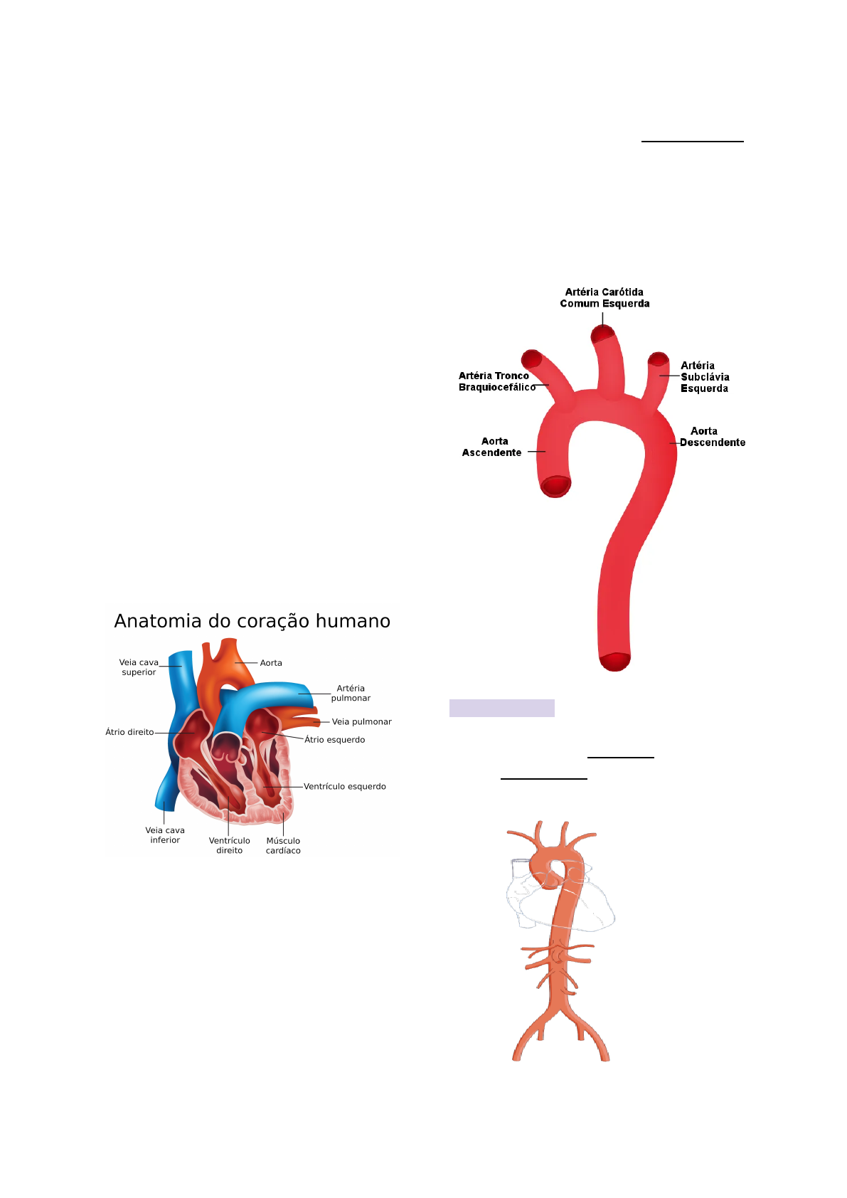 SI���M� DA AR�ÉRI� CA�ÓTI�� EX���N� Anatomia do coração(revisão); *possui um ápice do lado direito e uma porção superior(base)que estarão os vasos maiores; Porção arterial: direção centrífuga(do coração para periferia) Vasos da base: Artéria aorta,tronco pulmonar,veia cava superior,veia cava inferior e 4 veias pulmonares. - os 4 vasos das veias pulmonares não estudamos(da circulação menor) ● separado em 4 câmaras: átrios e ventrículos. ● Porção arterial de cabeça e pescoço sai do ventrículo esquerdo pela aorta. Artéria Aorta: Suplemento arterial: IRRIGAÇÃO. drenagem: venosa ou linfática. ● Artéria aorta tem divisões: Ascendente,arco aórtico e descendente; Ascendente: ● curta ● sai so a artéria coronária(irriga o coração) 1 Arco da aorta: sai 3 ramos: - Artéria carótida comum esquerda - Artéria subclávia esquerda: - Tronco arterial braquiocefálico. Tronco arterial braquiocefálico: ● sai o tronco braquiocefálico: Ramo artéria carótida comum direita e subclávia direita: ● O sangue sai do ventrículo esquerdo,vai para artéria aorta ascendente e depois arco da aorta e segue trajeto dependendo do lado. ● Das artérias carótidas comuns vai sair 2 ramos: Artéria carótida interna e carótida externa; carótida interna: Vai para o interior do crânio. (órbita e hemisfério cerebrais. Carótida externa: Irrita estruturas superficiais da face,pescoço e crânio. Artéria subclávia: ● irriga membros superiores. ● axila,pescoço e região cefálica. ● possui muitos ramos. Ramos da subclávia: >Artéria vertebral direita e esquerda: ● sobe para região de encéfalo e passa pelas vértebras. ● passa pelos forames transversos(vértebra cervical).depois que passa pelo atlas passa para o crânio pelo forame Magno. 2 >forame magno. ● Depois que passa pelo forame magno,as duas vértebras se juntam e formam a artéria basilar.(Anastomose) >Tronco tireocervical(ramo da subclávia) ● possui 3 ramos: >Artéria tireóidea inferior: ● vai para glândula tireoidea. >Artéria supraescapular: ● vai para cintura escapular (Articulação do membro superior com região do esqueleto axial-ombro) >Artéria cervical transversa: ● vai para porção mais inferior e superficial do pescoço; Artéria carótida comum: ● Do lado direito surge também o tronco braquiocefálico e do direito é direto do arco da aorta. ● Com isso,a artéria carótida do lado direito é integralmente cervical(exclusiva em região do pescoço) e esquerda tem uma porção torácica e depois vai para o pescoço. ● Ela possui dois ramos(interno e externo). ● Vamos ter uma bainha carotídea que envolve algumas estruturas(5): Bainha carotídea: membrana que envolve para proteção e são estruturas que não se ramificam. dá origem: - Artéria carótida comum - Artéria carótida interna 3 - veia jugular interna - nervo vago - componentes da alça cervical. ● Na região de bifurcação da carótida comum vai ter 2 viscero receptores: seio e corpo carotídeo; Seio carotídeo: bago receptor (receptor de pressão que vai monitorar pressão arterial); Corpo carotídeo: quimioreceptor que é uma massa oval presente na parede do vaso que contém quimiorreceptores que monitoram os teores de O2 e CO2.( oxigênio e dióxido de carbono). - glossofaríngeo inerva essa área. Carótida interno: ● trajeto ascendente e passa pela região cervical sem deixar ramo. ● Vai para o interior do crânio para irrigar estruturas internas passando pelo canal carotídeo. >canal carótido: passa artéria carótida interna ● vai para órbita e septo. Vamos ter ramos: Artéria oftálmica: passa para a órbita quando passa pelo canal óptico. >canal óptico. 4 ● Ela passa pelo canal óptico e se ramifica: Artéria supraorbital: - supratroclear e supraorbital supraorbital(mais lateral)irriga parte do couro cabeludo,fronte,pálpebra superior. supratroclear(mais medial):fronte e couro cabeludo. Artéria Etmoidal: ● Vão para células etmoidais. ● Vai para cavidade nasal e parede medial da órbita. Artéria Dorsal do nariz: ● Ramo da oftálmica que é ramo da carótida interna. ● Faz anastomose com artéria angular. - A artéria angular é ramo da Artéria Facial que é ramo da carótida externa. Artérias cerebrais anteriores,médias e posterior: ● Da artéria basilar(depois do forame magno).Mas,depois que se junta,ela separa na artéria cerebrais posteriores: direita e esquerda. As artérias cerebrais posteriores vai fazer anastomose com ramos da artéria da carótida interna(artérias cerebrais médias e anteriores) ciclo arterial do cérebro: ● Vamos ter as artérias cerebrais médias e posteriores que vem da carótida interna,as 5 cerebrais posteriores do basilar e os comunicantes. ● As cerebrais anteriores e médias irrigam o cérebro. Cerebral anterior: ● irrigam o encéfalo também. ● Irriga a face medial do encéfalo. Cerebral média: ● irriga a face dorso-lateral. Cerebral posterior: - vem da basilar. ● Irriga porção póstero-inferior; ciclo arterial do cérebro: ● Duas artérias vertebrais se juntam → basilar → artéria cerebral posterior,média e anterior. ● Quem une essas artérias é 2 comunicantes posteriores e 1 comunicante anterior. Anterior: liga artéria cerebral anterior a do lado oposto. Posterior: comunica a artéria carótida interna e artéria cerebral posterior ou comunica artéria cerebral média com artéria cerebral posterior(pode ser qualquer um dos dois). Carótida externa: 6 ● Não tem revestimento da bainha carótida porque se ramifica. ● Ao nível da margem superior da cartilagem tireóide da laringe acontece a bifurcação das duas carótidas(interna e eterna); >cartilagem da laringe ● Na altura do colo tem os ramos terminais. ● Passa pela região cervical,mas deixa ramos. ● Na altura do colo temos ramos terminais(artéria principal deixa de existir e forma 2 ramos terminais = Art