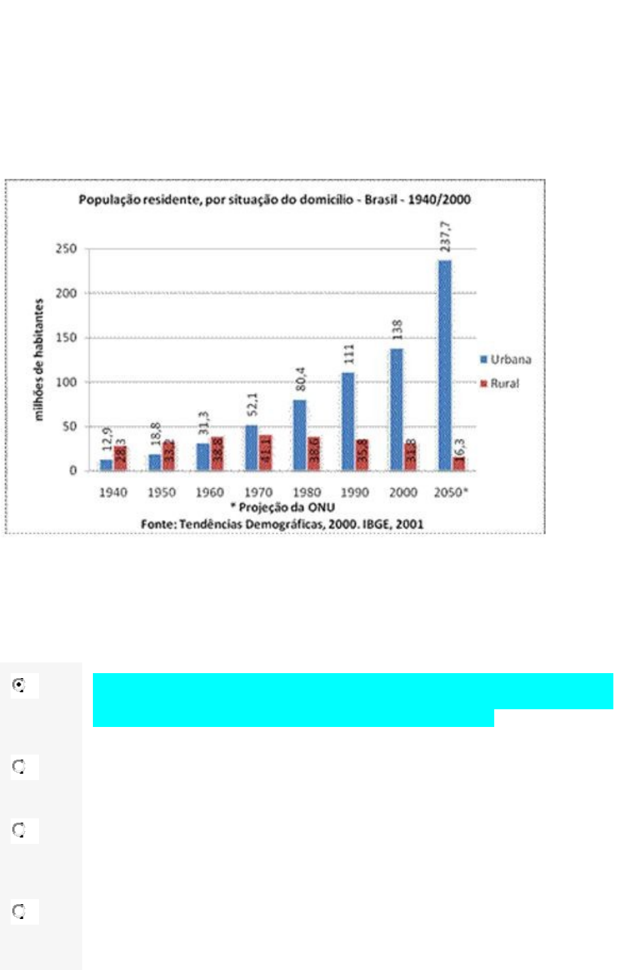 Questão 1/5 - GEOGRAFIA II Considere a seguinte citação: " Somente na segunda metade do século 20, o Brasil tornou-se um país urbano, ou seja, mais de 50% de sua população passou a residir nas cidades. A partir da década de 1950, o processo de urbanização no Brasil tornou-se cada vez mais acelerado. Isso se deve, sobretudo, à intensificação do processo de industrialização brasileiro ocorrido a partir de 1956, sendo esta a principal consequência, entre uma série de outras, da ‘política desenvolvimentista’ do governo Juscelino Kubitschek.” Após esta avaliação, caso queira ler o texto integralmente, ele está disponível em: <https://educacao.uol.com.br/disciplinas/geografia/urbanizacao-do-brasil-consequencias-e-caracteristicas-das-cidades.htm> Acesso em: 25 out. 2018. De acordo com a citação anterior e os conteúdos abordados no livro–base Geografia: EJA – Ensino Médio sobre urbanização brasileira, leia as alternativas que seguem. Na sequência, assinale a alternativa que apresenta a assertiva correta: A A urbanização no Brasil inicia em 1940 e vai se intensificando até a década de 1980 em função do processo de industrialização e da demanda por mão de obra barata nas fábricas e na construção civil. B O processo de urbanização no Brasil só foi possível em função da abertura política na década de 1990. C Com a promulgação da Consolidação das Leis do Trabalho (CLT) e da modernização da agricultura, houve um movimento populacional da cidade em direção ao campo. D Com o movimento populacional das cidades em direção ao campo, o Governo Federal aprovou a criação de regiões metropolitanas para reduzir os bolsões de pobreza nas áreas rurais. E A política desenvolvimentista movimentou o campo aumentando o agronegócio e por consequência a concentração da população em áreas rurais devido ao aumento dos postos de trabalho. uestão 2/5 - GEOGRAFIA II Leia a seguinte passagem: "A estreita relação entre clima e vegetação evidencia-se pela coincidência entre zonas climáticas e biomas. A variação do clima no espaço geográfico e no tempo é determinada em grande medida pela variação da intensidade da radiação solar". Após esta avaliação, caso queira ler o texto integralmente, ele está disponível em: < http://ecoqua.ecologia.ufrgs.br/arquivos/Reprints&Manuscripts/Manuscripts&Misc/6_Clima_95Nov07.pdf>. Acesso em 26 abr. 2017. De acordo com os conteúdos abordados no livro–base Geografia: EJA – Ensino Médio sobre a vegetação do Brasil, analise as assertivas a seguir. Na sequência, marque V para as assertivas verdadeiras e F para as falsas: I. (F ) A caatinga pode ser classificada como floresta ombrófila densa. II. ( F) A araucária angustifólia é originária de climas quentes. III.(V ) A floresta amazônica é também conhecida domo Hyloea brasiliensis. IV. (V ) A mata de araucária passou por grande devastação e existe apenas 2% de sua área original. A F – F – V – V B V – F – V – V C F – V – V – F D F – F – F – V E V – F – V – F Questão 3/5 - GEOGRAFIA II Considere a seguinte passagem: "As estruturas originais da placa tectônica sul-americana se formaram durante a Era pré-Cambriana – que corresponde aos primeiros 4 bilhões de anos da história do planeta – e estão associadas às primeiras massas continentais, cuja configuração não tinha nada em comum com a disposição das terras emersas". Após esta avaliação, caso queira ler o texto integralmente, ele está disponível em: <http://docente.ifrn.edu.br/jordanacosta/disciplinas/geografia-2-2.8401.2m/estrutura-geologica-do-brasil/view>. Acesso em 25 abr. 2017. De acordo com os conteúdos abordados no livro–base Geografia: EJA – Ensino Médio sobre relevo do Brasil, analise as assertivas a seguir. Na sequência, marque V para as assertivas verdadeiras e F para as falsas: I. (F ) O Brasil está entre os países que mais sofrem com o tectonismo. II. (F ) O relevo brasileiro é formado, principalmente, por planaltos muito altos. III.(V ) Os agentes externos são os principais modeladores do relevo brasileiro. IV. (V ) O pico da Neblina, com 2.994 m, é o ponto mais alto. Agora, assinale a alternativa que apresenta a sequência correta: A V – F – V – V B F – F – V – V C F – V – V – V D F – F – V – F E F – F – F – V Questão 4/5 - GEOGRAFIA II Área do conhecimento: Ciências humanas e suas tecnologias. Conteúdo: População. "O envelhecimento populacional é, hoje, um proeminente fenômeno mundial. Isto significa um crescimento mais elevado da população idosa com relação aos demais grupos etários". Após esta avaliação, caso queira ler o texto integralmente, ele está disponível em: < https http://www.ipea.gov.br/agencia/images/stories/PDFs/TDs/td_0858.pdf>. Acesso em 1 maio 2017. De acordo com os conteúdos abordados no livro-base Geografia: EJA – Ensino Médio sobre o crescimento e a transição demográfica no Brasil, analise as seguintes assertivas: I. A vinda dos imigrantes para o Brasil foi o principal motivo para o crescimento populacional no Brasil. II. No final da década de 1980 e começo da década de 1990, pode-se perceber uma alteração da dinâmica populacional brasileira, em função dos processos de industrialização e de urbanização. III. Ao observarmos a pirâmide etária do Brasil, é possível percebermos um aumento da população jovem. IV. A diminuição da taxa de natalidade pode também ser atribuída à entrada da mulher no mercado de trabalho e ao uso de métodos contraceptivos. São corretas as assertivas: A I e II. B II e III. C II e IV. D III e IV. E I, III e IV. Questão 5/5 - GEOGRAFIA II Área do conhecimento: Ciências humanas e suas tecnologias. Conteúdo: Formações herbáceas. Leia o excerto de texto a seguir: "OS DOMÍNIOS DE NATUREZA: POTENCIALIDADES PAISAGÍSTICAS” escrita pelo professor Aziz Nacib Ab’Sáber é estruturada
