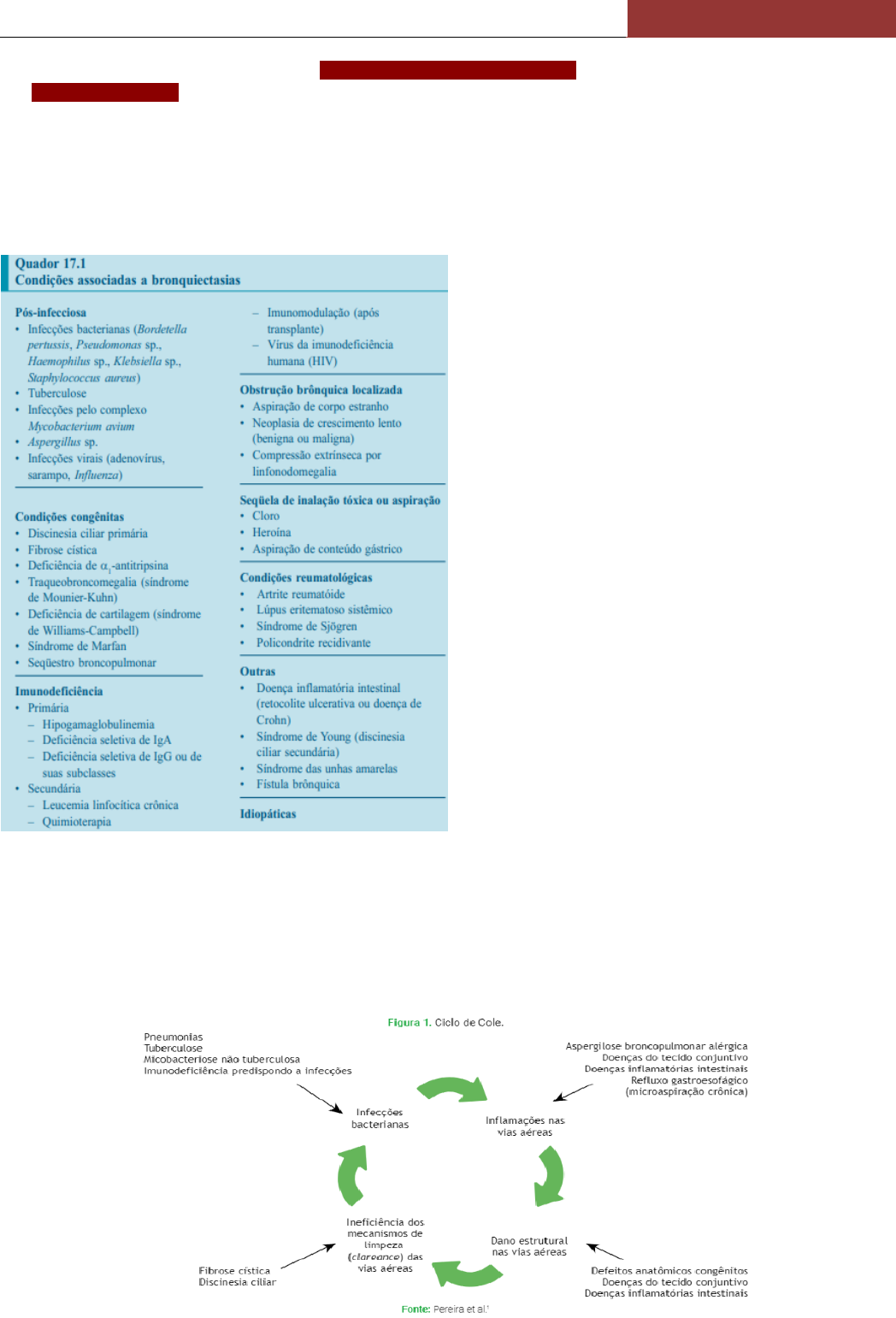 [GABRIELA BARBOSA] Turma 74 –Medicina Unimontes AMBULATÓRIO PNEUMO – ANA TERESA BRONQUIECTASIA - É a dilatação anormal e irreversível dos brônquios, devido à destruição dos componentes elástico e muscular de suas paredes; - Representa o estágio avançado de diversos processos patológicos não sendo uma doença por si; - Apresenta progressiva diminuição da sua incidência, devido à redução das bronquiectasias de origem pós-infecciosa, a partir da introdução da antibioticoterapia – atualmente a maioria das bronquiectasias são associadas a doenças sistêmicas nos países desenvolvidos; - Epidemiologia – atinge 350 a 500 mil adultos nos Estados Unidos, com provável prevalência elevada no Brasil – mortalidade de 0,2/100 mil habitantes no Brasil; 1. ETIOPATOGENIA - A bronquiectasias são a via final comum a várias doenças respiratórias e sistêmicas, como as infecções respiratórias graves da infância, fibrose cística, síndrome de Marfan (herança autossômica dominante – dilatação da aorta ascendente + aracnodactilia + gene recurvatum + ectopia lentis + iridodonese + doença pulmonar cística + ectasia dural), imunodeficiência primária ou secundária, LES, síndrome de Sjogren (doença autoimune inflamatória sistêmica – xerostomia + xeroftalmia), entre outras; - Etiologias para Bronquiectasias Congênitas: discinesia ciliar primária (doença hereditária), síndrome de Young (doença com herança autossômica recessiva - infecções respiratórias frequentes + infertilidade masculina, devido à obstrução do epidídimo por malformação congênita), deficiência de alfa-1-antitripsina, imunodeficiências primárias, defeitos anatômicos da árvore brônquica e fibrose cística (aumento da viscosidade da secreção respiratória + infertilidade masculina + cloro no suor); - Etiologias para Bronquiectasias Adquiridas: pós-infecciosas (principal causa), doenças obstrutivas crônicas e localizadas, doenças sistêmicas auto-imunes, hipersensibilidade mediada, pneumonite inflamatória, imunodeficiências secundárias e defeitos anatômicos da árvore brônquica; - Condições raramente associadas à bronquiectasias: doenças do colágeno (artrite reumatoide, Sjogren, doença mista); doenças inflamatórias intestinais (retocolite ulcerativa, Crohn); refluxo gastroesofágico/aspiração crônica/disfagia; bronquiolite após TMO ou outro Tx; risco para imunodeficiência secundária (neoplasias, quimio ou radioterapia); síndrome unhas amarelas (unhas amarelas + linfedema + derrame pleural); amiloidose; - Outras etiologias específicas: síndrome de Kartagener (doença autossômica recessiva rara – pansinusite crônica + bronquiectasia + situs inversus com dextrocardia), síndrome de Williams-Campbell (deficiência da cartilagem brônquica), síndrome de Mounier- Kuhn/traqueobroncomegalia (dilatação da traqueia e brônquios + diverticulose traqueal + bronquiectasias + infecções respiratórias) - Mecanismos patogênicos mais importantes: infecção, obstrução das vias respiratórias e fibrose peribrônquica – podem agir isoladamente ou se sobrepor; **a infecção sempre estará presente em algum momento da evolução da doença, podendo ser considerada causa ou efeito da bronquiectasia** - A dilatação anormal dos brônquios e bronquíolos resulta de um círculo vicioso (ciclo vicioso de Cole) que envolve infecção transmural, inflamação e liberação de mediadores inflamatórios; [GABRIELA BARBOSA] Turma 74 –Medicina Unimontes - Ciclo Vicioso de Cole e Wilson: (1 – infecção inicial) insulto ambiental associada a uma predisposição genética do paciente; (2 – inflamação crônica) ocorre o recrutamento de neutrófilos e linfócitos T, que secretam as enzimas elastases, colagenases, ademais os macrófagos e as células epiteliais das vias aéreas liberam substâncias químicas como interleucina-8, fator de necrose tumoral e prostanóides, desse modo o resultado final da inflamação é a hipertrofia de glândulas calicinais, hipertrofia de glândulas mucosas, aumento de secreção e destruição das camadas elástica e muscular da parede brônquica, gerando a dilatação e a distorção brônquica; (3 – clearance mucociliar prejudicado) depuração/limpeza brônquica prejudicada, com acúmulo de muco; (4 – obstrução por hipersecreção de muco) a pressão mecânica do muco na parede brônquica leva ao edema local, aumento da pressão endobrônquica e necrose da mucosa; (5 – colonização microbiana) ocorre infecção por Haemophilus influenza, Pseudomonas Aeruginosa, Staphylococcus aureus, indicando pior prognóstico; (6 – dilatação brônquica e obstrução da via aérea) o processo inflamatório e a maior atividade das enzimas proteolíticas geram a dilatação e destruição da parede brônquica, favorecendo a repetição do ciclo; - Alterações Macroscópicas – as vias aéreas envolvidas por bronquiectasias se tornam dilatadas, tortuosas, flácidas e parcialmente obstruídas por secreções purulentas, sendo que a longa duração do processo obstrutivo pode ocasionar a substituição das pequenas vias aéreas por processo fibrótico acelular – as vias aéreas periféricas podem estar inflamadas e preenchidas por secreções decorrentes da obstrução mais proximal; - Alterações Microscópicas - parte das vias aéreas tornam-se espessas por edema e células inflamatórias, enquanto outras áreas de mucosa apresentam erosões, úlceras e formação de abscesso – pode ocorrer metaplasia escamosa, devido à inflamação persistente, broncomalacia, hipertrofia muscular e intensa neovascularização de artérias brônquicas; - O processo inflamatório da bronquiectasia envolve primariamente as vias aéreas, porém as pneumonias recorrentes podem comprometer o parênquima pulmonar com inflamação, edema, fibrose e distorção da arquitetura alveolar; 2. QUADRO CLÍNICO - Os sintomas presentes nos pacientes