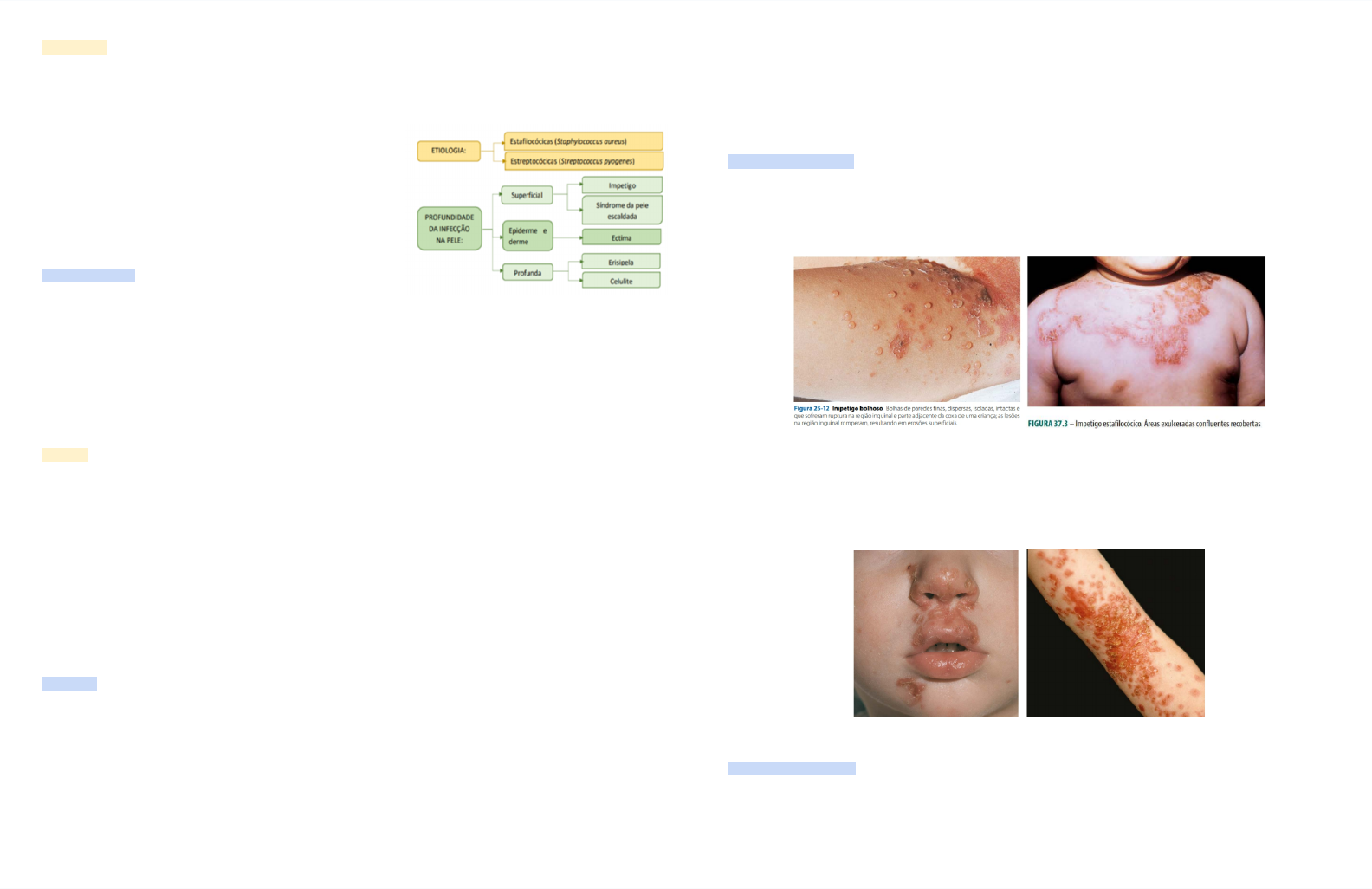 Júlia Demuner - MED XXIX Piodermites - Sampaião, cap. 37 e Fitzpatrick, cap. 25 A pele é normalmente habitada por bactérias que podem ser classificadas como residentes , isto é, bactérias que têm a pele como hábitat e nela se multiplicam, e transitórias , que nela se alojam ocasionalmente. A flora cutânea habita a camada córnea ou no folículo pilossebáceo , sendo que essas últimas não são atingidas por antissépticos ou desinfetantes e servem para recompor a flora bacteriana normal. As bactérias gram‐positiva s, como Staphylococci coagulase‐negativos, Staphylococcus aureus, corinebactérias e propionibactérias , são os organismos mais comumente encontrados na superfície da pele. Além disso, Clostridium perfringens e os fungos Candida e Malassezia são também encontrados na superfície da pele, principalmente em áreas úmidas. Barreira Cutânea Existem vários mecanismos de defesa da pele a infecções: - as características mecânicas da camada córnea , dificultam a penetração das bactérias depositadas em sua superfície. - o baixo pH (5,5) da pele também é considerado mecanismo defensivo, embora muitas bactérias patogênicas sejam capazes de multiplicar-se em pH baixos. - presença de substâncias constituintes da secreção sebácea como ácidos graxos insaturados, que são dotados de propriedades antibacterianas. - peptídeos antimicrobianos na superfície cutânea produzidos pelos queratinócitos que, além de ação antibacteriana direta, são ativadores potentes da resposta imune. Impetigo O impetigo é dermatose infecciosa por estafilococos plasmo-coagulase positivos e, ocasionalmente, por estreptococos hemolíticos . Há duas formas, uma com bolhas (impetigo bolhoso) e outras com vesicocrostas (impetigo não bolhoso): - Bolhoso: os responsáveis são os estafilococos , principalmente o Staphylococcus aureus , ocorrendo inicialmente colonização da mucosa nasal e, a partir desta, há contaminação da pele, com surgimento das lesões cutâneas. - Não-Bolhoso: os responsáveis são misturas de estafilococos e estreptococos do grupo A , principalmente o Streptococcus pyogenes . Com relação ao impetigo estreptocócico, verifica-se a colonização da pele previamente ao aparecimento das lesões cutâneas, que são favorecidas por solução de continuidade por picadas de insetos ou outros traumas . Após a introdução desses germes na pele, pode, eventualmente, ocorrer disseminação para o trato respiratório. Patogenia O impetigo apresenta como porta de entrada o local de colonização por S. aureus, as narinas , uma infecção secundária de soluções de continuidade mínimas na epiderme (impetiginização), dermatoses preexistentes e outras infecções , como eczema herpético ou feridas. A colonização da pele pelos estreptococos e estafilococos se faz através da ligação entre os ácidos teicoicos da parede celular das bactérias com a fibronectina da pele . Na pele intacta a fibronectina não está exposta , mas com rupturas da barreira cutânea há possibilidade da ligação entre essas moléculas e os ácidos teicoicos, produzindo-se colonização da pele por bactérias. 43 Júlia Demuner - MED XXIX A infecção por impetigo é contagiosa , particularmente em crianças, e a falta de higiene costuma ser fator predisponente. Condições de imunossupressão como infecção pelo HIV, pós-transplantes, diabetes, quimioterapia, hemodiálise, radioterapia ou corticoterapia prolongada são favorecedores das piodermites em geral, inclusive de impetigo, sendo que formas recorrentes de impetigo podem ocorrer em indivíduos com deficiência de IgA, IgM ou IgG . O impetigo não bolhoso é a forma mais comum e mais contagiosa, sendo neste tipo de impetigo que se encontram com mais frequência estafilococos resistentes à meticilina. Manifestações Clínicas Bolhoso No impetigo estafilocócico, predominam lesões vesicobolhosas flácidas . Bolhas superficiais contendo líquido ligeiramente turvo ou amarelo transparente com halo eritematoso que surge na pele de aspecto normal. É frequente que se observem áreas com as bolhas recentemente rotas , revelando erosões rasas e úmidas. Não Bolhoso No impetigo não bolhoso, a lesão inicial é mácula eritematosa que logo se transforma em vesicopápula ou mesmo bolha purulenta, bastante superficial, por isso mesmo, de duração efêmera. O conteúdo seroso ou seropurulento pelo dessecamento forma crosta melicérica (erosões com crostas cor de mel ), característica do impetigo. É comum o aparecimento de lesões satélites que podem permanecer isoladas ou coalescer, sendo mais comuns em áreas expostas, particularmente na face especialmente nas áreas perinasal e perioral e extremidades , mas qualquer área corpórea pode ser atingida. Fig.1: Erosões eritematosas e crostosas que se tornam confluentes no nariz, na região malar, nos lábios e no mento. Fig.2: Erosões crostosas e eritematosas que se tornam confluentes na fossa antecubital. Diagnose e Tratamento O diagnóstico é, em geral, clínico. Em casos especiais, pode ser feito exame bacterioscópico e culturas para identificação do agente causal. Como diagnóstico diferencial tem-se as micoses superficiais e herpes simples. Para o tratamento, medidas essenciais são a limpeza e a remoção das crostas com água morna e sabão, seguida da aplicação de pomada ou creme de antibiótico. 44 Júlia Demuner - MED XXIX Ectima Tem algumas semelhanças com o impetigo, a partir do qual, pode iniciar-se, sendo causado principalmente por estreptococos, predominantemente o S. pyogenes . A lesão inicial, fugaz, é uma vesícula ou vesicopústula que, estendendo-se mais profundamente ao romper-se, deixa uma ulceração . As crostas formam-se precocemente e são secas, duras e aderentes. As crianças e pessoas em situação de rua são as mais sujeitas e a localização mais frequente é nas pernas , mas também coxas e nádegas podem ser afetadas. Hábito