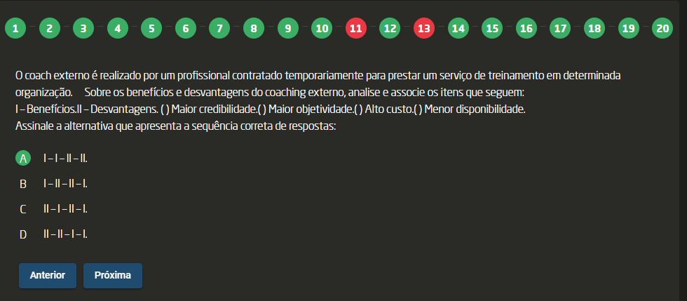O coaching externo é realizado por um profissional contratado temporariamente para prestar um serviço de treinamento em determinada organização. Sobre os benefícios e desvantagens do coaching externo, analise e associe os itens que seguem: Assinale a alternativa que apresenta a sequência correta de respostas: I. Benefícios. II. Desvantagens. ( ) Maior credibilidade. ( ) Maior disponibilidade. ( ) Menor disponibilidade. A B D