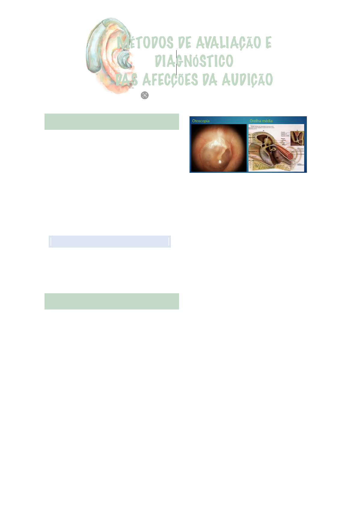IMPORTÂNCIA DO TEMA Alta prevalência no nosso meio Impacto social/ psicológico / econômico Possibilidade de prevenção e diagnóstico precoce Tratamento e reabilitação precoce Comprometimento do aprendizado, da vida do dia a dia. Comprometimento intelectual. Ouvir é essencial para o desenvolvimento intelectual. PREVALÊNCIA 1:1000 em nascidos vivos 3-6:1000 em RN de alto risco 20-40:1000 em RN em UTI neonatal ANATOMIA Orelha externa – rolha de cerume; mais comum Orelha média – catarro espesso parado dentro da orelha média, que deveria ser removido pelo movimento muco ciliar; vai da tuba auditiva em direção a orelha média; secreção impactada Orelha interna – a mais comum é o envelhecimento, presbacusia; diabético com perda coclear; tratar com aparelho de amplificação sonora *AASI – aparelho de amplificação sonora individual; corrige pouco; aparelho auditivo; melhora um pouco a audição Processo lateral do cabo do martelo sempre aponta para frente; triangulo luminoso Secreção pode estar na orelha média (secundaria a otite média secretora), pode ter rolha de cerume na externa ou alteração coclear Por que nós temos orelha média? Para o som que se propagava no ar passe para o sólido e em seguida para o líquido -> adaptação para os animais que saíram do meio aquático Do solido para o líquido a propagação de som é muito boa Além disso, concentra a energia. A área da membrana timpânica é 25x maior do que a da janela oval, então você concentra a energia. Disjunção de cadeia ossicular – soltar a bigorna do estribo -> o som não chega na cóclea – perda da condução do som A orelha média propaga o som por meio sólido (ossículos) para a orelha interna (líquido) IMPORTANCIA DO TEMA ANATOMIA O som chega no tímpano -> a membrana vibra -> condução pelos ossículos -> deslocamento do líquido -> audição TOPODIAGNÓSTICO Condução – externa e média Neurossensorial – interna; presbacusia e síndrome de Meniere Central – SNC -> tumor no lobo temporal Síndrome de Meniere – acometimento auditivo secundário ao diabetes; sensorial porque a cóclea é um órgão sensorial -> ela transforma a energia mecânica em elétrica Doença neural que causa perda auditiva -> tumor na bainha de mielina; esclerose múltipla; neuropatia auditiva... TIPOS DE PERDAS AUDITIVAS CONDUÇÃO Orelha externa Orelha média SENSORIAL/ NEURAL Cóclea Nervo auditivo MISTA Dois componentes Otorreia Externa ou média + interna Secreção de orelha média saindo pela externa -> otorreia catarral – perfuração da membrana timpânica -> a secreção da orelha média saindo pela externa -> pinga um aminoglicosídeo -> lesão nas células cocleares CLASSIFICAÇÃO CLÍNICA A distância que você consegue conversar com a pessoa, auxilia a classificar clinicamente o grau da perda *obs. ele não detalhou muito a tabela AUDIOGRAMA Cresce para baixo – porque a perda vai descendo no gráfico -> normal na porção superior TOPODIAGNOSTICO CLASSIFICACAO CLINICA AUDIOGRAMA BATERIA AUDIOLOGICA BÁSICA Audiometria tonal (via aérea e óssea) Audiometria vocal (SRT e IRF) Imitanciometria Essas três são muito importantes – precisamos conhecer OUTROS EXAMES Otoemissões acústicas BERA Eletrococleografia Audiometria de alta frequência TPAC (Testes do Processamento Auditivo Central) AUDIOMETRIA TONAL Audiometria tonal limiar Logoaudiometria Imitanciometria Curvas timpanométricas Reflexo estapediano Exame subjetivo que exige atenção do paciente Começa com uma intensidade maior e vai diminuindo; mudar o intervalo de tempo que muda a frequência para não condicionar a resposta Ele testa o mínimo que o paciente ouve COMO É FEITO Apresentando-se sons são através de fones e de um vibrador em contato com crânio Quando o examinador percebe o som deve apertar um botão ou repetir a palavra que lhe é apresentada Bolinha – direito Concha – via aérea (fone de ouvido) Via óssea – seta (vibrador ósseo que vai emitir som diretamente para a cóclea, sem necessidade de orelha média) Normal -> corte normal = 20 AUDIOLOGICA Perda condutiva Perda sensório neural Perda mista AUDIOMETRIA VOCAL (SRT E IRF) Palavras monossilábicas balanceadas Ouve uma coisa e entende outra -> deficiência na discriminação vocal – ouve, mas não compreende Som de alerta x Discriminação sonora *o aparelho consegue melhorar o som de alerta, mas não melhora a discriminação sonora Palavras monossilábicas retiradas da nossa língua e balanceadas foneticamente. Se você acertar todas = 100% São 25 palavras e cada erro equivale a 4% A cada erro perde 4% Prever se o aparelho vai ajudar na conversação ou se será apenas para som de alerta Se a discriminação for boa (>80%), o aparelho irá ajudar na conversação Aparelho de amplificação sonora -> não auxilia na discriminação sonora!! Ajuda em sons de alerta IMITANCIOMETRIA Paciente não responde nada Sonda dentro da orelha e ela vai gerar uma pressão que vai medir a resistência do sistema Como resposta 5 curvas Pressão x complacência A – curva normal; a membrana timpânica vai e volta -> é complacente B – a membrana não se movimentou adequadamente; secreção na orelha média, por isso ela não conseguiu se movimentar corretamente por conta da secreção presente na orelha média C – pico negativo; membrana timpânica retraída; disfunção tubaria; retração da MT; hiperplasia adenoidiana AD – disjunção de cadeia ossicular; pancada e o ramo longo do estribo dissociar da bigorna e a membrana não terá nada segurando, grande amplitude da membrana; pico alto AS – rígido; doença autossômica dominante; mais comum em mulheres brancas de origem mediterrânea; osteosclerose -> estribo preso/ calcificado Audiometria -> diagnóstico anatômico Diagnóstico etiológico da perda condutiva Tem que saber o formato OTOEMISSÕES ACÚSTICAS Lei que obriga a realização do exame em maternidades e hospitais Você ouve a c