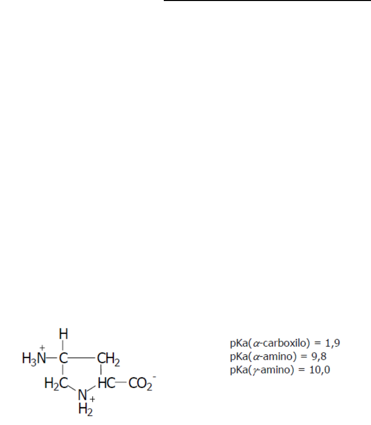 Estudo dirigido- Bioquímica Estrutura l Pesquise e responda: 01. Coloque “verdadeiro” ou “falso” justificando cada sentença: a) Só a pH muito baixo ou muito alto é que a forma não ionizada de um dado aminoácido predomina; b) A leucina é mais polar do que a alanina; c) A um valor de pH superior ao valor de pKa de um grupo ionizável mais de metade desses grupos estão ionizados; d) O ponto isoelétrico do tripeptídeo Lis-Lis-Lis é maior do que qualquer dos valores de pKa dos resíduos individuais (Lisina). e) Há rotação livre em torno de uma ligação peptídica. 02 A partir do colágeno isolado da cauda do canguru obteve-se uma prolina substituída chamada de aminoprolina- ainda não caracterizada. A partir das curvas de titulação determinaram-se os pKa dos grupos ionizáveis (mostradp abaixo): a) Indique todas as formas ionizadas deste aminoácido; b) Calcule o ponto isoelétrico deste aminoácido; c) Calcule a carga deste aminoácido a pH 2,5 e diga qual a direção de migração deste aminoácido quando sujeito a um campo elétrico. 03. Uma solução-tampão tem a capacidade de resistir a modificações do pH frente à adição de quantidades limitadas de ácido ou de base. Sobre os tampões, é incorreto: a) os tampões são formados por um ácido fraco e sua base conjugada ou por uma base fraca e seu ácido conjugado; b) quando se adiciona um ácido forte ao tampão, o ácido fornece íons H3O+ que reagem com a base conjugada; c) a capacidade de tamponamento de um tampão independe das quantidades de ácido e de base conjugados na solução; d) a equação de Henderson-Hasselbalch relaciona o pH de uma solução-tampão às diferentes concentrações do ácido conjugado e da base conjugada; e) o bicarbonato é o principal tampão do organismo humano, neutralizando alterações de pH provenientes do metabolismo. 04. Como são classificadas as estruturas das proteínas e quais as suas características. 05. Considere a curva de titulação da histidina e responda às questões que se seguem: Dados os pKs: pK1 = 1,82 ;pK2= 9,17 e pKR = 6,0 4.1 Indique quais as espécies presentes em cada um dos patamares (zona tamponante). b) Diga como poderia determinar, a partir da curva de titulação, o valor de pKa de cada um dos grupos ionizáveis da histidina. c) Qual é o ponto isoelétrico da histidina?Justifique. 06. Sobre as proteínas assinale V para setenças verdadeiras e F para as falsas. Justifique as incorretas, segundo seu julgamento. a) ( ) as proteínas se diferenciam pela ordem, tipo e número de aminoácido; b) ( ) a hemoglobina é formada por quatro cadeias polipeptídicas e quatro grupos prostéticos heme, no qual o zinco se encontra no estado reduzido; c) ( ) a estrutura terciária é uma conformação tridimensional resultante do enovelamento global da cadeia polipeptídica; d) ( ) a estrutura primária é definida pela sequência de aminoácidos unidos por ligações peptídicas e pela localização das pontes dissulfeto; e) ( ) os dois arranjos locais mais comuns nas proteínas são a alfa-hélice e a beta-folha; f) ( ) A mudança na cor e textura dos ovos após fritura decorre da desnaturação de proteínas; g) ( ) Podemos afirmar que há perda da estrutura tridimensional da proteína, que invariavelmente leva a perda da função, geralmente alterando as estruturas secundária, terciária e quaternária da proteína; h) ( ) os solventes orgânicos atuam primariamente rompendo as ligações hidrofóbicas que mantém estável o núcleo das proteínas globulares; i) ( ) a sequência de aminoácidos da estrutura primária de uma proteína é mantida duarante a desnaturação desta; j) ( ) a desnaturação sempre será um processo irreversível; l) ( ) algumas proteínas quando desnaturadas se tornam insolúveis e precipitam. 07. Um polipeptídeo com uma carga positiva líquida em pH fisiológico (~ 7.4) provavelmente contém aminoácidos com grupos R de que tipo? Por quê? 08. Desenhe a estrutura dos aminoácidos (segundo a classifiação do Lehninger):: a) Os Aromáticos: b) Básicos: c) Alifáticos: d) Ácidos 09. A cadeia lateral do aminoácido lisina (Lys) possui um grupo amino ( --NH+2) em sua extremidade enquanto que a cadeia lateral do ácido glutâmico (Glu) possui uma carboxila (-COOH). Polipeptídios formados apenas por lisina (poli-Lys) ou apenas por ácido glutâmico (poli-Glu) não apresentam estrutura secundária em pH neutro, mas a poli-Lys adota a estrutura de -hélice em pH suficientemente básico. Explique o por que?. Você esperaria o mesmo comportamento do poli-Glu? Por que? 10. Qual o valor de pH que se obtém quando se adiciona 50 ml de hidróxido de sódio (NaOH) 0,1 M em 100 ml de ácido (CH3COOH) acético 0,1 M? A constante de dissociação (ka) do ácido acético é de 1,74 x 10-5. É dado a equação de Henderson-Hasselbalch : (15 esc) 11. Um tampão constituído de 0,12mol de NH4OH e 0,09mol de NH4+ foi preparado para obter 500ml de solução. Qual o pH desse tampão ? Dado Kb = 1,8.10-5 (1,0 pto). 12. Responda às seguintes questões com “verdadeiro” ou “falso”, justificandodo-as. a) Só a pH muito baixo ou muito alto é que a forma não ionizada de um dado aminoácido predomina; b) A leucina é mais polar do que a alanina; c) A um valor de pH superior ao valor de pKa de um grupo ionizável mais de metade desses grupos estão ionizados; d) Há rotação livre em torno de uma ligação peptídica.
