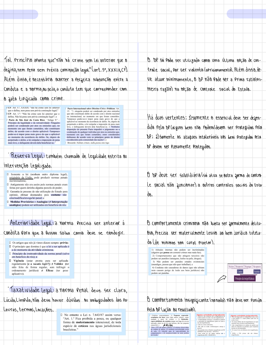 Princípios do Direito Penal Princípios do Direito Penal Princípio da legalidade: Princípio da intervenção mínima: Princípio da fragmentariedade: Princípio da subsidiariedade: Princípio da ofensividade: Princípio da insignificância: Tal Principio aponto que"não hácrime sem lei anterior que o & DP só pode ser utilizado como uma última opção de con- definz,nem pena sem prévia cominação legal"(art. 5o, XXXIX, CF. trole social, por ser violento laprisionamento). Além disso, de Além disso, é necessário ocorrer a perfeitasubsunção entre a ve atuar minimamente, o DP nE0 pode ser a prima ratiolpri- conduto e a norma,ou seja, aconduto tem que corresponder com meire ragão) no opção de controle social do Estado. O fato tipificado como crime. Há duas vertentes: somente o essencial deve ser defen- dido pelo DP (alguns bens não podemdevem ser protegidos pela DP; 2) somente os ataques intoleráveis dos bens protegidos pelo DP devem ser plenamente protegidos. Reserva Legal: também chamado de legalidade estrita ou intervenção legalizada. O DP deve ser subsidiário (só atua se outra forma de contro Le social não funcionar a outros controles sociais do Esta- dO. Anterioridade legal: a norma precisa ser anterior j O comportamento criminoso não basta ser formalmente delitu- conduta para que o pessos saiba como deve se condugir. 850, Precisa ser materialmente lesivo do bem juridico tuteld- do (de minimas no curat practor). E Taxstividade legal: a norma Penal deve ser dara, Lúcida, Limpido, não deve haver dúvidas ou ambiguidades das pe-O comportamento insignificante (nonadal não deve ser punido Loures, termos,Locuções. pelo DP (2,50 OU resultadol. D Mi RA