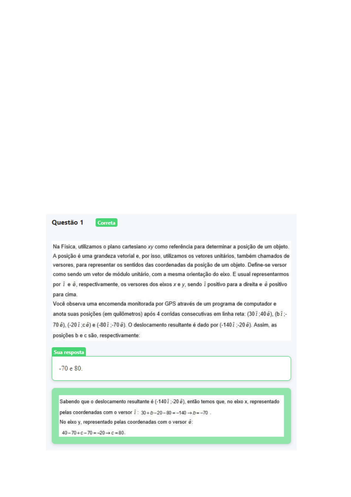Disciplina: Física Geral e Experimental: Mecânica Na Física, utilizamos o plano cartesiano xy como referência para determinar a posição de um objeto. A posição é uma grandeza vetorial e, por isso, utilizamos os vetores unitários, também chamados de versores, para representar os sentidos das coordenadas da posição de um objeto. Define-se versor como sendo um vetor de módulo unitário, com a mesma orientação do eixo. É usual representarmos por i e é, respectivamente, os versores dos eixos x e y, sendo i positivo para a direita e é positivo para cima. Você observa uma encomenda monitorada por GPS através de um programa de computador e anota suas posições (em quilómetros) após 4 corridas consecutivas em linha reta: (30i;40o). (b i; 706). (-201,co) e (-801-706). O deslocamento resultante é dado por (-1401i-206). Assim, as posições b e c são, respectivamente: Resposta -70 e 80. Sabendo que o deslocamento resultante é (-1402-206), então temos que, no eixo x, representado pelas coordenadas com o versor i 30+b-20-80-140-b--70. No eixo y, representado pelas coordenadas com o versor: 40-70+c-70--20-c-80