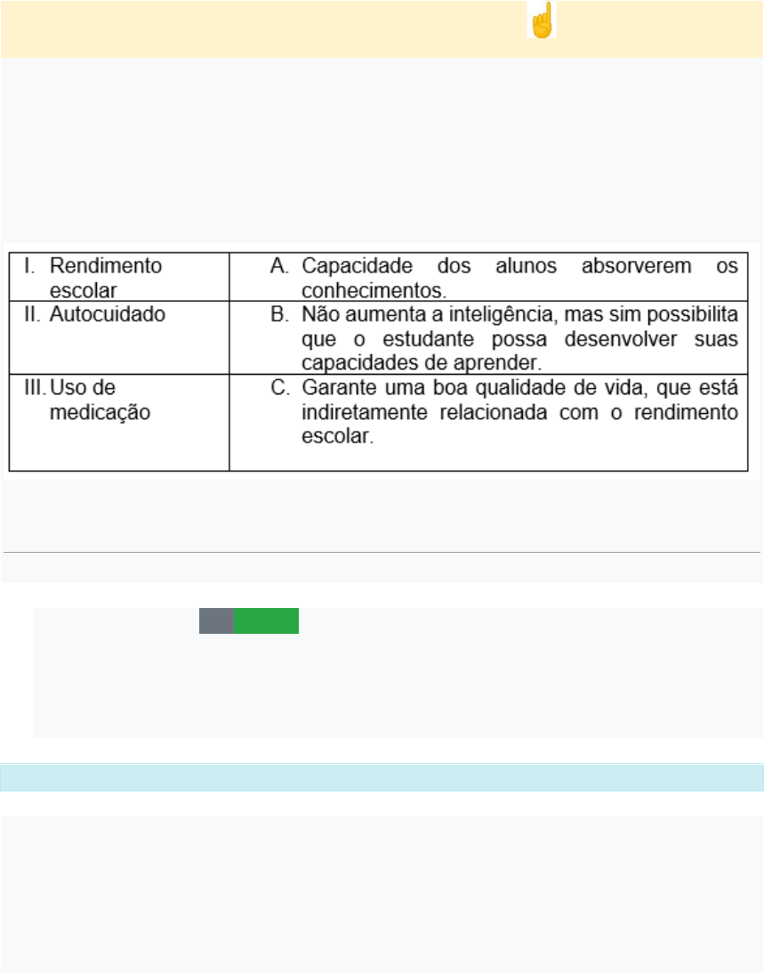 NÃO ESQUEÇA DE CURTIR O MATERIAL, DÊ UM LIK Distúrbios de aprendizagem: neurofarmacologia e terapias complementares e alternativas. RESPOSTA: I-A; II-C; III-B. 7) Leia e associe as duas colunas. Assinale a alternativa que traz a associação correta entre as duas colunas: Alternativas: • I-A; II-C; III-B. checkCORRETO • I-B; II-A; III-C. • I-C; II-B; III-A. • I-C; II-A; III-B. • I-A; II-B; III-C. Resolução comentada: A asserção I do rendimento escolar associa-se com a afirmativa A. Capacidade dos alunos absorverem os conhecimentos. A asserção II de autocuidado associa-se com a afirmativa C. Garante uma boa qualidade de vida, que está indiretamente relacionado com o rendimento escolar. A asserção III associa-se com a afirmativa B. Não aumenta a inteligência, mas sim possibilita que o estudante possa desenvolver suas capacidades de aprender.