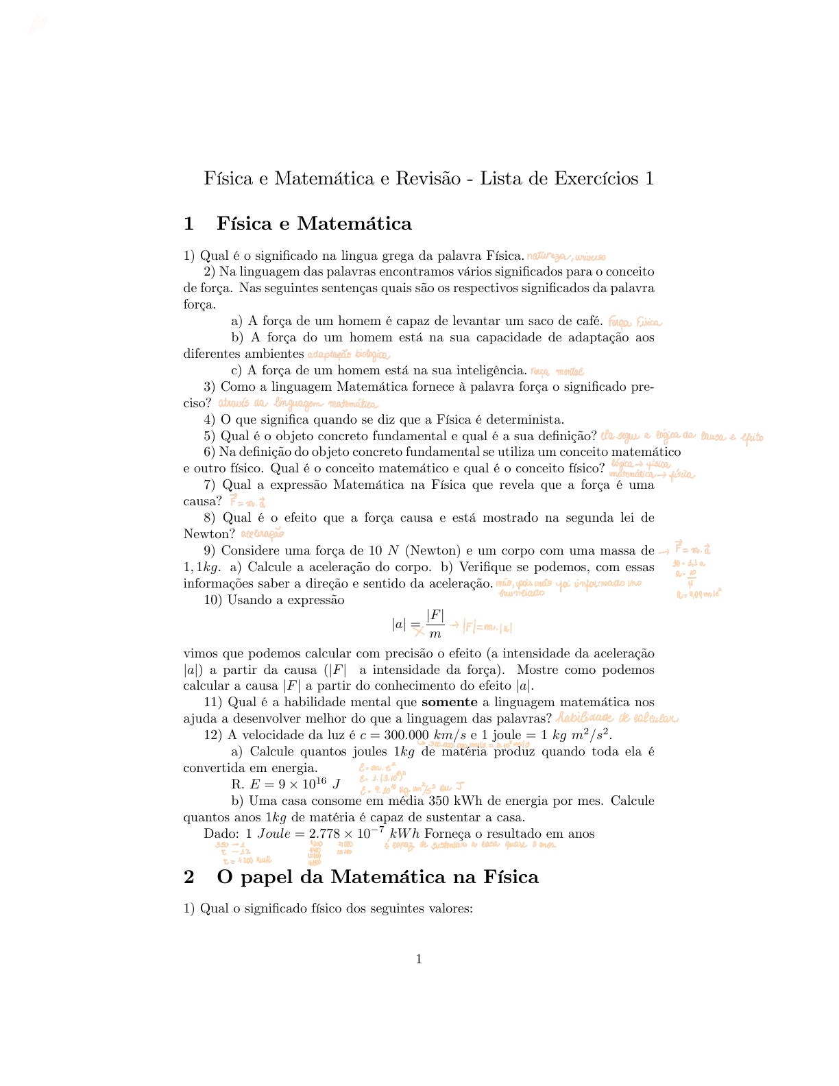 FÌsica e Matem·tica e Revis„o - Lista de ExercÌcios 1 1 FÌsica e Matem·tica 1) Qual È o signiÖcado na lingua grega da palavra FÌsica. 2) Na linguagem das palavras encontramos v·rios signiÖcados para o conceito de forÁa. Nas seguintes sentenÁas quais s„o os respectivos signiÖcados da palavra forÁa. a) A forÁa de um homem È capaz de levantar um saco de cafÈ. b) A forÁa do um homem est· na sua capacidade de adaptaÁ„o aos diferentes ambientes c) A forÁa de um homem est· na sua inteligÍncia. 3) Como a linguagem Matem·tica fornece ‡ palavra forÁa o signiÖcado pre- ciso? 4) O que signiÖca quando se diz que a FÌsica È determinista. 5) Qual È o objeto concreto fundamental e qual È a sua deÖniÁ„o? 6) Na deÖniÁ„o do objeto concreto fundamental se utiliza um conceito matem·tico e outro fÌsico. Qual È o conceito matem·tico e qual È o conceito fÌsico? 7) Qual a express„o Matem·tica na FÌsica que revela que a forÁa È uma causa? 8) Qual È o efeito que a forÁa causa e est· mostrado na segunda lei de Newton? 9) Considere uma forÁa de 10 N (Newton) e um corpo com uma massa de 1; 1kg. a) Calcule a aceleraÁ„o do corpo. b) VeriÖque se podemos, com essas informaÁıes saber a direÁ„o e sentido da aceleraÁ„o. 10) Usando a express„o jaj = jF j m vimos que podemos calcular com precis„o o efeito (a intensidade da aceleraÁ„o jaj) a partir da causa (jF j a intensidade da forÁa). Mostre como podemos calcular a causa jF j a partir do conhecimento do efeito jaj. 11) Qual È a habilidade mental que somente a linguagem matem·tica nos ajuda a desenvolver melhor do que a linguagem das palavras? 12) A velocidade da luz È c = 300:000 km=s e 1 joule = 1 kg m2=s2. a) Calcule quantos joules 1kg de matÈria produz quando toda ela È convertida em energia. R. E = 9 1016 J b) Uma casa consome em mÈdia 350 kWh de energia por mes. Calcule quantos anos 1kg de matÈria È capaz de sustentar a casa. Dado: 1 Joule = 2:778 107 kWh ForneÁa o resultado em anos 2 O papel da Matem·tica na FÌsica 1) Qual o signiÖcado fÌsico dos seguintes valores: 1 a) 20 kgms2 b) 9; 8 c) 9; 8 m=s 2 2) IdentiÖque o signiÖcado fÌsico dos seguintes produtos: a) produto entre 5; 2 m=s por 30 s b) produto entre 10 kg e 9; 8 m=s2 3) A funÁ„o de primeiro grau tambÈm pode ser usada para descrever o com- portamento da velocidade da seguinte forma: v (t) = gt onde t signiÖca o tempo e g È a aceleraÁ„o da gravidade. Essa express„o descreve a velocidade de um corpo em queda livre. O eixo vertical est· apontado para cima. O que signiÖca a ausÍncia do termo de massa nessa express„o? Analise a quest„o usando dois corpos com massas m1 e m2 tal que m1 > m2. 4) Considere a seguinte funÁ„o y (x) dada por: y (x) = y0 + cx: (1) qual o signiÖcado matem·ticos dos seguintes termos nessa express„o: a) y0, b) c 5) A seguinte funÁ„o de primeiro grau È usada para descrever a evoluÁ„o temporal da posiÁ„o s de um corpo: s (t) = s0 + vt: (2) nessa express„o s0 e v s„o constantes. a) Descreva os signiÖcados matem·ticos dos termos s (t), s0; v e t. b) Descreva os signiÖcados fÌsicos dos termos s (t), s0; v e t. 6) Considere o seguinte gr·Öco 3.532.521.510.50 10 9 8 7 6 5 4 3 2 1 0 s s(t) s s(t) 2 No eixo vertical temos as posiÁıes s (t) e no eixo horizontal temos os instantes t. Qual das retas representa um movimento com velocidade maior? Explique por que? 7) A seguinte funÁ„o de segundo grau È usada para descrever a evoluÁ„o temporal da posiÁ„o s de um corpo: s (t) = at2: (3) a) Descreva os signiÖcados matem·ticos dos termos s (t), a; e t. b) Descreva os signiÖcados fÌsicos dos termos s (t), a e t. 8) Considere o seguinte gr·Öco da posiÁ„o s (t) em funÁ„o do instante t: 52.50-2.5-5 75 62.5 50 37.5 25 12.5 0 x y x y Qual das duas curvas indica um movimento com aceleraÁ„o maior? Por que? 3 9) Considere o seguinte gr·Öco de um movimento na horizontal s (t) 32.521.510.50 4 3 2 1 0 t s(t) t s(t) a) descreve o movimento entre os instantes t = 0s e t = 2s 10) Considere um corpo cujo deslocamento È descrito por: s (t) = 4t2 2t (4) encontre os instantes em que o corpo passa pela origem s = 0. resposta: t = 0s e t = 1s 11) Seja dados dois corpos denotados por A e B. As sentenÁas matem·ticas que descrevem os seus deslocamentos s„o: sA (t) = 3t 2; sB = 1 2 t (5) Determine os valÙres dos instantes t em que os corpos se encontram. 13) Dois carros A e B tem suas posiÁıes descritas por: sA (t) = 2 + 7t; e sB = 2 + 4t+ 2t 2 a) Encontre os instantes em que eles tem a mesma posiÁ„o. b) Determine as posiÁıes em que eles se encontram Res. PosiÁ„o 1 sA (t) = sB (t) = 2m; PosiÁ„o 2: Sa (1:5) = 14:5m 14) Aplique o MÈtodo EmpÌrico para se construir a express„o da intensidade da forÁa de arrasto de um áuÌdo dado por: F = bv 4 onde v È a velocidade de um corpo (barco) e b È uma constante de propor- cionalidade cujo valor depende das caracterÌsticas do meio. Para se perceber a dependÍncia com a intensidade da velocidade faÁa isso no mar, piscina ou lagoa e observe a forÁa que fazemos quando andamos dentro dí‡gua e quando corremos. Em qual situaÁ„o fazemos mais forÁa? 15) SimpliÖque a express„o: f (x) = 4x2 + 28x+ 49 4x2 49 16) Encontre as raÌzes das seguintes funÁıes quadr·ticas. a) f (x) = 9x2 12x+ 4 b) f (x) = 25x2 60x+ 36 c) f (x) = 16x2 48x+ 36 d) f (x) = 16x2 72x+ 81 17)SimpliÖque a funÁ„o: f (x) = 6x225x+14 para f (x) = (2x 7) (3x 2) Res.f (x) = 6x24x21x+14 = 2x (3x 2)7 (3x 2) = (2x 7) (3x 2) 18) SimpliÖque a funÁ„o: f (x) = 6x2+17x14 para f (x) = (3x 2) (2x+ 7) 19) SimpliÖque a funÁ„o: f (x) = 6x217x14 para f (x) = (2x 7) (3x+ 2) 20) SimpliÖque a funÁ„o: f (x) = 24x2+37x+14 para f (x) = (8x+ 7) (3x+ 2) 21) SimpliÖque a funÁ„o: f (x) = 24x2+5x14 para f (x) = (8x+ 7) (3x 2) 22) SimpliÖque a funÁ„o: f (t) = 6t 214t40 3t+5 para f (t) = 2 (t 4) (3t+ 5) 2 (t 4) = 6t2 14t 40 23) Um corp