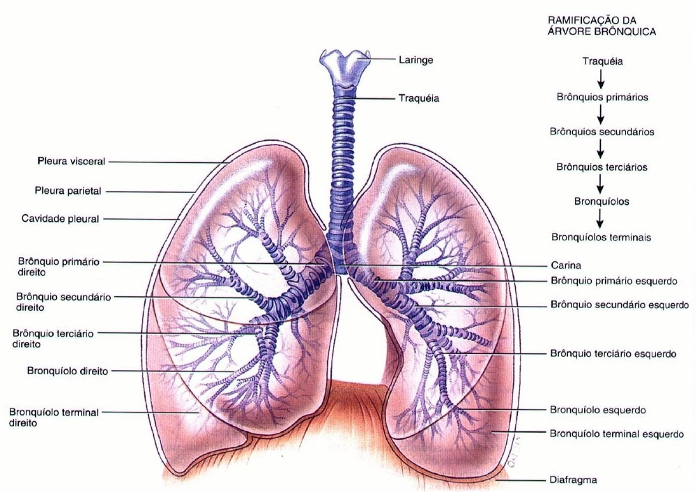 26 SISTEMA RESPIRATÓRIO O sistema respiratório, constituído pelos pulmões e por uma sequência de vias aéreas que conduz ao ambiente externo, atua no fornecimento do oxigênio (O2) e na eliminação do dióxido de carbono (CO2) das células do corpo. A realização deste objetivo requer o cumprimento dos quatro eventos abaixo, conhecidos como respiração: (1) Movimento do ar para dentro e para fora dos pulmões (respiração ou ventilação) (2) Entrada do O2 do ar alveolar para o sangue e de CO2 do sangue para o ar alveolar (respiração externa). (3) Transporte de O2 para as células. (4) Troca do CO2 por O2 nas proximidades das células (respiração interna). (5) Transporte de CO2 para os pulmões. Os eventos (1) e (2) ocorrem dentro do sistema respiratório, enquanto os eventos (3) e (5) são realizados pelo sistema circulatório. Já o evento (4) ocorre nos tecidos por todo o corpo. O sistema respiratório é subdividido em dois componentes: a porção condutora e a porção respiratória. A porção condutora, situada dentro e fora dos pulmões, conduz o ar do ambiente externo para os pulmões. A porção respiratória, localizada estritamente dentro dos pulmões, realiza a verdadeira troca do oxigênio por dióxido de carbono (respiração externa). PORÇÃO CONDUTORA DO SISTEMA RESPIRATÓRIO A porção condutora do sistema respiratório, listada em ordem a partir do exterior para dentro dos pulmões, é composta de cavidade nasal, nasofaringe, faringe, laringe, traqueia, brônquios primários, brônquios secundários (brônquios lobares), brônquios terciários (brônquios segmentares), bronquíolos e bronquíolos terminais. Estas estruturas não somente transportam, mas também filtram, umedecem e aquecem o ar inspirado antes de ele alcançar a porção respiratória dos pulmões. Observe a parte condutora do sistema respiratório na figura a seguir. A abertura do lúmen das vias aéreas condutoras é mantida por uma combinação de tecido ósseo, cartilagem e tecido conjuntivo. À medida que o ar progride ao longo da via aérea durante a inspiração, ele encontra um sistema ramificado de túbulos. Embora o diâmetro de cada túbulo continue a se estreitar após 27 cada ramificação, o diâmetro transversal total dos vários ramos aumenta. Como resultado, a velocidade do fluxo de ar durante a inspiração diminui à medida que o ar progride em direção à porção respiratória. Cavidade Nasal A cavidade nasal é dividida em metades direita e esquerda pelo septo nasal, que apresenta cartilagem e tecido ósseo em sua sustentação. Cada metade da cavidade nasal é limitada lateralmente por uma parede óssea e por peças de cartilagens nasais. Cada uma dessas metades se comunica com o meio externo, anteriormente, através da narina e com a nasofaringe por meio da coana. Na porção posterior encontram-se três delgadas prateleiras ósseas semelhantes a rolos, situadas umas sobre as outras: são as conchas nasais superior, média e inferior. Porção Anterior da Cavidade Nasal A porção anterior da cavidade nasal, nas imediações das narinas, é dilatada e conhecida como vestíbulo. Esta região é revestida por pele e possui pelos curtos e rígidos que impedem a entrada de grandes partículas de poeira para a cavidade nasal. Porção Posterior da Cavidade Nasal A porção posterior da cavidade nasal é revestida por uma mucosa com um epitélio pseudoestratificado cilíndrico ciliado, frequentemente chamado de epitélio respiratório, o qual possui várias células caliciformes. O tecido conjuntivo (lâmina própria) é ricamente vascularizado, especialmente na região das conchas nasais. A lâmina própria apresenta muitas glândulas seromucosas e abundantes componentes linfoides que protegem a mucosa nasal contra antígenos inalados e contra a invasão de micróbios. O teto da cavidade nasal é recoberto por uma mucosa olfatória, a qual apresenta um epitélio olfatório que contém neurônios bipolares responsáveis pelo olfato. Axônios desses neurônios atravessam a placa crivosa do osso etmoide em direção ao encéfalo. O epitélio olfatório é responsável pela percepção de odores, o que também contribui de forma significativa para a discriminação do paladar. A mucosa nasal, constantemente umedecida, filtra o ar inalado. Substâncias particuladas, como poeira, são retidas pelo muco produzido pelas células caliciformes do epitélio e pelas glândulas seromucosas da lâmina própria. À medida que os cílios se movem, o muco vai sendo deslocado. Substâncias particuladas capturadas no muco são assim direcionadas, pelo movimento ciliar, à faringe, para serem deglutidas ou expectoradas. Antígenos e alergenos trazidos pelo ar são combatidos por elementos linfoides da lâmina própria. Anticorpos produzidos por plasmócitos pode ativar mastócitos e basófilos iniciando a liberação de vários mediadores da inflamação que, atuando na mucosa nasal, induz os sintomas associados a resfriados e à rinite alérgica. Seios Paranasais Os ossos etmoide, esfenoide, frontal e maxilar possuem grandes espaços revestidos por mucoperiósteo, denominados seios paranasais, os quais se comunicam com a cavidade nasal. A mucosa de cada seio compreende um epitélio respiratório e uma lâmina própria de tecido conjuntivo frouxo vascularizado, fundida ao periósteo, daí o termo mucoperiósteo. A delgada lâmina própria é semelhante àquela da cavidade nasal, na qual existem glândulas seromucosas e elementos linfoides. O epitélio respiratório de revestimento dos seios paranasais, semelhante ao da cavidade nasal, apresenta numerosas células cilíndricas ciliadas, cujos cílios movimentam a camada de muco em direção à cavidade nasal. Faringe A faringe se inicia nas coanas e se estende até a abertura da laringe. Esta cavidade contínua é subdividida em três regiões: (1) a nasofaringe, em posição superior, (2) a orofaringe, em posição intermediária e (3) a l