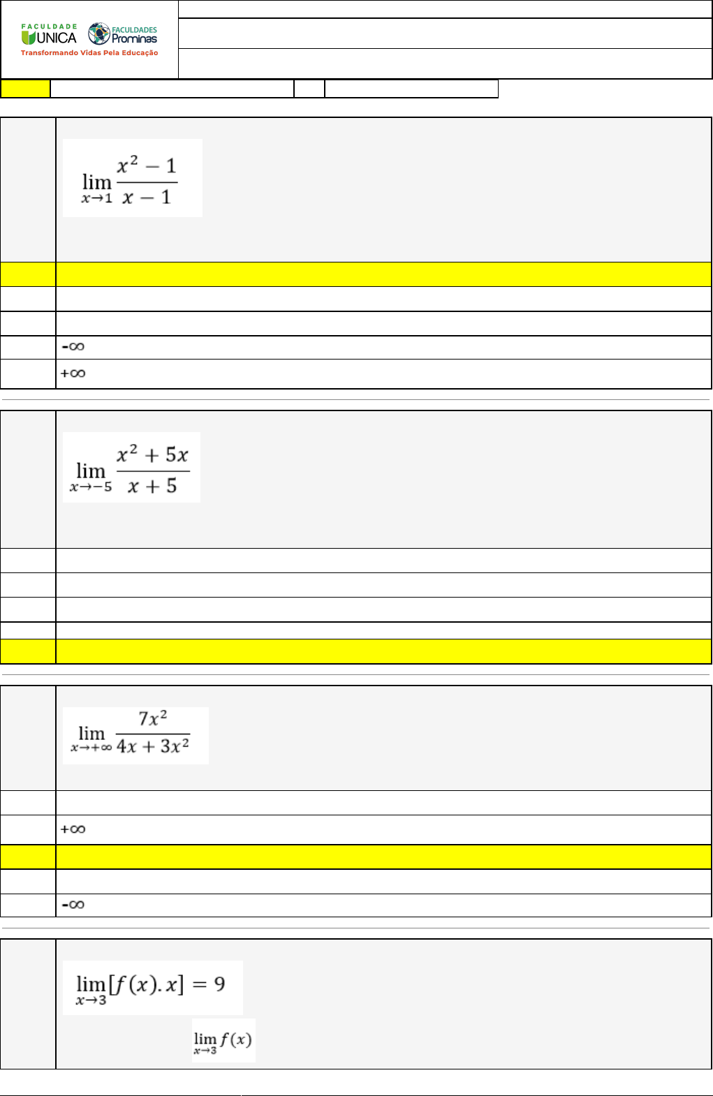 04/04/2023 16:32:27 1/3 REVISÃO DE SIMULADO Nome: STÉFANE MARTINS DE OLIVEIRA Disciplina: Cálculo Diferencial e Integral I e II Respostas corretas são marcadas em amarelo X Respostas marcardas por você. Questão 001 Analise o limite abaixo. O resultado desse limite é: (Sugestão: fatore o numerador antes de calcular o limite) X A) 2 B) 0 C) 1 D) E) Questão 002 Analise o limite abaixo. O resultado desse limite é: (Sugestão: fatore o numerador antes de calcular o limite) X A) 1 B) 5 C) 2 D) 0 E) -5 Questão 003 Analise o limite abaixo. O resultado desse limite é: X A) 0 B) C) 7/3 D) 7/4 E) Questão 004 Analise o limite abaixo. Então o resultado é: 04/04/2023 16:32:27 2/3 X A) 2 B) 3 C) 0 D) E) Questão 005 Analise o limite abaixo. Então o resultado é: X A) B) 5 C) 11 D) 0 E) Questão 006 Analise o limite abaixo. O resultado desse limite é: (Sugestão: fatore o numerador antes de calcular o limite) X A) -5 B) 0 C) 1 D) 5 E) 2 Questão 007 Analise o limite abaixo. O resultado desse limite é: X A) B) 7/3 C) 7/4 D) E) 0 Questão 008 Analise o limite abaixo. O resultado desse limite é: 04/04/2023 16:32:27 3/3 X A) 1 B) C) D) 0 E) -1