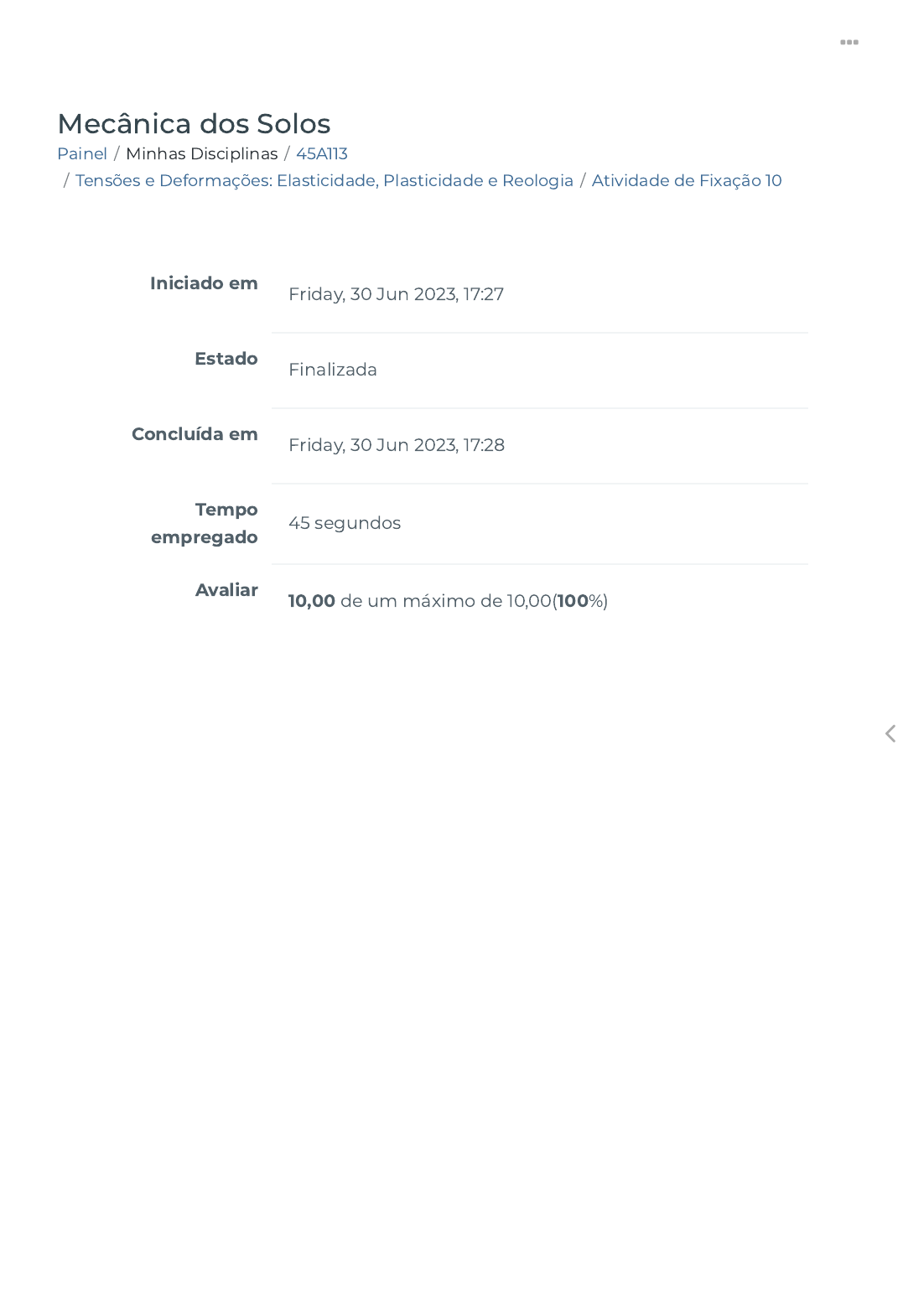 Painel / Minhas Disciplinas / 45A113 / Tensões e Deformações: Elasticidade, Plasticidade e Reologia / Atividade de Fixação 10 Mecânica dos Solos Iniciado em Friday, 30 Jun 2023, 17:27 Estado Finalizada Concluída em Friday, 30 Jun 2023, 17:28 Tempo empregado 45 segundos Avaliar 10,00 de um máximo de 10,00(100%) https://ava.politecnicabr.com.br/my/ https://ava.politecnicabr.com.br/course/view.php?id=1071 https://ava.politecnicabr.com.br/course/view.php?id=1071#section-12 https://ava.politecnicabr.com.br/mod/quiz/view.php?id=32861 https://ava.politecnicabr.com.br/ Questão 1 Correto Atingiu 2,00 de 2,00 Critério supõe que a tensão de cisalhamento τ = τr, correspondente à ruptura do material ou ao início do seu comportamento inelástico, é função de uma combinação crítica de tensões normais e tangenciais. Escolha uma opção: a. Critério de Kármán b. Critério de Saint-Venant c. Critério de Mohr d. Critério de Ruptura https://ava.politecnicabr.com.br/ Questão 2 Correto Atingiu 1,50 de 1,50 O material em que nenhuma força (salvo a sua inércia) se opõe à sua deformação e que é, portanto, dotado de total mobilidade denomina-se líquido perfeito ou líquido de Pascal. Todos os materiais reais estão compreendidos entre estes dois extremos: o sólido perfeito e o líquido perfeito. Escolha uma opção: Questão 3 Correto Atingiu 1,50 de 1,50 As tensões normais ocasionam uma compressão das camadas (variando o volume e afetando muito pouco a forma do maciço), sendo responsáveis pelos “recalques” (uniformes ou diferenciais) das estruturas; as tensões de cisalhamento produzem o escoamento plástico (com alteração da forma), podendo conduzir a “ruptura” do maciço, se vencida a resistência ao cisalhamento do material, numericamente obtida pela lei de Coulomb. Escolha uma opção: Verdadeiro Falso Verdadeiro Falso https://ava.politecnicabr.com.br/ Questão 4 Correto Atingiu 1,50 de 1,50 Podemos a�rmar que a teoria matemática da elasticidade fundamenta-se nos estudos, entre outros, de Cauchy, Navier, Lamé e Poisson, tendo suas equações fundamentais sido estabelecidas na década de 1820. Escolha uma opção: Questão 5 Correto Atingiu 1,50 de 1,50 A teoria da Plasticidade é a designação dada ao estudo matemático, com base experimental, das relações tensão- deformação dos corpos que sofrem deformações plásticas, isto é, deformações que permanecem mesmo quando cessadas as causas que as determinam. Escolha uma opção: Verdadeiro Falso Verdadeiro Falso https://ava.politecnicabr.com.br/ Questão 6 Correto Atingiu 2,00 de 2,00 Sabe-se que esse tensor é simétrico, pois entre as tensões tangenciais, escrevendo-se as equações de “equilíbrio de momentos”. Escolha uma opção: a. Tensor octaédrico b. Tensor molar c. Tensor das tensões d. Tensor principal Entre em Contato https://www.politecnicabr.com.br 0800 084 2627 0800 084 2627 Links Úteis Dicas da nossa Diretora Acadêmica Planner de Estudos Declaração de Matrícula Orientações do AVA Abertura de Ticket Fale com o Tutor Cronograma de Estudos Manual de Estágio Manual de Competência Siga-nos nas redes sociais https://www.politecnicabr.com.br/ https://soundcloud.com/user-501638417/sets/escola-politecnica-brasileira https://storage.googleapis.com/sirius-pubstore/semestre_plannerdeestudo%20poli.pdf https://storage.googleapis.com/sirius-pubstore/declaracao_matricula.pdf https://storage.googleapis.com/sirius-pubstore/orientacoes_ava.pdf https://storage.googleapis.com/sirius-pubstore/abertura_ticket.pdf https://storage.googleapis.com/sirius-pubstore/fale_com_tutor.pdf https://storage.googleapis.com/sirius-pubstore/cronograma_estudos.pdf https://storage.googleapis.com/sirius-pubstore/manual_estagio.pdf https://storage.googleapis.com/sirius-pubstore/manual_competencia.pdf https://ava.politecnicabr.com.br/ © 2022 - Escola Politécnica Brasileira https://ava.politecnicabr.com.br/mod/quiz/0 https://www.facebook.com/politecnicabr https://www.instagram.com/politecnicabr_oficial https://ava.politecnicabr.com.br/
