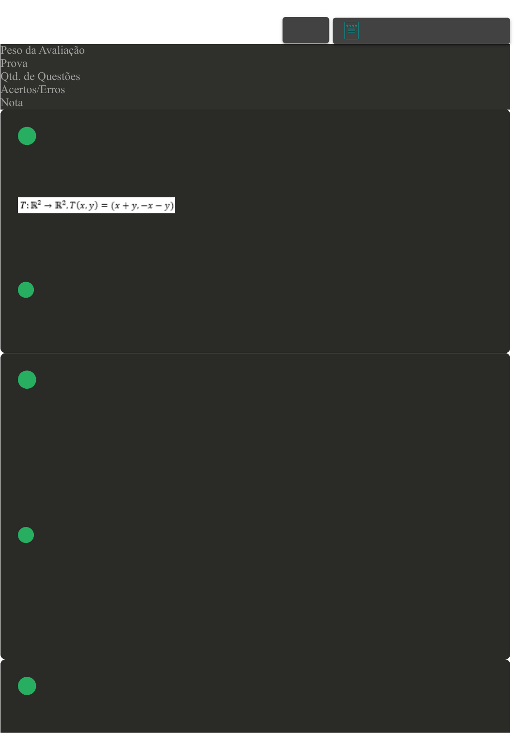 09/07/2023, 22:14 Avaliação II - Individual about:blank 1/4 Prova Impressa GABARITO | Avaliação II - Individual (Cod.:822888) Peso da Avaliação 1,50 Prova 66720568 Qtd. de Questões 10 Acertos/Erros 10/0 Nota 10,00 Durante o estudo das transformações lineares, verificamos os conceitos de núcleo e imagem de uma transformação. O núcleo de uma transformação linear é o subconjunto do domínio formado pelos vetores que são levados ao vetor nulo do contradomínio. Por sua vez, a imagem é o conjunto de vetores do contradomínio que são resultados da aplicação dos vetores do domínio na transformação. Baseado nisso, assinale alternativa CORRETA a respeito da transformação a seguir: A O vetor (2, 4) não pertence ao domínio da transformação. B O vetor (2,2) possui imagem (0,0). C O vetor (1,-1) pertence ao núcleo da transformação. D A transformação a seguir não é um operador linear. Em Matemática, uma transformação linear é um tipo particular de função entre dois espaços vetoriais que preserva as operações de adição vetorial e multiplicação por escalar. Uma transformação linear também pode ser chamada de aplicação linear ou mapa linear. A respeito das transformações lineares, analise as opções a seguir: I- T(x,y) = (x² , y²). II- T (x,y) = (2x, - x + y). III- T (x,y) = (- x + y, x - 1). IV- T (x,y) = (x, x - y). Assinale a alternativa CORRETA: A As opções II e IV estão corretas. B As opções I e III estão corretas. C Somente a opção IV está correta. D As opções III e IV estão corretas. Em matemática, o produto vetorial é uma operação binária sobre vetores em um espaço vetorial. Seu resultado difere do produto escalar por ser também um vetor, ao invés de um escalar. Seu principal uso baseia-se no fato de que o resultado de um produto vetorial é sempre perpendicular a VOLTAR A+ Alterar modo de visualização 1 2 3 09/07/2023, 22:14 Avaliação II - Individual about:blank 2/4 ambos os vetores originais. Quanto ao resultado do produto vetorial entre u = (1,-2,3) e v = (0,2,1), classifique V para as opções verdadeiras e F para as falsas: ( ) u x v = (0,-4,3). ( ) u x v = (-8,-1,2). ( ) u x v = (8,1,-2). ( ) u x v = (0,4,3). Assinale a alternativa que apresenta a sequência CORRETA: A F - F - F - V. B V - F - F - F. C F - V - F - F. D F - F - V - F. Dado um espaço vetorial V, há subconjuntos de V tais que eles próprios também são espaços vetoriais, só que menores. Esses subconjuntos são chamados de subespaços de V. Sobre o exposto, classifique V para as sentenças verdadeiras e F para as falsas: ( ) O conjunto dos números irracionais é um subespaço dos números reais. ( ) Um plano é um subespaço de R² ( ) Um ponto é um subespaço de R. ( ) Uma reta que passa na origem é um subespaço de R². Assinale a alternativa que apresenta a sequência CORRETA: A V - V - F - F. B F - V - V - F. C F - F - V - V. D V - F - F - V. A matriz a seguir permite que sejam calculados autovalores, a partir de uma Transformação Linear. Assinale a alternativa CORRETA que apresenta os autovalores desta matriz 2x2: A Os autovalores associados são 0 e 2. B Não há autovalores reais associados a essa Transformação Linear. C Os autovalores associados são 5 e 3. 4 5 09/07/2023, 22:14 Avaliação II - Individual about:blank 3/4 D Os autovalores associados são 1 e -1. Um conjunto de vetores é dito linearmente independente (frequentemente indicado por LI) quando nenhum elemento contido nele é gerado por uma combinação linear dos outros. Em contrapartida, naturalmente, um conjunto de vetores é dito linearmente dependente (LD) se pelo menos um de seus elementos é combinação linear dos outros. Baseado nisso, assinale a alternativa CORRETA que apresenta um conjunto de vetores LD: A {(2,1,-1),(0,0,1),(5,2,3)}. B {(1,0,0),(0,1,0),(0,0,1)}. C {(1,1,0),(1,0,1),(5,2,3)}. D {(1,1,0),(1,0,1),(0,0,3)}. Quando trabalhamos em geometria, analisar o comportamento de duas retas ou ainda como estas retas estão situadas no espaço é uma simples tarefa, pois basta fazer uma simples visualização. No entanto, quando falamos de retas na geometria analítica ou de vetores representados por coordenadas, determinar a posição dessas retas não é uma tarefa tão simples. Sobre o ângulo formado pelos pares de vetores apresentados, com relação aos ângulos agudos, analise as opções a seguir: I- u = (2, -3, -2) e v = (1, 2, -2). II- u = (4, -2, 3) e v = (0, 2, 1). III- u = (-2, -1, 2) e v = (2, 1, 3). IV- u = (0, 2, -1) e v = (-3, -2, -4). V- u = (-2, 2, 0) e v = (-1, 1, -3). Assinale a alternativa CORRETA: A Somente a opção II está correta. B As opções III e V estão corretas. C As opções I e IV estão corretas. D As opções I, III e IV estão corretas. As operações vetoriais existentes são a soma e a multiplicação por um escalar. Combinando estas operações, podemos realizar uma série de outros vetores que podem ser aplicados em diversas áreas. Sendo assim, dados os vetores u = (1, -2) e v = (3,-3), quanto à opção que apresenta o vetor resultante da operação w = u - 2v, classifique V para as opções verdadeiras e F para as falsas: ( ) w = (4,5). ( ) w = (-1,-1). ( ) w = (-5,4). ( ) w = (2,-1). 6 7 8 09/07/2023, 22:14 Avaliação II - Individual about:blank 4/4 Assinale a alternativa que apresenta a sequência CORRETA: A V - F - F - F. B F - F - V - F. C V - V - F - V. D F - V - F - F. Uma transformação linear é um tipo de função que opera vetores de diferentes espaços vetoriais. Em especial, para poder afirmar que uma transformação é linear, temos que verificar se ela preserva as operações de soma e multiplicação por um escalar. Baseado nisso, assinale a alternativa CORRETA que apresenta a imagem do vetor (-1, 2, 4) quando aplicado na transformação a seguir. A (-5, 2). B (-7, 2). C (-2, 7). D (7, -2). Quando trabalha-se com vetores do espaço vetorial R³, pode-se combinar o produto escalar com o produto 