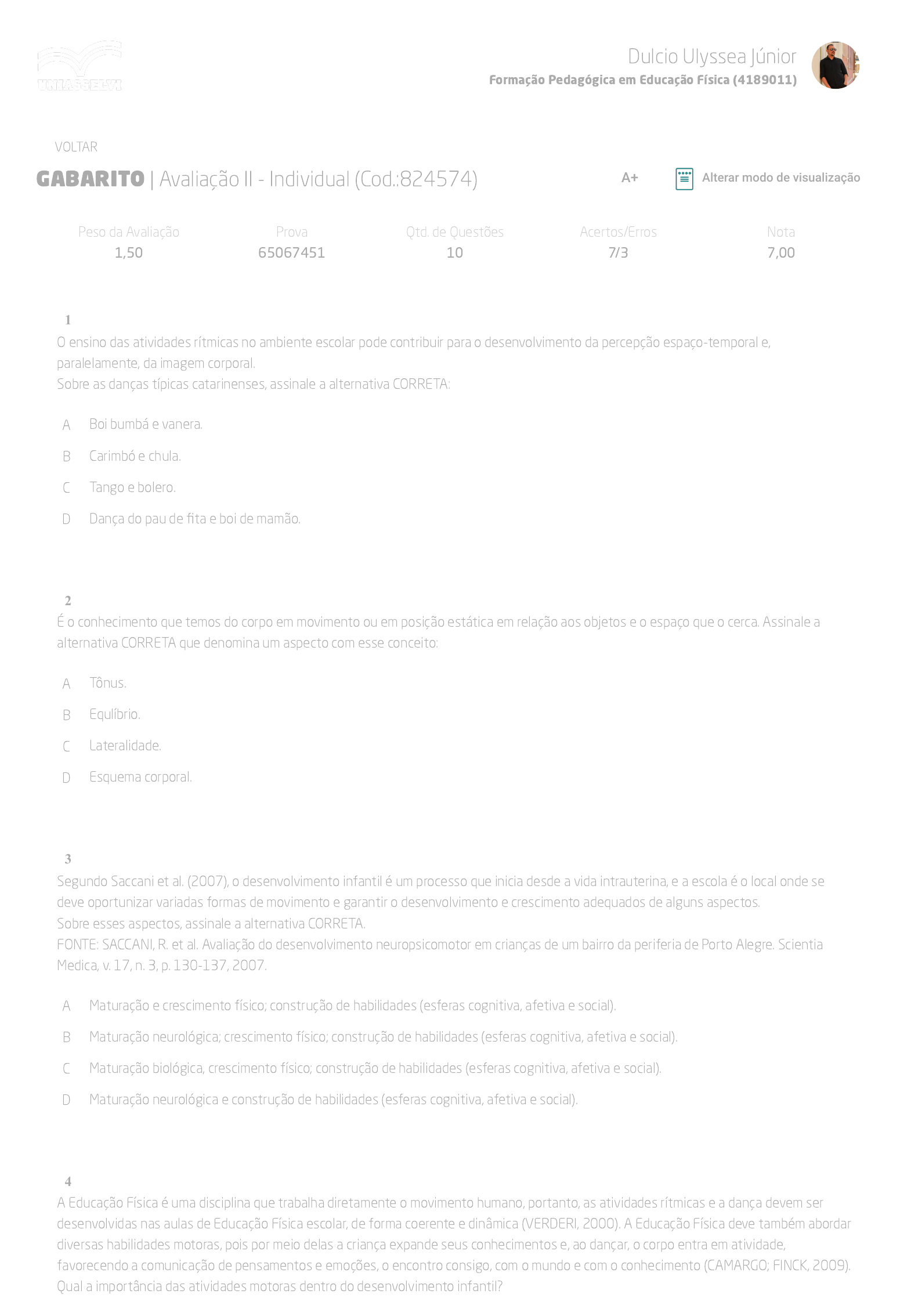 23/06/2023, 18:01 AVA https://ava2.uniasselvi.com.br/subject/grades-and-tests/answer-book/eyJ0ZXN0Ijp7InRlc3RDb2RlIjoiODI0NTc0IiwiZGVzY3JpcHRpb24iOiJBdmFsaWHDp8OjbyBJSSAtIEluZGl2aWR1YWwiLCJwYXJhbWV0ZXIiOjU0… 1/3 GABARITO | Avaliação II - Individual (Cod.:824574) Peso da Avaliação 1,50 Prova 65067451 Qtd. de Questões 10 Acertos/Erros 7/3 Nota 7,00 O ensino das atividades rítmicas no ambiente escolar pode contribuir para o desenvolvimento da percepção espaço-temporal e, paralelamente, da imagem corporal. Sobre as danças típicas catarinenses, assinale a alternativa CORRETA: A Boi bumbá e vanera. B Carimbó e chula. C Tango e bolero. D Dança do pau de fita e boi de mamão. É o conhecimento que temos do corpo em movimento ou em posição estática em relação aos objetos e o espaço que o cerca. Assinale a alternativa CORRETA que denomina um aspecto com esse conceito: A Tônus. B Equlíbrio. C Lateralidade. D Esquema corporal. Segundo Saccani et al. (2007), o desenvolvimento infantil é um processo que inicia desde a vida intrauterina, e a escola é o local onde se deve oportunizar variadas formas de movimento e garantir o desenvolvimento e crescimento adequados de alguns aspectos. Sobre esses aspectos, assinale a alternativa CORRETA. FONTE: SACCANI, R. et al. Avaliação do desenvolvimento neuropsicomotor em crianças de um bairro da periferia de Porto Alegre. Scientia Medica, v. 17, n. 3, p. 130-137, 2007. A Maturação e crescimento físico; construção de habilidades (esferas cognitiva, afetiva e social). B Maturação neurológica; crescimento físico; construção de habilidades (esferas cognitiva, afetiva e social). C Maturação biológica, crescimento físico; construção de habilidades (esferas cognitiva, afetiva e social). D Maturação neurológica e construção de habilidades (esferas cognitiva, afetiva e social). A Educação Física é uma disciplina que trabalha diretamente o movimento humano, portanto, as atividades rítmicas e a dança devem ser desenvolvidas nas aulas de Educação Física escolar, de forma coerente e dinâmica (VERDERI, 2000). A Educação Física deve também abordar diversas habilidades motoras, pois por meio delas a criança expande seus conhecimentos e, ao dançar, o corpo entra em atividade, favorecendo a comunicação de pensamentos e emoções, o encontro consigo, com o mundo e com o conhecimento (CAMARGO; FINCK, 2009). Qual a importância das atividades motoras dentro do desenvolvimento infantil? VOLTAR A+ Alterar modo de visualização 1 2 3 4 Dulcio Ulyssea Júnior Formação Pedagógica em Educação Física (4189011) 23/06/2023, 18:01 AVA https://ava2.uniasselvi.com.br/subject/grades-and-tests/answer-book/eyJ0ZXN0Ijp7InRlc3RDb2RlIjoiODI0NTc0IiwiZGVzY3JpcHRpb24iOiJBdmFsaWHDp8OjbyBJSSAtIEluZGl2aWR1YWwiLCJwYXJhbWV0ZXIiOjU0… 2/3 FONTE: VERDERI, É. B. L. P. Dança na escola. 2 ed, Rio de Janeiro: Sprint, 2000. CAMARGO, D.; FINCK, S. C. M. A dança inserida no contexto educacional e sua contribuição para o desenvolvimento infantil. InterMeio: revista do programa de Pós-graduação em Educação, v. 32, n. 32, p. 62-74, 2010. A Não basta a Educação Física ensinar regras de jogos, técnicas, aprender habilidades motoras e desenvolver capacidades físicas, devemos levar o aluno a descobrir motivos e sentidos nas práticas corporais. No desenvolvimento infantil, as atividades motoras assumem uma importância significativa nas relações interpessoais, se apresentando como intermédio entre saber, corpo e movimento. B A Educação Física deve ensinar regras de jogos, técnicas, aprender habilidades motoras e desenvolver capacidades físicas, devemos levar o aluno a obedecer aos professores. No desenvolvimento infantil, as atividades esportivas assumem uma importância significativa nas relações interpessoais. C Não basta a Educação Física ensinar regras de jogos, técnicas, aprender habilidades motoras e desenvolver capacidades físicas, devemos levar o aluno a obedecer aos professores. No desenvolvimento infantil, as atividades esportivas assumem uma importância significativa no treinamento dos esportes da escola. D A Educação Física deve se preocupar em ensinar regras de jogos e técnicas, desenvolvendo capacidades específicas ao desporto aprendido em sala de aula, devemos levar o aluno a obedecer aos professores. No desenvolvimento infantil, as atividades esportivas assumem uma importância significativa nas relações pessoais. As aulas de educação física são importantes em todos os seguimentos, pois ela promovem o desenvolvimento integral do aluno, a vida saudável, a socialização, o espírito de equipe e a prática do desporto. Sobre o exposto, avalie as asserções a seguir: I- A dança é importante para o desenvolvimento da criança, seja para falar, cantar ou brincar. PORQUE II- A criança possui o impulso inato de realizar movimentos similares aos da dança, sendo uma forma natural de expressão. Assinale a alternativa CORRETA: A As asserções I e II são proposições falsas. B A asserção I é uma proposição falsa, e a II é uma proposição verdadeira. C As asserções I e II são proposições verdadeiras, mas a II não é uma justificativa da I. D As asserções I e II são proposições verdadeiras, e a II é uma justificativa da I. Resgatando as relações entre Atividades Rítmicas, Dança e Expressão Corporal, diversos autores conceituam sobre expressão corporal, apresentando algumas definições. Sobre o exposto, assinale a alternativa CORRETA: A A expressão corporal é uma metodologia através da qual o ser humano expressa sensações, emoções, sentimentos e pensamentos com seu corpo, integrando-o, assim, as suas outras linguagens expressivas, como a fala, o desenho e a escrita. B A expressão corporal é uma linguagem através da qual o ser humano expressa sensações, emoções, sentimentos e pensamentos com seu corpo, não integrando-o, assim, as suas outras linguagens expre
