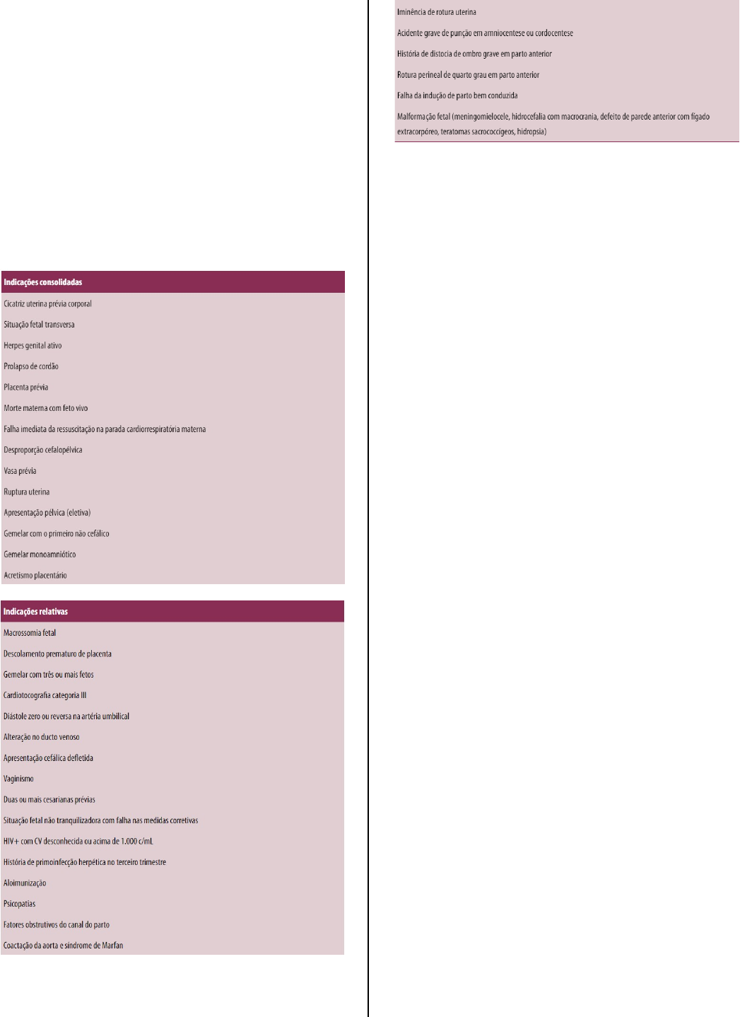 Cesárea A cesariana é realizada quando o médico assistente e/ou a paciente acreditam que a via abdominal vai proporcionar um melhor resultado materno e/ou fetal. Portanto, suas indicações se dividem na solicitação materna ou indicação médica. As indicações médicas são divididas em absolutas e relativas. Cada situação é discutida em seu capítulo específico. As indicações mais frequentes são a falha na progressão do trabalho de parto, os sinais de alteração na vitalidade fetal, as com cesarianas prévias e as posições fetais anômalas. 1. Distocia funcional ou falha na progressão do trabalho de parto O quadro geralmente se deve a falha das contrações uterinas, variações de posição fetal ou a uma desproporção cefalopélvica absoluta ou relativa, no entanto, a verdadeira causa nem sempre é identificada. Deve-se atuar nos fatores corrigíveis, antes de indicar a cesariana. 2. Má posição fetal Fetos cefálicos na posição occipital posterior (OP), transversa ou defletidas levam a maiores taxas de complicações perinatais e cesarianas. Especialmente quando a dilatação está completa, algumas más posições da cabeça fetal podem ser corrigidas, porém, ainda assim, muitas pacientes precisam de cesariana para o nascimento de seus conceptos. A apresentação córmica é uma indicação indiscutível da cesárea. Na apresentação pélvica, a cesariana eletiva apresenta um menor risco de mortalidade perinatal e neonatal ou morbidade grave em comparação com partos vaginais (1,6% vs. 5,0%, respectivamente). Contudo, não há evidências claras para adotar a cesariana sistemática quando a gestante chega em trabalho de parto ativo, notadamente quando ela já teve um parto vaginal anterior e a equipe obstétrica é experiente. 3. Desproporção cefalopélvica Uma desproporção no tamanho do feto em relação à pelve materna só pode ser diagnosticada durante a fase ativa do trabalho de parto, de preferência com 6 cm ou mais de dilatação cervical. Resulta em parada da progressão do trabalho de parto. Os sinais clínicos são: dinâmica uterina maior ou igual a 4/10 min, bolsa rota, presença de bossa serossanguínea, edema de colo e parada de progressão. 4. Cesariana prévia e cicatriz uterina previa O trabalho de parto e parto vaginal não é recomendado para mulheres com cicatriz uterina fúndica ou longitudinal de cesariana anterior, bem como para aquelas submetidas previamente à miomectomia com comprometimento intramural significativo. 5. Sinais de alteração da vitalidade fetal Quando existem evidências de alteração da vitalidade fetal em fetos viáveis, tais como a cardiotocografia categoria III, Doppler obstétrico mostrando diástole zero ou reversa na artéria umbilical e/ou alteração do ducto venoso são diagnosticados previamente ao trabalho de parto, a cesariana eletiva pode ser protetora. Quando os sinais de alteração da vitalidade fetal são diagnosticados durante o trabalho de parto, as manobras para melhor oxigenação fetal não apresentam resultado e o parto via vaginal não for mais rápido, a cesariana deve ser indicada. O diagnóstico isolado de mecônio no líquido amniótico e/ou da redução do volume de líquido amniótico não são indicações de cesariana. 6. Descolamento prematuro de placenta Recomenda-se a realização de cesariana na maioria dos casos, com exceção daqueles em que a via baixa é mais rápida. Se já existe o diagnóstico de óbito fetal e não havendo instabilidade hemodinâmica ou coagulopatia, pode-se aguardar até 4 horas pelo nascimento. 7. Placenta previa total e acretismo placentário Quando a placenta prévia é diagnosticada, a possibilidade de acretismo placentário deve ser considerada e esse risco aumenta de acordo com o número de cesarianas prévias. Em ambas as situações a cesariana eletiva está indicada. 8. Vasa previa Quando o diagnóstico acontece durante o acompanhamento pré-natal, devemos considerar uma cesariana planejada. Se acontecer a rotura do vaso, o nascimento deve ser pela via mais rápida. 9. Prolapso de cordão umbilical É uma emergência obstétrica porque o cordão prolapsado é vulnerável a compressão, oclusão da veia umbilical e vasoespasmo da artéria umbilical, o que pode comprometer a oxigenação fetal. O nascimento de emergência do concepto deve ocorrer pela via mais rápida e segura. 10. Macrossomia fetal Considerando o risco de distocia de ombro e lesão de plexo braquial, é razoável programar cesariana eletiva se houve distocia prévia do ombro, especialmente com uma lesão neonatal grave, se o peso fetal estimado for maior que 5.000g em mulheres sem diabetes (risco estimado de distocia de ombro > 20%) ou peso fetal estimado maior que 4.500g em mulheres com diabetes (risco de distocia de cerca de 15%). 11. Gestação gemelar Considera-se indicação para cesariana as gestações gemelares em que o primeiro feto não esteja em apresentação cefálica, as gestações com três ou mais fetos e as monoamnióticas. 12. Distensão uterina/ruptura uterina A distensão segmentar é o prenúncio clínico da ruptura uterina, o chamado anel de Bandl. Quando percebido, a cesariana está indicada, em função da alta morbimortalidade materna e fetal. 13. Gestante soropositiva para HIV Em mulheres com carga viral desconhecida ou maior que 1.000 cópias/mL após 34 semanas de gestação, a cesárea eletiva a partir da 38ª semana de gestação diminui o risco da transmissão vertical do HIV. Se apresentam trabalho espontâneo ou ruptura de membranas, não há evidências suficientes para determinar se a cesariana reduz o risco de transmissão perinatal do HIV e nesses casos a conduta deve ser individualizada. 14. Herpes-simples A cesariana é recomendada nas mulheres com lesões genitais ativas (incluindo as que têm crosta), sintomas prodromais (por exemplo, dor, queimação) ou um primeiro episódio de infecção genital durante o último trimestre. 15.