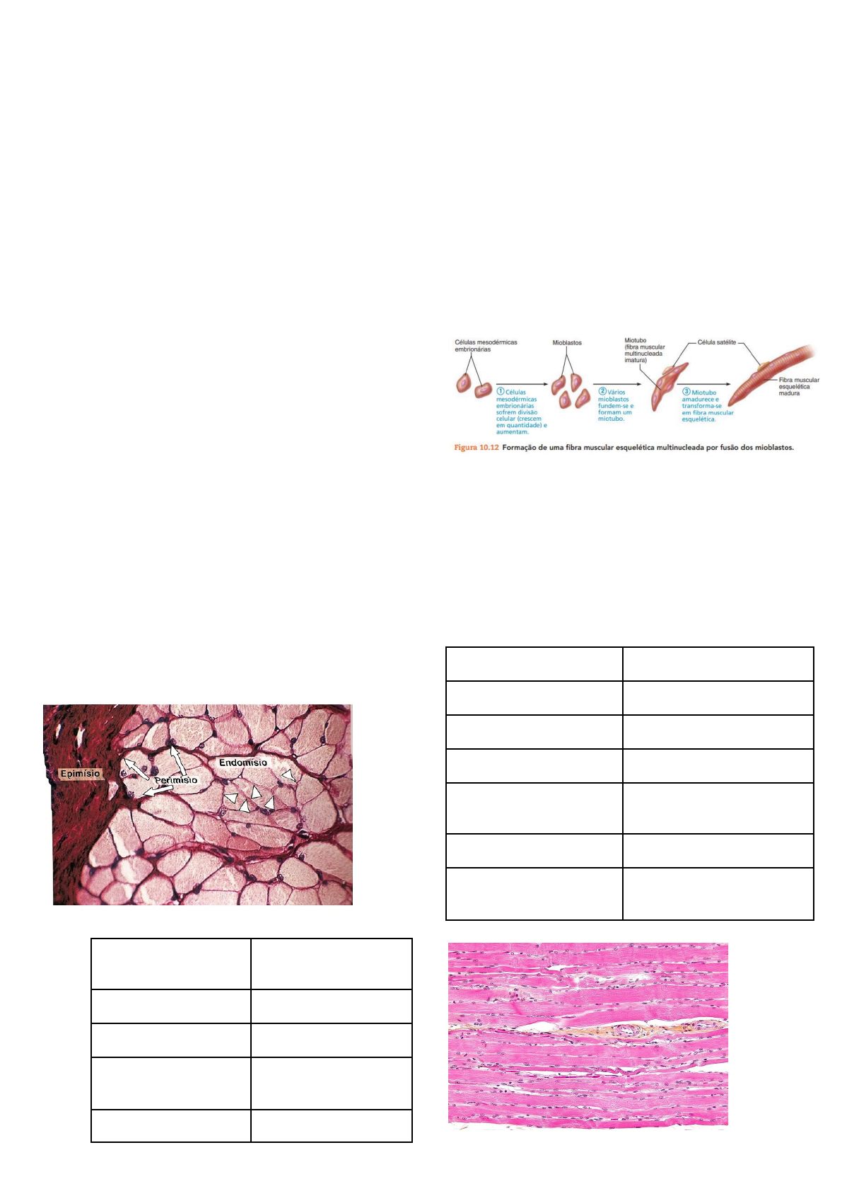 Tecid� muscula� 1) Características: ● Constituído por células alongadas, a actina e a miosina e são chamadas de fibras musculares. ● Origem mesodérmica. ● É vascularizado e inervado. ● Dividido em 3 tipos: estriado esquelético, liso e estriado cardíaco. 2) Funções: ● Responsável pelos movimentos corporais. ● Contração muscular. ● Movimentos circulatórios e respiratórios. ● Retículo sarcoplasmático: armazenar cálcio. 3) Células: ● São alongadas porém estreitas. ● Recebem o nome de fibras musculares. ● A fibra caracteriza a matriz. 4) Fibras musculares: ● São envolvidas por bainhas de tecido conjuntivo. O epimísio, perimísio e endomísio. ● Epimísio- Bainha mais externa que envolve o músculo inteiro. ● Perimísio- Bainha mais de tecido conjuntivo denso não modelado e espessa que envolve o endomísio e os feixes de fibras. → Típico do tecido muscular esquelético. ● Endomísio- Bainha de tecido conjuntivo frouxo e mais interna que envolve cada fibra muscular. → Rico em fibras reticulares. 5) Demais tecidos vs tecido muscular: DEMAIS TECIDOS TECIDO MUSCULAR membrana plasmática sarcolema citoplasma sarcoplasma R.E liso retículo sarcoplasmático célula fibra muscular 6) Músculo estriado esquelético: ● Muito vascularizado. ● Formado por feixes de células muito longas, cilíndricas, multinucleadas chamadas fibras musculares. ● Possui estrias transversais. ● Os núcleos se encontram na periferia das fibras. ● Esse tecido possui atividade rápida, forte, descontínua e voluntária. ● Inicialmente passam por um processo de fusão: Mioblasto mononucleado → fusão(se fundem) → mioblasto multinucleado(miotúbulo) → miotúbulo passa por diferenciação → fibra muscular esqueléticas ● As fibras esqueléticas: → Células cilíndricas longas e multinucleadas. → Núcleos periféricos. → Filamentos contráteis. → Mitocôndrias,mioglobina,glicogênio, inclusões de lipídeos, túbulos transversos. → Cisternas do retículo sarcoplasmático. → Estrias transversais. → Podem ser rápidas(brancas) e lentas(vermelhas). RÁPIDAS/BRANCAS LENTAS/VERMELHAS movimentos rápidos movimentos lentos capacidade de explosão + mioglobina fibras maiores fibras menores retic. sarcoplasmático maior retic. sarcoplasmático menor ↓suprimento sanguíneo ↑suprimento sanguíneo entram em fadiga rapidamente ↑mitocôndria 7) Músculo estriado cardíaco: ● Células alongadas e ramificadas que se anastomossam irregularmente. ● Células unidas entre si por suas extremidades por meio de junções especializadas chamadas discos intercalares. ● A função do disco intercalar é dar uma propagação rápida e sincronizada às contrações do músculo cardíaco → São junções de adesão(juntam uma célula a outra). → Ancoram as fibrilas dos sarcômeros. → Junções comunicantes(GAP): propagação da contração. → Desmossomos: Unem as células para que não se separem na contração. ● Possui estrias transversais como as esqueléticas, devido ao arranjo dos miofilamentos. ● Possui apenas 1 ou 2 núcleos centralizados. ● Tecido de contração rápida,forte,contínua e involuntária. ● Localizado no miocárdio(camada do meio do coração). ● A célula é mononucleada, podendo ter 2 núcleos e a fibra é multinucleada. ● Dicotomização: A fibra se ramifica formando 2 ramos. ● Anastomose: 2 fibras se formam 1. ● Numerosos grânulos de glicogênio e mitocôndrias entre as miofibrilas. ● Cisternas terminais: → Túbulos transversos(T) mais desenvolvidos que no estriado esquelético. → Pequenas cisternas terminais do REL formam uma díade no nível da linha Z. → Penetram nos feixes de miofilamentos no nível da linha Z. → A despolarização rápida da membrana ocorre por canais rápidos de Na e em seguida por canais lentos de cálcio. 8) Tecido muscular liso: ● São células longas, mais espessas no centro e vão se afinando nas extremidades. ● As células são lisas e revestidas por lâmina basal e mantidas juntas por uma rede de fibras reticulares. ● São células fusiformes. ● São células bem unidas e muito menos desenvolvidas que os dos tecidos estriados. ● Células conectadas por junções comunicantes. ● Possui um único núcleo central e alongado. ● O núcleo fica com formato de saca-rolha quando contraído. ● Arranjo em camadas. ● único tecido muscular que não possui o sarcômero como citoesqueleto. ● É associado às vísceras, sistema reprodutor, vasos sanguíneos e intestinos. ● Tecido de contração fraca, lenta e involuntária. ● Gasta pouca energia para manter a contração. ● Ausência de estrias transversais. ● Possui os corpos densos: →Filamentos finos e espessos estão dispersos por todo o citoplasma. → Miosinas do tecido liso orientadas em arranjo polar-lateral. → Apoiam os microfilamentos contráteis (de actina e miosina) em rede no citoplasma e na membrana plasmática. ● Presença de cavéolas, que são invaginações de membrana plasmática. → Fazem pinocitose de líquido e íons(Ca2) pelas cavéolas para a contração. → Análogas aos túbulos T. 9) Contração muscular de músculos estriados: ● Ocorre quando filamentos de actina e miosina deslizam um sobre o outro. ● Encurtamento das distâncias entre as linhas Z quando o sarcômero se contrai. ● No músculo em repouso a tropomiosina impede o contato entre actina e miosina. ● Miosina: filamentos espessos. ● Actina: filamentos delgados. ● A actina, miosina,troponina e tropomiosina formam as miofibrilas. ● As miofibrilas são cilindros presentes em cada célula e estão dispostas paralelamente ● Banda A: composto por miosina(filamento mais escuro) ● Banda I: composto por actina(filamento mais claro) → Linha Z: região central mais escura na banda I. ● 2 linhas Z sucessivas formam o sarcômero. ● Há 2 bandas I e 1 banda A no sarcômero ● A linha M conecta