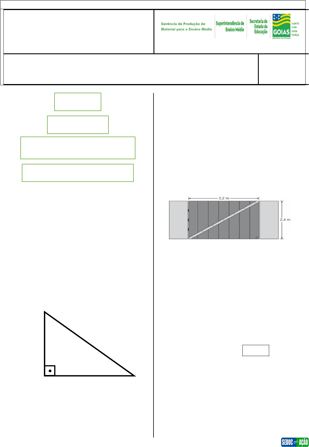 ATIVIDADE COMPLEMENTAR PARA II PERÍODO DE RECOMPOSIÇÃO ETAPA – ENSINO MÉDIO INSERÇÃO CURRICULAR (16 A 20/05/2022) 2ª SÉRIE COLÉGIO:___________________________________________________________________ PROFESSOR/PROFESSORA:__________________TURMA:________TURNO: _________ NOME:________________________________________________________________ DATA: ___/____/2022. NÍVEL II BLOCO I MATEMÁTICAS E SUAS TECNOLOGIAS MATEMÁTICA · HABILIDADE Utilizar o Teorema de Pitágoras na resolução de problema. TEOREMA DE PITÁGORAS O Teorema de Pitágoras relaciona o comprimento dos lados do triângulo retângulo. Essa figura geométrica é formada por um ângulo interno de 90°, chamado de ângulo reto. O enunciado desse teorema é: "A soma dos quadrados de seus catetos corresponde ao quadrado de sua hipotenusa." a b c a: Hipotenusa b: Cateto c: Cateto Teorema de Pitágoras: 1º Exemplo Após uma tempestade com ventos muito fortes, um marceneiro foi chamado para consertar o portão de entrada de uma casa. Para resolver o problema, decidiu colocar uma trave de madeira, fixada na diagonal do portão retangular, conforme indicado na figura a seguir. Com base nas informações, qual é o comprimento da trave colocada pelo marceneiro? (A) 5,6 m (B) 4,8 m (C) 4,0 m (D) 3,2 m (E) 4,5 m Resolução Considerando que a trave representa a hipotenusa, de medida de um triângulo retângulo cujos catetos medem e podemos escrever: 2º Exemplo Observe as medidas indicadas em um mapa do Parque Ibirapuera, região plana da cidade de São Paulo. De acordo com o mapa, uma caminhada em linha reta do Museu Afro Brasil (P) até o Museu de Arte Moderna de São Paulo (Q) corresponde a (A) 400 m. (B) 625 m. (C) 676 m. (D) 484 m. (E) 576 m. Resolução Aplicando o teorema de Pitágoras no triângulo da figura, temos: Como 1,6 cm no mapa equivalem a 200 m, a distância procurada vale: PRATICANDO I 01 Aplicando o teorema de Pitágoras, determine a medida x indicada em cada um dos triângulos retângulos. a) _____________________________________________________________________________________________________________________________________________________________________________________________________________ b) _____________________________________________________________________________________________________________________________________________________________________________________________________________ c) _____________________________________________________________________________________________________________________________________________________________________________________________________________ d) _____________________________________________________________________________________________________________________________________________________________________________________________________________ 02 Os lados de um triângulo ABC medem 10cm, 24 cm e 26 cm. Você pode afirmar que esse triângulo é retângulo? _____________________________________________________________________________________________________________________________________________________________________________________________________________ 03 Em um triângulo retângulo, a hipotenusa mede 14 cm e um dos catetos mede cm. Determine a medida do outro cateto. _____________________________________________________________________________________________________________________________________________________________________________________________________________ 04 Um terreno triangular tem frentes de 12 m e 16 m em duas ruas que formam um ângulo de 90º. Quanto mede o terceiro lado desse terreno? ____________________________________________________________________________________________________________________________________________________________________ 05 Observe o triângulo retângulo a seguir. Marque a alternativa que corresponde a medida do lado AC (A) 10 m (B) 14 m (C) 24 m (D) 30 m (E) 48m 06 (IFPE/2016) Uma escada de 13 metros de comprimento está apoiada no topo de um muro de 5 metros de altura, conforme a figura a seguir. Determine a distância entre o pé da escada e o muro. (A) 12 (B) 30 (C) 18 (D) 45 (E) 79 07 (IFMT/2017) Mário e seu avô decidiram construir um balanço para eles brincarem. De acordo com a figura, a seguir, qual deverá ser o tamanho da tábua? (A) 3,5 metros. (B) 3,7 metros. (C) 3,9 metros. (D) 4,1 metros. (E) 4,7 metros. 08 (Unemat-MT/2012) Dois móveis, A e B, estão se deslocando por duas estradas retilíneas que se cruzam no ponto P (conforme a figura a seguir) e formam entre elas um ângulo reto. No exato momento em que o móvel A está a 6 km de distância do ponto de cruzamento P, o móvel B está exatamente a 8 km de P. Portanto, a distância (em linha reta) entre A e B é: (A) 14 km (B) 6 km (C) 8 km (D) 10 km (E) 15 km 09 Observe o gráfico a seguir. Considerando , assinale a alternativa que apresenta a distância do ponto A ao ponto B. (A) 56 (B) 21 (C) 20 (D) 15 (E) 10 GABARITO 01. a) 35 b) 7 c) d) 40 02. sim, pois 26² = 24² + 10² 03. 11 cm 04. 20 m 05. A 06. A 07. B 08. D 09. A BLOCO II MATEMÁTICAS E SUAS TECNOLOGIAS MATEMÁTICA · HABILIDADE Resolver problemas utilizando a semelhança de triângulos. Semelhança de triângulos Dois triângulos são semelhantes se, e somente se, possuem os três ângulos ordenadamente congruentes e os lados correspondentes são proporcionais. A semelhança entre os triângulos ABC e PQR será denotada por Assim temos que, Razão de semelhança A constante k apresentada na definição é denominada razão de semelhança. Qualquer razão entre medidas lineares (lado, altura e perímetro) resulta em k. Neste caso temos que Onde e um lado do triangulo 1 e e outro lado correspondente no triangulo 2. 1º Exemplo Observe os triângulos a seguir. Sabendo que os triângulos ABC e PQR são semelhantes, determine a razão de semelhança. Resolução Vamos determinar a razão entre os triângulos ABC e PQR nessa ordem. Portanto a razão de semelhança d