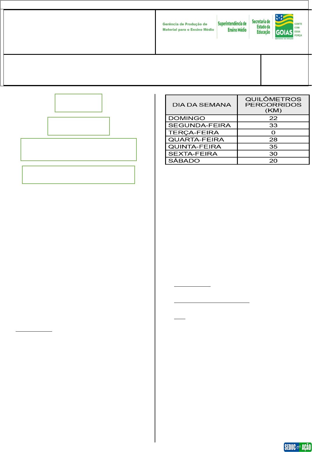 ATIVIDADE COMPLEMENTAR PARA II PERÍODO DE RECOMPOSIÇÃO ETAPA – ENSINO MÉDIO INSERÇÃO CURRICULAR (16 A 20/05/2022) 3ª SÉRIE COLÉGIO:___________________________________________________________________ PROFESSOR/PROFESSORA:__________________TURMA:________TURNO: _________ NOME:________________________________________________________________ DATA: ___/____/2022. NÍVEL II BLOCO I MATEMÁTICAS E SUAS TECNOLOGIAS MATEMÁTICA · HABILIDADES Utilizar média aritmética ponderada de uma coleção de dados na resolução de problema. Utilizar mediana de uma coleção de dados na resolução de problema. Utilizar moda de uma coleção de dados na resolução de problema. Média Aritmética A Média Aritmética será chamada de Média Aritmética Simples, quando for calculada como o quociente entre a soma de todos os distintos valores relacionados e o número de observações envolvidas nessa soma. 1º Exemplo: (IFBA/2013) Um ciclista percorre na primeira semana de treino a quilometragem descrita na tabela a seguir: Sendo assim, a média da distância percorrida por este ciclista, em km, nesta primeira semana de treino foi igual a: (A) 24 (B) 32 (C) 26 (D) 30 (E) 28 Resolução Gabarito: A Portanto a média da distância percorrida por este ciclista, nesta primeira semana foi de 24 km. Média Aritmética Ponderada Ela será chamada de Média Aritmética Ponderada quando alguns valores possuírem mais importância (peso) do que outros. Essa relevância é indicada por um numeral denominado peso. Neste caso, encontraremos a Média Aritmética Ponderada dividindo o somatório dos produtos dos valores por seus respectivos pesos pela soma dos pesos. 2º Exemplo: (Encceja/2020) Em 2019, a Copa América foi realizada no Brasil. A tabela apresenta o número de gols por jogos. Número de gols Jogos 0 5 1 3 2 6 3 4 4 7 5 1 O número mais próximo da média de gols por jogo na Copa América de 2019 é (A) 2,3. (B) 2,5. (C) 4,0. (D) 4,3. (E) 5. Resolução Gabarito: A Média de gols 3º Exemplo: (UniforCE/2017) O gráfico, a seguir, mostra os resultados operacionais trimestrais de uma grande empresa da região metropolitana de Fortaleza, cujo resultados são dados em milhões de reais, isso nos quatro trimestres de 2010 e no 1º trimestre de 2011. (adaptado). Nos cinco trimestres considerados, o resultado operacional médio trimestral dessa empresa foi, em milhões de reais, de (A) lucro de 3,40. (B) lucro de 2,64. (C) lucro de 1,26. (D) prejuízo de 3,45. (E) prejuízo de 6,90. Resolução Gabarito: C Portanto essa empresa teve um lucro médio trimestral de 1,26 milhões de reais. 4º Exemplo: (ENEM/2016) Uma pessoa realizou uma pesquisa com alguns alunos de uma escola, coletando suas idades, e organizou esses dados no gráfico. Qual é a média das idades, em ano, desses alunos? (A) 9 (B) 12 (C) 18 (D) 19 (E) 27 Resolução Gabarito: D A média de idade desses estudantes é de 19 anos. 01 (ESPM-SP/2013-Adaptada) O gráfico, a seguir, mostra o número de alunos de uma classe conforme as notas obtidas numa prova de Matemática: Podemos concluir que a média aritmética das notas dessa classe é igual a: (A) 6,7 (B) 6,6 (C) 6,9 (D) 6,3 (E) 6,5 02 (UNEB-BA/2018-Adaptada) Observe a tabela a seguir. A tabela mostra o número de atendimentos prestados em uma clínica, em cada dia de certa semana. Determine a média de atendimentos prestados nessa clínica (A) 30 (B) 40 (C) 35 (D) 45 (E) 47 03 (Encceja/2015) O diagrama de colunas mostra a produção de canetas, em milhão, entre os anos 2007 e 2011. O setor de controle de qualidade da empresa visa aferir os motivos que levaram às distorções entre a produção média esperada, nesse período, e a produção registrada ano a ano. Nessas condições, constatou-se que a média anual de canetas produzidas no período, em milhão, é igual a (A) 7,5. (B) 7,8. (C) 9,0. (D) 10,5. (E) 12 04 (Uncisal-AL/2014) A tabela apresenta as notas dos seis alunos que melhor se saíram em uma disciplina de uma instituição de ensino superior de Maceió. Marque a alternativa que corresponde a média aritmética das notas. (A) 6,0 (B) 6,5 (C) 7,0 (D) 8,5 (E) 9,0 05 (UERJ/2018) Técnicos do órgão de trânsito recomendaram velocidade máxima de 80 km/h no trecho de uma rodovia onde ocorrem muitos acidentes. Para saber se os motoristas estavam cumprindo as recomendações, foi instalado um radar móvel no local. O aparelho registrou os seguintes resultados percentuais relativos às velocidades dos veículos ao longo de trinta dias, conforme o gráfico abaixo: Determine a média de velocidade, em km/h, dos veículos que trafegaram no local nesse período. ________________________________________________________________________________________________________________________________________________________________________________________________________________________________________________________________________________________________________________________________________ 06 (Fac. Cesgranrio RJ/2018) Uma escola fez o levantamento das idades, em anos, dos alunos que prestaram vestibular em 2016, obtendo o resultado ilustrado no gráfico a seguir. A média das idades, em anos, dos alunos que se encontram no levantamento é (A) 18,1 (B) 18,5 (C) 18,7 (D) 18,8 (E) 19,1 07 (ESPM-SP) O gráfico, a seguir, mostra a distribuição das notas obtidas por uma turma de 40 alunos numa prova de Matemática: Pode-se concluir que a média aritmética das notas dessa turma foi: (A) 6,35 (B) 7,05 (C) 6,85 (D) 7,25 (E) 6,15 08 (Uncisal-AL/2015)Em cada bimestre, uma faculdade exige a realização de quatro tipos de avaliação, calculando a nota bimestral pela média ponderada dessas avaliações. Se a tabela apresenta as notas obtidas por uma aluna nos quatro tipos de avaliações realizadas e os pesos dessas avaliações, sua nota bimestral foi aproximadamente igual a (A) 8,6. (B) 8,0. (C) 7,5. (D) 7,2. (E) 6,8. 09 (ESPM-SP/2013) A tabela, a seguir, mostra os tempos que 5 estudantes levaram