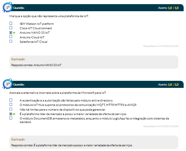 Assinale a alternativa incorreta sobre a plataforma da Microsoft para loT. A autenticação e a autorização são feitas pelo módulo active directory. módula Hub suporta os protocolos de comunicação HTTP/HTTPS. Não há limites para de dispositivos que pode gerenciar. É a plataforma lider de mercado e possui a maior variedade de oferta de serviços. módulo DocumentDB armazena os metadados, enquanto módulo LogicApp faz a integração com sistemas de backend.