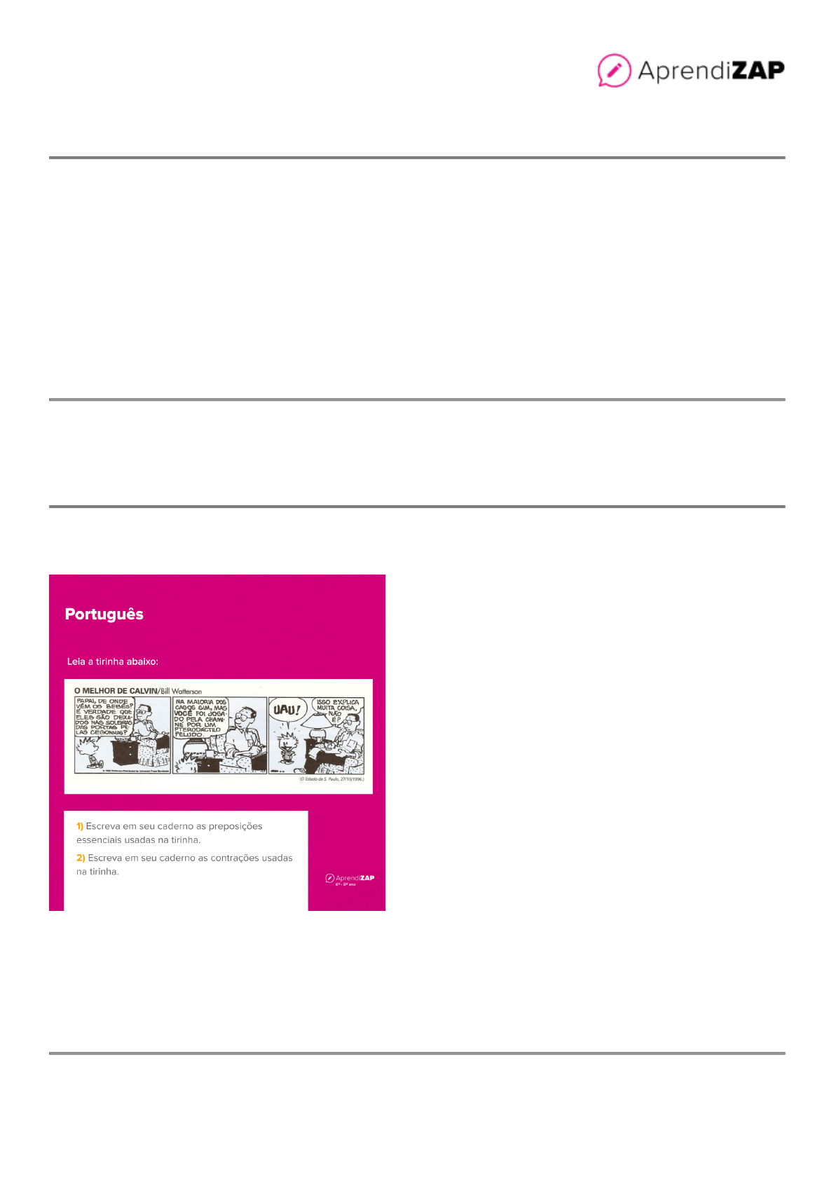 Aula Preposições Nesta aula de Português vamos estudar as *preposições*. Se concentre e bons estudos! Informações: Ano: 8º Ano Unidade: Ortografia e gramática Habilidades BNCC: EF08LP14 Utilizar, ao produzir texto, recursos de coesão sequencial (articuladores) e referencial (léxica e pronominal), construções passivas e impessoais, discurso direto e indireto e outros recursos ex- pressivos adequados ao gênero textual. Conteúdo da aula: Conteúdo em PDF anexo ao final do arquivo Atividade aberta Correção: 1) As preposições essenciais usadas na tirinha são DE e POR. 2) As contrações usadas na tirinha são: NAS, DAS, PELAS, NA, DOS, PELA. Aula Preposições Exercício de múltipla escolha Preencha os espaços em branco: I. Nós assistimos __ filme. II. Não se deve falar __ telefone quando dirige. III. Foi __ escola __ pé. A) o; no; na; à. B) ao; ao; à; a. C) ao; ao; à; à. Correção: *A) Incorreto* - As preposições são muitos importantes na hora de escrever. Vale a pena voltar à lição pra rever as preposições e acertar na próxima! Resposta certa: alternativa B. *B) Correto* - Parabéns! Você acertou! *C) Parcialmente Correto* - A expressão *a pé* não leva crase porque *pé* é um substantivo masculino e em frente a palavras masculinas não vai crase. Resposta certa: alternativa B. Metodologia Ativa Rotação por estações Por que usar essa metodologia? Esta metodologia é muito necessária quando pensamos em *personalização da aprendizagem*. Através dela, podemos trabalhar com circuitos projetados, chamados de *estações*. Cada estação possui uma atividade com início, meio e fim, para que os alunos possam começar por qualquer uma delas sem que haja uma ordem fixa a seguir. Ao trabalhar esta metodologia ativa é possível desenvolver habilidades como autonomia, proativi- dade, comunicação, alfabetização digital, pensamento crítico, capacidade de trabalhar em equipe e gestão de tempo. Você sabia? É importante ressaltar que para ser caracterizada como rotação por estação é necessário ter ao menos uma estação no formato digital. As preposições são palavras que estabelecem relações entre termos de uma frase. Elas são muito importantes para a construção da coesão e coerência textual. Em nosso cotidiano, as preposições estão presentes em todos os lugares, desde as placas de trânsito até as instruções de uso de um medicamento. Trabalharemos as preposições de forma lúdica e interativa, utilizando a metodologia Aula Preposições ativa Rotação por estações. Os alunos terão a oportunidade de trabalhar em grupo e desenvolver habilidades de coesão e sequencialidade textual. Aula Preposições Etapa 1 - Introdução Apresente aos alunos o conceito de preposições e sua importância na construção textual. Em seguida, faça uma revisão dos principais tipos de preposições (essenciais, acidentais e locuções prepositivas) e suas funções sintáticas. Utilize exemplos práticos e peça que os alunos identifiquem as preposições nas frases. Etapa 2 - Estação 1 - Jogo da Memória Nesta estação, os alunos irão jogar um jogo da memória com cartas contendo preposições e seus complementos. O objetivo é identificar a relação estabelecida pela preposição e seu complemento. Crie as cartas com a ajuda dos alunos, utilizando exemplos retirados de textos lidos em sala de aula. Etapa 3 - Estação 2 - Caça-palavras Nesta estação, os alunos irão buscar preposições em um caça-palavras. Produza um caça-palavras com a ajuda dos alunos, utilizando palavras relacionadas ao cotidiano dos deles. Após a conclusão da atividade, os alunos devem apresentar as preposições encontradas e explicar a relação estab- elecida pela preposição e seu complemento. Etapa 4 - Estação 3 - Produção textual Nesta estação, os alunos irão produzir um texto coeso e coerente utilizando as preposições. Forneça um tema ou deixe que os alunos escolham um. Os alunos devem utilizar as preposições adequada- mente, estabelecendo relações claras entre os termos da frase. Faça uma correção coletiva dos textos produzidos pelos alunos. Etapa 5 - Fechamento Faça uma revisão dos conceitos trabalhados na aula e enfatize a importância das preposições na construção textual. Os alunos podem apresentar as atividades realizadas em cada estação e discutir as dificuldades encontradas. Aula Preposições Intencionalidades pedagógicas Desenvolver habilidades de coesão e sequencialidade textual. Estimular a criatividade e a produção textual dos alunos. Promover a interação e a colaboração entre os alunos. Critérios de avaliação Identificação correta das preposições e suas funções sintáticas. Utilização adequada das preposições na produção textual. Coesão e coerência textual. Ações do professor Apresentar de forma clara e objetiva os conceitos de preposições e suas funções sintáticas. Auxiliar os alunos na produção textual e na correção dos erros encontrados. Estimular a interação e a colaboração entre os alunos. Ações do aluno Identificar corretamente as preposições e suas funções sintáticas. Utilizar adequadamente as preposições na produção textual. Colaborar com os colegas nas atividades em grupo. Metodologia Ativa Aprendizagem Baseada em Projetos Por que usar essa metodologia? Através desta metodologia, é possível *incentivar o protagonismo do aluno* e desenvolver habili- dades que serão importantes na sua vida dentro e fora do ambiente escolar, como: colaboração, raciocínio lógico, pensamento crítico, proatividade e a percepção que é possível realizar a mesma tarefa de formas distintas. Com essa metodologia os alunos em grupo se aprofundam na temática proposta para desen- volver um projeto que apresenta ligação com o seu cotidiano. Na busca por possíveis soluções, a Aula Preposições *aprendizagem por pares* favorece a tomada de decisão, o desenvolvi