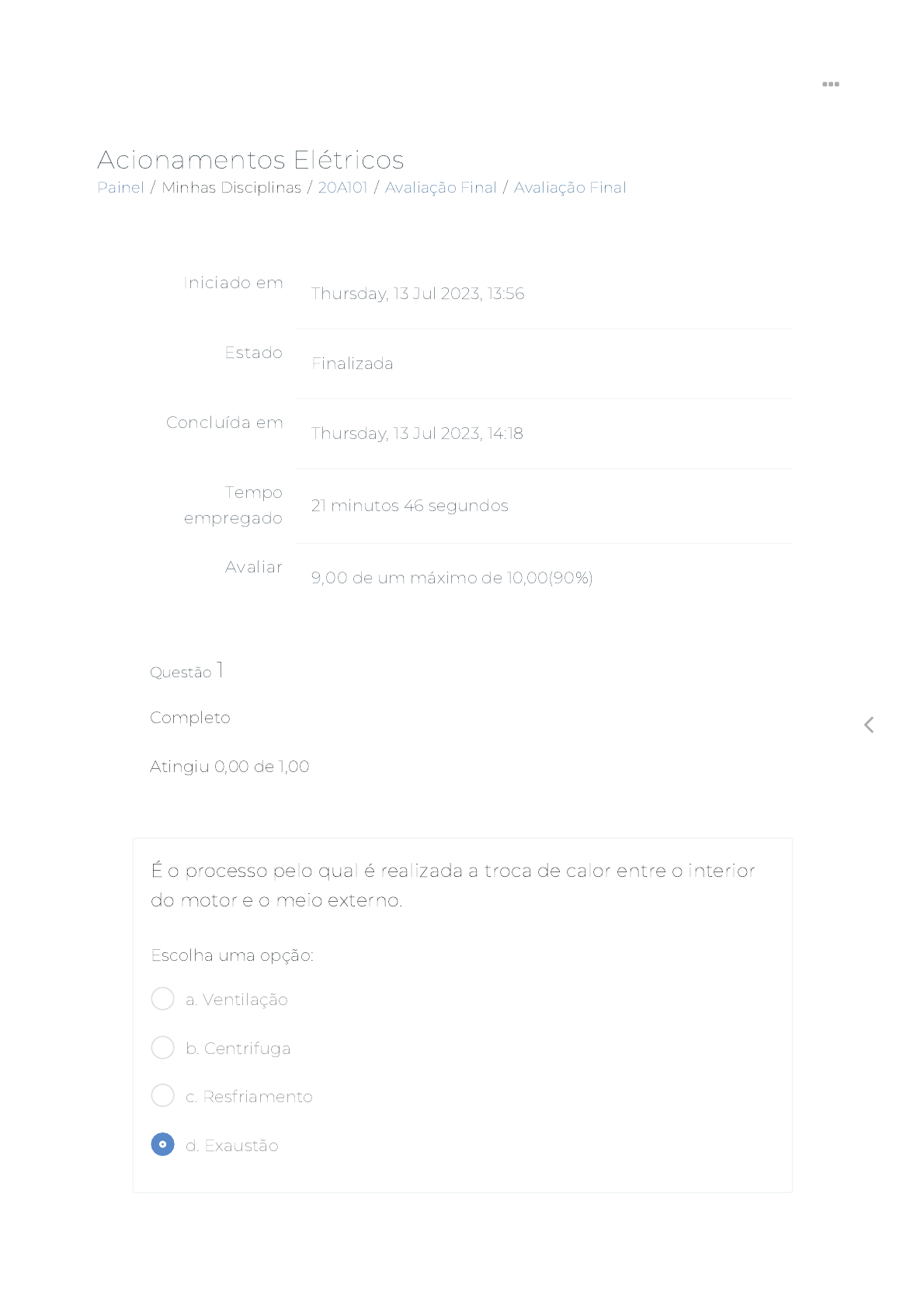 13/07/2023 Avaliação Final https://ava.politecnicabr.com.br/mod/quiz/review.php?attempt=5201916 1/6 Painel / Minhas Disciplinas / 20A101 / Avaliação Final / Avaliação Final Acionamentos Elétricos Iniciado em Thursday, 13 Jul 2023, 13:56 Estado Finalizada Concluída em Thursday, 13 Jul 2023, 14:18 Tempo empregado 21 minutos 46 segundos Avaliar 9,00 de um máximo de 10,00(90%) Questão 1 Completo Atingiu 0,00 de 1,00 É o processo pelo qual é realizada a troca de calor entre o interior do motor e o meio externo. Escolha uma opção: a. Ventilação b. Centrifuga c. Resfriamento d. Exaustão https://ava.politecnicabr.com.br/my/ https://ava.politecnicabr.com.br/course/view.php?id=935 https://ava.politecnicabr.com.br/course/view.php?id=935#section-9 https://ava.politecnicabr.com.br/mod/quiz/view.php?id=26393 https://ava.politecnicabr.com.br/ 13/07/2023 Avaliação Final https://ava.politecnicabr.com.br/mod/quiz/review.php?attempt=5201916 2/6 Questão 2 Completo Atingiu 1,00 de 1,00 Potência reativa é a energia intermediária necessária para qualquer equipamento, como, por exemplo, motores, transformadores, reatores, capacitores, entre outros. E é trocada entre o gerador e a carga, sendo consumida efetivamente. Escolha uma opção: Questão 3 Completo Atingiu 1,00 de 1,00 Existem dois tipos de rotores em motores assíncronos trifásicos. Que são conhecidos como: Escolha uma opção: Verdadeiro Falso a. Rotor em curto-circuito e Rotor em gaiola b. Rotor bobinado e Rotor em Estrela c. Rotor gaiola de esquilo e Rotor em triangulo d. Rotor gaiola de esquilo e Rotor bobinado https://ava.politecnicabr.com.br/ 13/07/2023 Avaliação Final https://ava.politecnicabr.com.br/mod/quiz/review.php?attempt=5201916 3/6 Questão 4 Completo Atingiu 1,00 de 1,00 O Motor de indução com rotor gaiola de esquilo tem uma desvantagem de ser menos econômico em relação aos motores monofásicos tanto na construção como na utilização. Escolha uma opção: Questão 5 Completo Atingiu 1,00 de 1,00 Podemos a�rmar que os parâmetros de regulação são os valores ajustáveis a serem utilizados pelas funções da soft-starter, como, por exemplo, tensão inicial, tempo de rampa de aceleração, tempo de rampa de desaceleração etc. Escolha uma opção: Verdadeiro Falso Verdadeiro Falso https://ava.politecnicabr.com.br/ 13/07/2023 Avaliação Final https://ava.politecnicabr.com.br/mod/quiz/review.php?attempt=5201916 4/6 Questão 6 Completo Atingiu 1,00 de 1,00 Podemos a�rmar que os parâmetros de con�guração não de�nem as características da soft-starter e as funções a serem executadas, bem como as entradas e saídas precisarão de parâmetros adicionais aos relés de saída e das entradas da soft-starter. Escolha uma opção: Questão 7 Completo Atingiu 1,00 de 1,00 As botoeiras possuem cores de�nidas por normas de acordo com a sua função. Faça a relação entre as cores Verde ou preto: ligar, partida Vermelho: parar, desligar ou botão de emergência Branco ou azul: qualquer função diferente das anteriores Amarelo: iniciar um retorno, eliminar uma condição perigosa Verdadeiro Falso https://ava.politecnicabr.com.br/ 13/07/2023 Avaliação Final https://ava.politecnicabr.com.br/mod/quiz/review.php?attempt=5201916 5/6 Questão 8 Completo Atingiu 1,00 de 1,00 A Chave seletora possui duas ou mais posições e permite selecionar uma entre várias posições em um determinado processo com (C) ponto de contato comum. Também pode ser chamada de chave comutadora, contato three-way ou contato paralelo. Escolha uma opção: Questão 9 Completo Atingiu 1,00 de 1,00 Sua posição original é fechada, ou seja, permanece fechado até que seja aplicada uma força externa. Escolha uma opção: Verdadeiro Falso a. Contato NF b. Contato NA c. Chave seletora d. Chave com retenção https://ava.politecnicabr.com.br/ 13/07/2023 Avaliação Final https://ava.politecnicabr.com.br/mod/quiz/review.php?attempt=5201916 6/6 © 2022 - Escola Politécnica Brasileira Questão 10 Completo Atingiu 1,00 de 1,00 Com o advento da eletrônica de potência, torna-se cada vez mais inviável o o uso de chaves eletrônicas de partida de motores. Escolha uma opção: Verdadeiro Falso Entre em Contato https://www.politecnicabr.com.br 0800 084 2627 0800 084 2627 Links Úteis Dicas da nossa Diretora Acadêmica Planner de Estudos Declaração de Matrícula Orientações do AVA Abertura de Ticket Fale com o Tutor Cronograma de Estudos Manual de Estágio Manual de Competência Siga-nos nas redes sociais https://ava.politecnicabr.com.br/mod/quiz/0 https://www.politecnicabr.com.br/ https://soundcloud.com/user-501638417/sets/escola-politecnica-brasileira https://storage.googleapis.com/sirius-pubstore/semestre_plannerdeestudo%20poli.pdf https://storage.googleapis.com/sirius-pubstore/declaracao_matricula.pdf https://storage.googleapis.com/sirius-pubstore/orientacoes_ava.pdf https://storage.googleapis.com/sirius-pubstore/abertura_ticket.pdf https://storage.googleapis.com/sirius-pubstore/fale_com_tutor.pdf https://storage.googleapis.com/sirius-pubstore/cronograma_estudos.pdf https://storage.googleapis.com/sirius-pubstore/manual_estagio.pdf https://storage.googleapis.com/sirius-pubstore/manual_competencia.pdf https://www.facebook.com/politecnicabr https://www.instagram.com/politecnicabr_oficial https://ava.politecnicabr.com.br/