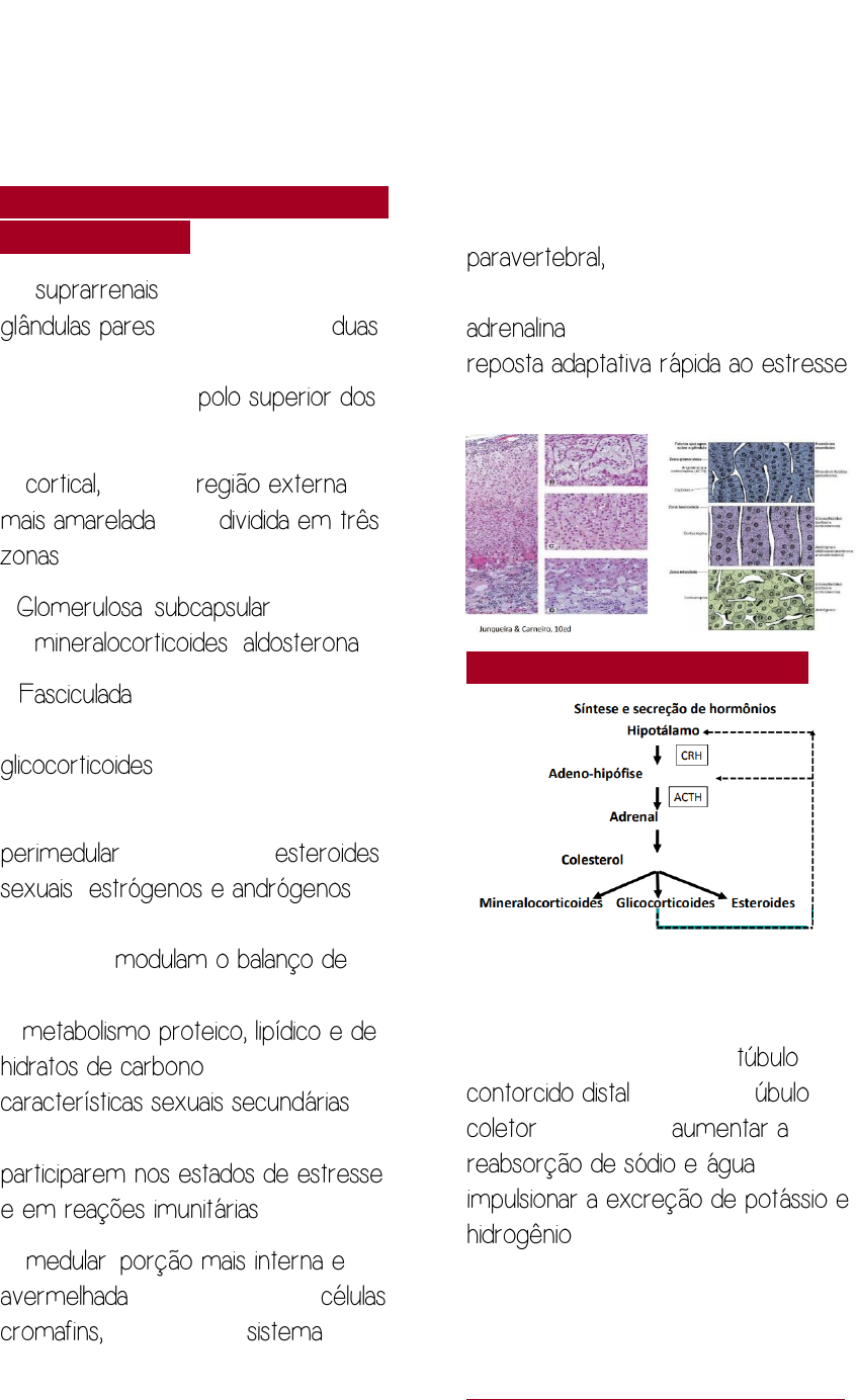 ANATOMIA E HISTOFISIOLOGIA DAS ADRENAIS As suprarrenais (ou adrenais) são glândulas pares constituídas por duas partes distintas (cortical e medular) localizadas sobre o polo superior dos rins A cortical, que é a região externa e mais amarelada, está dividida em três zonas: I: Glomerulosa, subcapsular, produtora de mineralocorticoides (aldosterona); II: Fasciculada, em posição intermediária, produtora de glicocorticoides (cortisol); III: Reticular, que ocupa posição perimedular, produtora de esteroides sexuais (estrógenos e andrógenos). Em indivíduos normais, esses hormônios modulam o balanço de água e eletrólitos (mineralocorticoides), o metabolismo proteico, lipídico e de hidratos de carbono (cortisol) e as características sexuais secundárias (esteroides sexuais), além de participarem nos estados de estresse e em reações imunitárias. A medular, porção mais interna e avermelhada, é constituída por células cromafins, derivadas do sistema nervoso autônomo simpático paravertebral, que secretam catecolaminas, principalmente adrenalina, com importante papel na reposta adaptativa rápida ao estresse e modificações do meio ambiente FISIOLOGIA DAS ADRENAIS MINERALOCORTICÓIDE (ALDOSTERONA) Age diretamente sobre o túbulo contorcido distal e sobre o túbulo coletor, de forma a aumentar a reabsorção de sódio e água, e impulsionar a excreção de potássio e hidrogênio GLICOCORTICÓIDE (CORTISOL) Há 2 funções principais: METABÓLICA (OPOSTA À INSULINA) PATOLOGIA DAS ADRENAIS Highlight Highlight Estimula a gliconeogênese no fígado e, portanto, aumenta a concentração de glicose no sangue ANTI-INFLAMATÓRIA Suprime as respostas teciduais a lesões e diminui a imunidade celular e humoral HORMÔNIOS SEXUAIS ESTEROIDES Andrógenos fracos que podem ser convertidos em testosterona ou estrógeno nos tecidos periféricos ATROFIA DAS ADRENAIS Esta pode ser causada pela Doença de Addison (Insuficiência Adrenocortical Primária Crônica), que provê vários sintomas, como a hipotensão e a hiperpigmentação. Esta ocorre, pois um dos precursores do ACTH, o POMC, é, também, precursor do MSH, hormônio que estimula os melanócitos. Como se tem alta presença de ADH nesta patologia, a hiperpigmentação é, simultaneamente, favorecida O diagnóstico é clínico, e ocorre por altas concentrações de ACTH e baixas concentrações de cortisol O tratamento depende da causa mas, geralmente, é realizado com hidrocortisona OBS: A Corticoterapia por longo tempo pode, também, ocasionar a atrofia das adrenais HIPERPLASIA CORTICAL BILATERAL DA ADRENAL Esta pode ser causada por um Adenoma de hipófise produtor de ACTH, ou por secreção ectópica de ACTH por tumores, como Carcinoma de Pequenas Células Pulmonar (síndrome paraneoplásica) ou por causas idiopáticas SÍNDROME DE CUSHING DEFINIÇÃO Síndrome de Cushing corresponde a qualquer condição em que há aumento de glicocorticoides circulantes. ETIOLOGIAS Nesse contexto, existem duas situações: I: Aumento na síntese de glicocorticoides pelas suprarrenais; Nesta, existem duas possibilidades: (a) aumento de ACTH circulante provocado por lesões hipofisárias que produzem ACTH, principalmente adenomas secretores; ou por outras neoplasias de órgãos não endócrinos que produzem ACTH (manifestação paraneoplásica). Excesso de ACTH leva à hiperplasia bilateral e à hiperfunção das suprarrenais (dependente de ACTH); (b) hiperprodução de glicocorticoides por hiperplasia, adenoma ou adenocarcinoma da suprarrenal (independente de ACTH) II: Administração exógena de glicocorticoides (iatrogênica), correspondendo esta à maioria dos casos da síndrome. Esta acomete predominantemente mulheres na terceira e quarta décadas de vida, embora possa ocorrer também em crianças. SINAIS E SINTOMAS Na sua forma pura, as manifestações da síndrome de Cushing resultam do excesso de mineralo e glicocorticoides; na forma mista, coexistem sinais de hiperandrogenismo. A síndrome caracteriza-se por: 1: Obesidade de distribuição peculiar, predominando na face (face em lua cheia), no pescoço e no tronco, poupando os membros; II: Estrias purpúricas ou violáceas na pele do abdome (simulando estrias gravídicas), esquimoses e acne; III: Hirsutismo, hipogonadismo e distúrbios sexuais (amenorreia em mulheres, impotência em homens); O aumento de testosterona fora das gônadas pode levar à atrofia destas IV: Osteoporose generalizada, fraturas patológicas; V: Hipertensão arterial em 85% dos casos; VI: Fraqueza e atrofia musculares; VII: Redução da tolerância à glicose, com tendência a diabetes; VIII: Transtornos emocionais variados, inclusive quadros psicóticos. Laboratorialmente, encontra-se elevação dos níveis séricos ou urinários de cortisol, não suprimíveis pela dexametasona. Nas fases iniciais da doença, às vezes pode ser demonstrada perda do ritmo normal de liberação de cortisol. Alterações nos níveis de eletrólitos são encontradas principalmente nos casos com tumor da cortical. O ACTH plasmático é normal ou pouco elevado nos pacientes com hiperplasia bilateral das suprarrenais, muito elevado naqueles com tumores Highlight APUD produtores de ACTH, suprimido no carcinoma da suprarrenal e indetectável na hiperplasia de células produtoras de ACTH existentes na própria cortical das suprarrenais MACROSCOPIA E MICROSCOPIA MACROCOPIA Hiperplasia adrenocortical micronodular com nódulos pigmentados, dada a lipofuscina; Quando dependente de ACTH, tem- se a hiperplasia difusa bilateral da glândula MICROSCOPIA Células contendo lipofuscina, que é um pigmento de desgaste celular HIPERALDOSTERONISMO PRIMÁRIO ASPECTOS CLÍNICOS Aldosteronismo primário (síndrome de Conn) caracteriza-se por hipertensão arterial, polidipsia, poliúria, debilidade muscular, cãibras, paralisias, tetania, alcalose hipopotassêmica, níveis elevados de aldosterona e baixos de renina. EPIDEMIOLOGIA A doença surge entre 3