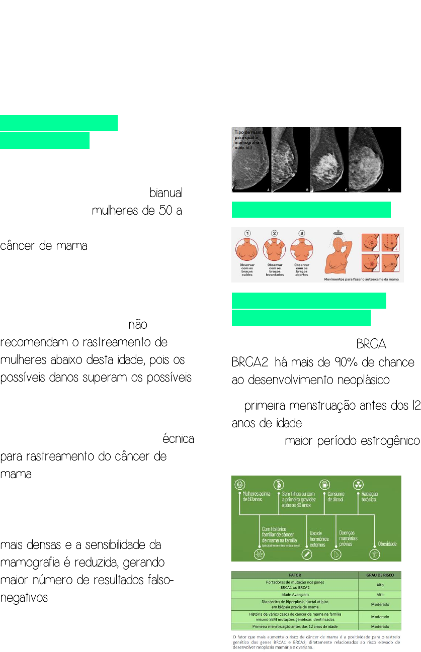 FUNDAMENTOS DA MAMOGRAFIA RASTREAMENTO Deve ser realizado de forma bianual (a cada 2 anos), em mulheres de 50 a 69 anos sem sinais e sintomas de câncer de mama (população de menor risco) O Ministério da Saúde e as principais diretrizes e programas de rastreamento do mundo não recomendam o rastreamento de mulheres abaixo desta idade, pois os possíveis danos superam os possíveis benefícios. Nessa faixa etária, o autoexame das mamas é recomendado como técnica para rastreamento do câncer de mama. A mamografia permite identificar melhor as lesões mamárias em mulheres após a menopausa. Antes desse período, as mamas são mais densas e a sensibilidade da mamografia é reduzida, gerando maior número de resultados falso- negativos (resultado negativo para câncer em pacientes com câncer) e também de falsos-positivos (resultado positivo para câncer em pacientes sem câncer). AUTOEXAME DAS MAMAS FATORES DE RISCO PARA NEOPLASIA MAMÁRIA A mutação, quando em BRCA1 e em BRCA2, há mais de 90% de chance ao desenvolvimento neoplásico A primeira menstruação antes dos 12 anos de idade é considerada fator de risco pelo maior período estrogênico ao qual a mulher foi submetido PROPEDÊUTICA DA MAMA Highlight Highlight Highlight Highlight Highlight Highlight Highlight Highlight Highlight Highlight Highlight Highlight Highlight Highlight Highlight Highlight Highlight Highlight Highlight Highlight Highlight Highlight CONDUTA NA POPULAÇÃO DE RISCO ABAIXO DE 30 ANOS E NÓDULO POUCO SUSPEITO Repetir o exame clínico, preferencialmente na segunda fase do ciclo menstrual. Realiza-se ultrassonografia em caso de persistência do nódulo. ABAIXO DE 30 ANOS E NÓDULO CLINICAMENTE SUSPEITO Realiza-se método de imagem e biópsia. 30 A 40 ANOS Realiza-se ultrassonografia. ACIMA DE 40 ANOS Faz-se ultrassonografia e mamografia de forma combinada. INCIDÊNCIAS MAMOGRÁFICAS São realizadas como rotina duas incidências mamográficas ortogonais em cada mama: Mediolateral-oblíqua (MLO) e Craniocaudal (CC). Os motivos para a realização de duas incidências são: I: Aumento da sensibilidade pela diminuição das áreas não expostas ou áreas cegas. II: Localização dos achados nos eixos longitudinal (superior-inferior) e horizontal (lateralmedial). III: Diminuição dos resultados falsos positivos. A identificação do mesmo achado em duas incidências ortogonais sugere investigação complementar com novas incidências, ultrassonografia ou ressonância mamária. LOCALIZAÇÃO DOS ACHADOS MAMOGRÁFICOS Em azul, vê-se o colo da mama; e, em verde, o bojo dela. Na direita, vê- se de cima para baixo, e, assim, somente o bojo é perceptível Como a região axilar não é, em parte, visualizável pela mamografia, este exame não elimina o exame clínico, que deve ser realizado OBS: Caso houvesse, por exemplo, um nódulo em quadrante superior direito lateral, este apareceria na região numerada em 1 e em 3 Highlight ANATOMIA RADIOLÓGICA DA MAMOGRAFIA MEDIO-LATERAL OBLÍQUA O Parênquima Fibroglandular é a porção mais densa, e o nódulo circunscrito apresentado possui características benignas. CRANIO-CAUDAL ALTERAÇÕES POSSÍVEIS NAS MAMOGRAFIAS ASSIMETRIAS São depósitos de tecido com densidade fibroglandular, que não obedecem à definição de nódulo radiodenso. É a densidade fibroglandular visível em apenas uma incidência mamográfica A distribuição do tecido fibroglandular deve ser similar entre as mamas. Caso uma delas possua maior densidade fibrogladular do que a outra, sabe-se que esta está em um processo diferente de envelhecimento ASSIMETRIA FOCAL Densidade fibroglandular menor que um quadrante e visível em duas incidências mamográficas Mamografia 1 Vê-se uma densidade fibroglandular aumentada na mama direita. Como esta se localiza em apenas um quadrante, neste caso, o superior; tem-se uma assimetria focal Mamografia 2 Vê-se uma densidade fibroglandular aumentada na mama direito, no quadrante superior lateral. Associado a tal, poderia haver, também, a percepção de um nódulo Mamografia 3 Há uma área de densidade fibroglandular aumentada; À direita, vê-se que um marcador metálico foi posto abaixo da pele, em vista de se orientar a punção em local de nódulo Este é posicionado em local de nódulo, já que neste há mais chance Highlight do resultado servir como um norteador ao tratamento da paciente. A região de densidade fibroglandular, por outro lado, tem menor chance de estar, possivelmente, em local de proliferação tecidual cancerígena OBS: A incidência médio lateral oblíqua é boa para estimar a altura, mas não a localização específica ASSIMETRIA GLOBAL Densidade fibroglandular maior que um quadrante (acomete mais de um deles) e visível em duas incidências mamográficas Mamografia 1 Há um padrão mais difuso do que as apresentadas acima. Neste caso, a mama esquerda é a menos densa, em comparação à direita. Na mama direita, destaca-se a densidade do quadrante superior lateral Mamografia 2 À esquerda, tem-se uma incidência médio-lateral oblíqua, com assimetria gritante que predomina na mama esquerda. À direita, tem-se que a densidade fibroglandular invade o quadrante superior, o inferior, o lateral e o medial ASSIMETRIA EM DESENVOLVIMENTO Densidade fibroglandular nova, maior ou melhor visível em relação à mamografia anterior Se o tecido está crescendo lentamente, há maior probabilidade de ser benigno; e, se cresce rapidamente, há maior probabilidade de ser maligno. O fisiológico é a mama se tornar menos densa ao longo dos anos OBS: Assimetrias são melhor avaliadas através da comparação com mamografias anteriores, e entre incidências mamográficas complementares, ou estudo ultrassonográfico Highlight Highlight Highlight NÓDULO NA MAMOGRAFIA Um nódulo é uma lesão tridimensional, que deve ser visto nas duas incidências mamográficas de rotina (MLO e CC). Uma imagem compatível com um nódulo, se vista em apenas uma incid