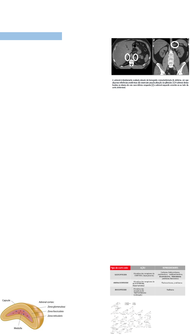 GLÂNDULA ADRENAL As Adrenais são constituídas de duas estruturas funcionais: córtex e medula. A córtex adrenal divide-se em: I: Zona Glomerulosa Produtora de mineralocorticoides II: Zona Fascicular Secretora de glicocorticoides III: Zona Reticular Responsável pela síntese de androgênios. O mecanismo regulador adrenal é o feedback negativo de hormônio circulante (cortisol e testosterona). Exceto na zona Glomerulosa, que é regulada pela pressão arterial e pela concentração sérica de sódio na arteríola eferente no néfron. Por sua vez, a medula adrenal secreta catecolaminas: noradrenalina, adrenalina e dopamina. Existe interação fisiológica entre a medula e a córtex adrenal, sendo que a adrenalina e o cortisol são contrarreguladores da insulina, e o cortisol age como mediador na vasoconstrição adrenérgica. FORMAÇÃO HORMONAL DAS ADRENAIS Os hormônios adrenais derivam de uma fonte comum: ciclopentanoperidrofenantreno (gonano), que é clivado nas adrenais pelo ACTH e nas gônadas pelo LH. Nas adrenais existe uma cascata de formação hormonal que depende da ação de uma série de enzimas que conduzem os substratos no sentido: mineralo-glico-sexocorticoide Farmacologicamente, existe similaridade de ação entre os diferentes tipos de corticoides e sua interação preferencial com determinados receptores dos hormônios adrenais, classificando-os em: DOENÇAS DA ADRENAL INSUFICIÊNCIA ADRENAL É a insuficiência da produção hormonal da córtex adrenal, de forma a ocasionar disfunções e falências em tecidos-alvo. QUADRO CLÍNICO Instalação insidiosa de sintomatologia pouco específica: I: Fadiga e dores musculares II: Anorexia e perda ponderal III: Dor abdominal associada a náuseas e fezes pastosas IV: Alterações no hemograma e anemia, acompanhada ou não por eosinofilia V: Perda de pelos axilares e pubianos Pelos de característica sexual VI: Distúrbios hidreletrolíticos Com avidez por sal VII: Hipoglicemia Caracterizada pela Tríade de Whipple: Glicemia inferior a 50mg/dl, Sintomas Neuroglicopênicos e Reversão dos sintomas após administração de glicose. VIII: Hipotensão Presente apenas na insuficiência adrenal primária. Uma vez que o ACTH não interfere na liberação de aldosterona, a falta desse hormônio na insuficiência adrenocortical central preserva a regulação pressórica pelo sistema renina-angiotensina- aldosterona INSUFICIÊNCIA ADRENAL PRIMÁRIA ETIOLOGIA Doença de Addison I: Adrenalite Autoimune (75%) II: Causas infecciosas e IST Sífilis, Tuberculose, Infecções Fúngicas, AIDS e COVID-19 III: Uso de Drogas que suprimem a formação de Cortisol Cetoconazol e Mitotano IV: Uso de Drogas que aumentam a degradação hepática de Cortisol Antirretrovirais, Rifampicina, Barbitúricos e Fenitoína V: Doenças Congênitas Agenesia e Hipoplasia Adrenal, Hiperplasia Adrenal Congênita e Adrenoleucodistrofia INSUFICIÊNCIA ADRENAL SECUNDÁRIA ETIOLOGIA Administração exógena de corticoide ou ACTH I: Apoplexia Hipofisária Trauma, Necrose, Metástases e Neoplasias (Craniofaringeoma) II: Doenças Congênitas Agenesia Hipofisária, Síndromes Congênitas (Kallmann, Prader Willi, Laurence Moon, Bardet Biedl) e Resistência a Glicocorticoides III: Pós-Operatório de Cirurgia Hipofisária ou Radioterapia Hipofisária IV: Hipopituitarismo Adquirido Lesões Hipotalâmicas ou Hipofisárias comprometendo a secreção de CRH e/ou ACTH, Hipofisite Linfocítica, Sarcoidose, Germinoma, Histiocitose, Síndrome de Sherran, Neoplasias Primárias de Hipófise ou Metástases no SNC SÍNDROME DE NELSON Hiperpigmentação cutâneo-mucosa relacionada à produção excessiva de ACTH por tumor hipofisário secretor de ACTH (associado a efeito de massa intracraniano e compressão do oculomotor e abducente) ou por hipersecreção hipofisária pós- adrenalectomia bilateral. IDENTIFICAÇÃO DE HIPOCORTISOLISMO E DA INSUFICIÊNCIA ADRENAL SÍNDROMES POLIGLANDULARES AUTOIMUNES 50 a 60% dos indivíduos com insuficiência adrenal evoluem com síndromes poliglandulares autoimunes. APS1 Síndrome Poliglandular Autoimune tipo 1, ou poliendocrinopatia autoimune candidíase-distrofia ectodérmica é uma doença autossômica recessiva rara, causada por mutações no gene regulador autoimune (AIRE1) localizado no cromossomo 21q22.3. O AIRE1 atua na seleção negativa de linfócitos T autorreativos, favorecendo o desenvolvimento de autoimunidade. APS2 A Síndrome Poliglandular Autoimune Tipo 2 (APS2) é mais frequente, também acometendo mais o sexo feminino, predominando em adultos Os marcadores imunológicos relacionados são os multigenes HLA B8 e HLA DR3 NEOPLASIA ENDÓCRINA MÚLTIPLA (NEM) NEM1 I: Neoplasia Hipofisária Principalmente Prolactinoma II: Hiperparatireoidismo III: Tumor Pancreático Principalmente Gastrinoma NEM2A I: Carcinoma Medular da Tireoide II: Feocromocitoma III: Hiperparatireoidismo NEM2B I: Carcinoma Medular da Tireoide II: Feocromocitoma III: Neuromas Mucosos IV: Gangliomatose Intestinal V: Constituição Marfanoide FEOCROMOCITOMA Feocromocitomas representam 7 a 10% dos incidentalomas adrenais, aumentando sua incidência se associado ao quadro clínico de cefaleia, taquicardia e sudorese, acompanhado por hipertensão arterial, que oscila com hipotensão postural. Esses paroxismos adrenérgicos geralmente são desencadeados por: manobra de Valsalva, estresse, tabagismo, uso de cafeína, etc. 10% dos casos acomete crianças ou adultos jovens, sendo raro após 60 anos de idade. Não existe exame para prevenir o seu aparecimento HIPERFUNÇÃO DA MEDULA ADRENAL I: Dosagem plasmática e/ou urinária de Catecolaminas e Metanefrinas Positivo para níveis acima de 2000pg/mL de adrenalina e noradrenalina plasmáticas. II: Dosagem de ácido vanilil-mandélico urinário, um parâmetro mais específico e menos sensível que as catecolaminas. INVESTIGAÇÃO DE NEOPLASIA ENDÓCRINA MÚLTIPLA I: Carcinoma Medular de Tireoide Calcitonina e Ultrassom de Tireoide. Na