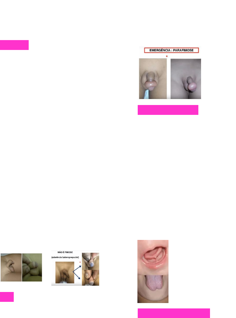 FIMOSE Fimose é a dificuldade ou impossibilidade de expor adequadamente a glande, devido ao excesso de pele que cobre a região. Pode haver, também, um anel fibrótico que impede essa visualização. Ela é fisiológica em 90% dos casos À medida que a criança cresce, ela se solta. Porém, muitas vezes, há tentativa de forçar essa liberação, o que pode levar ao trauma, à fibrose e à fimose “criada”. A cirurgia à correção, quando necessária, é feita após a criança ser desfraldada, cujas exceções são em casos de Balonopostites, ITU de repetição e pacientes religiosos OBS: Parafimose ocorre quando o prepúcio é retraído atrás da coroa do pênis, e não pode ser devolvido para a posição anterior ou normal.. Isso pode causar o aprisionamento do pênis, de forma a prejudicar a drenagem do sangue, o que leva ao edema e à dor ANCILOGLOSSIA É a aderência congênita da língua ao assoalho da boca, em que há dificuldade de exposição da língua Quando há dificuldade para mamar associada, deve-se operar logo e, quando não há, deve-se operar antes de começar a falar Caso a criança já seja maiorzinha e fala errado, deve-se operar e seguir com fonoaudiólogo HÉRNIA UMBILICAL Hérnia umbilical é um deslocamento de tecido pela parede abdominal atrás do umbigo, situação que é, praticamente, fisiológica e que regride espontaneamente na maioria dos RN A idade para a cirurgia, quando o anel possui mais de 1/1,5cm e/ou quando há PRINCÍPIOS DA CIRURGIA PEDIÁTRICA dor, é após 3-5 anos; ela é pouco sintomática e não encarcera Não se deve colocar nem moeda, e nem fita adesiva. A primeira, caso feita, predispõe risco de tétano, e, a segunda, predispõe pneumonia, uma vez que 30% da respiração do RN é abdominal HÉRNIA EPIGÁSTRICA A Hérnia Epigástrica é causada por um enfraquecimento dos músculos da parede abdominal, e surge na linha alba, do xifoide até acima do umbigo, em local de penetração de vasos sanguíneos Neste caso, a gordura pré-peritoneal que costuma ser a responsável por tal herniação Ela pode ser múltipla, e, após o diagnóstico, deve ser feita a cirurgia HÉRNIA INGUINAL Protusão do conteúdo abdominal pelo CPV, através do anel inguinal profundo (hérnia indireta) ou através da parede posterior do canal inguinal (hérnia direta) É um defeito congênito, não relacionado à fraqueza da musculatura INCIDÊNCIA I: 1 a 5%, sendo maior no primeiro ano de vida II: 10 a 30% em prematuros III: Doenças Associadas Criptorquia e Mielomeningocele IV: Sexo, Localização e Risco de Encarceramento OBS: Hérnia da direita é muito mais comum, e o risco de encarceramento é maior em RN masculinos, de forma que deve haver mais atenção ao diagnóstico e preferência à cirurgia precoce EMBRIOLOGIA E PATOGENIA Associada à descida dos testículos e à túnica vaginal, além da persistência do conduto peritônio-vaginal e, na menina, do canal de Nuck ANATOMIA DA REGIÃO INGUINAL I: Limites II: Pele e Tela Subcutânea III: Músculo Oblíquo Externo IV: Músculo Oblíquo Interno V: Músculo Transverso VI: Fáscia Transversalis VII: Trato Iliopúbico APRESENTAÇÃO CLÍNICA E DIAGNÓSTICO I: História Clínica Sugestiva II: Palpação de Cordão Espessado DIAGNÓSTICO DIFERENCIAL I: Criptorquia II: Hidrocele Na hidrocele, o canal inguinal e a bolsa escrotal estão com líquido, mas sem alça intestinal. Na hérnia, há alça intestinal associada e, caso não se feche em um período de 1 ano, indica- se cirurgia OBS: Antes da cirurgia, não se tem uma certeza absoluta quanto a diferenciação supracitada III: Torção de Testículo IV: Transiluminação V: USG TRATAMENTO O tratamento é sempre cirúrgico, e exige anestesia geral Realiza-se uma incisão na pele subcutânea e, pelo anel externo, busca-se o conteúdo, no qual o saco herniário se encontra na parte inferior. Posteriormente, os elementos deste são dissecados Ainda, há identificação do nervo ílio- inguinal e infiltração com anestésico local Na menina, as estruturas são resquícios da dos meninos, que sofreram atrofia por hormônio embrionário. Assim, junto ao saco herniário, encontra-se o ligamento redondo COMPLICAÇÕES Encarceramento de Vísceras Ocorre quando a palpação da massa não é capaz de reduzi-la, o que causa dor importante. Inicialmente, provê-se analgésico e coloca o paciente em posição de cabeça para baixo, na qual se realiza massagem para ver se o conteúdo regride; se não, opera-se Estrangulamento de Vísceras Há isquemia associada, em que existe compressão dos vasos testiculares PÓS OPERATÓRIO E RECORRÊNCIA I: Hospitalização de Curto Período II: Não necessita de antibioticoprofilaxia III: Prematuros e Lactentes menores de 6 meses IV: Recuperação Excelente V: Baixa Recorrência Mais comum quando há fatores de risco HERNIORRAFIA INGUINAL LAPAROSCÓPICA Em pacientes submetidos ao reparo de hérnia inguinal unilateral, há uma chance de 5% a 20% de que uma hérnia se desenvolva no lado contralateral, o que requer uma segunda operação e anestesia para reparar. No reparo aberto, existe um risco potencial de lesão no cordão espermático e nos vasos deferentes, de hematoma, de infecção da ferida, de criptorquidia adquirida, de atrofia testicular e de recorrência da hérnia. As vantagens propostas da técnica laparoscópica incluem: I: Visualização de Defeitos Contralaterais II: Identificação de Hérnias Menos Comum Diretas e Femorais III: Dor Pós-Operatório Diminuída IV: Melhor Resultado Estético V: Retorno mais Rápido à Função Normal As desvantagens potenciais incluem: I: Possível aumento da duração do procedimento e maiores custos operacionais II: Curva de aprendizado III: Necessidade de intubação orotraqueal para a anestesia CONCLUSÕES I: Tempo operatório semelhante quando unilateral e menor na laproscópica quando bilateral II: Mesma taxa de recidiva III: Complicações Hidrocele, Criptorquia Iatrogênica, Infe