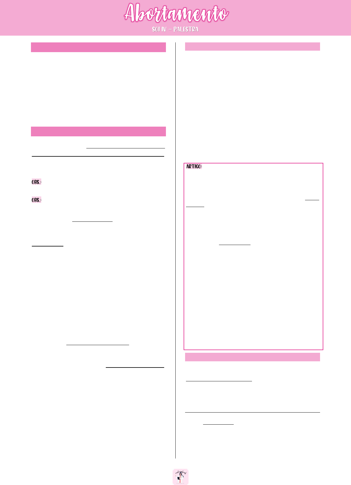 1 Júlia Morbeck – @med.morbeck Objetivos 1- Conhecer sobre a classificação e a epidemiologia do aborto. 2- Investigar sobre a apresentação clínica do aborto (completo, retido, incompleto, infectado e inevitável). 3- Compreender o tratamento farmacológico e mecânico do aborto. 4- Discutir sobre a legislação do aborto. Abortamento ↠ O abortamento é a expulsão de feto pesando menos de 500 g ou com menos de 20 semanas de gestação, podendo ser espontâneo ou provocado (MONTENEGRO; FILHO, 2017). Aborto é o produto do abortamento (embrião ou feto e anexos) (CUNNINGHAM, 2021). É considerado precoce ou de primeiro trimestre até 12 semanas e 6 dias (BRASIL, 2022). ↠ Considera-se perda bioquímica o aborto que ocorre após um teste urinário ou beta-hCG positivo, mas sem diagnóstico ultrassonográfico ou histológico. O termo aborto clínico é utilizado quando a ultrassonografia ou a histologia confirmam que houve uma gravidez intrauterina (BRASIL, 2022). ↠ Nas perdas gestacionais do primeiro trimestre, a morte do embrião ou do feto quase sempre ocorre antes da expulsão espontânea. Em geral, a morte é acompanhada de hemorragia dentro da decídua basal, seguido pela necrose dos tecidos adjacentes, que estimula as contrações uterinas e a expulsão. Um saco gestacional intacto costuma estar cheio de fluido (CUNNINGHAM, 2021). • Um abortamento anembrionado não contém elementos embrionários identificáveis. Embora não seja tão preciso, pode-se utilizar o termo ovo cego. • Os casos restantes são abortamentos embrionados, que em geral apresentam alguma anormalidade do desenvolvimento do embrião, do feto, da vesícula vitelina ou, às vezes, da placenta. ↠ Em contrapartida, nas perdas gestacionais mais tardias, o feto geralmente não morre antes da expulsão e, assim, outras razões para o abortamento devem ser investigadas (CUNNINGHAM, 2021). EPIDEMIOLOGIA ↠ Mais de 80% dos abortamentos espontâneos ocorrem nas primeiras 12 semanas de gestação (CUNNINGHAM, 2021). ↠ A magnitude do abortamento no mundo é desconhecida, uma vez que em diversos países ocorre ilegalidade parcial ou total para a realização do mesmo. Os dados epidemiológicos acerca do aborto são subclínicos devido a muitas vezes acontecerem sem que a mulher reconheça que está abortando ao confundir a expulsão do concepto com um sangramento menstrual, já os clinicamente reconhecidos chegam a incidência de 10-15%, destes, 80% ocorrem antes das 12 semanas (SANARFLIX). Aborto no Brasil: o que dizem os dados oficiais? (CARDOSO et al., 2020). Segundo um estudo com base em estimativas da Organização Mundial da Saúde (OMS), aproximadamente 55 milhões de abortos ocorreram entre 2010 e 2014 no mundo, sendo 45% destes considerados abortos inseguros. África, Ásia e América Latina concentram 97% dos abortos inseguros. O estudo mostrou ainda que leis restritivas aumentam a ocorrência desses. A ilegalidade, contudo, não impede a prática, estando relacionada à desigualdade social e permanecendo como um problema de ordem global. A OMS define aborto inseguro como um procedimento para o término da gestação, realizado por pessoas sem a habilidade necessária ou em um ambiente sem padronização para a realização de procedimentos médicos, ou a conjunção dos dois fatores. Apesar dos avanços científicos capazes de proporcionar um abortamento seguro para a mulher, abortos inseguros continuam a ocorrer, causando aumento dos custos ao sistema de saúde, complicações e mortes maternas. A análise do SIM mostrou que, entre 2006 e 2015, foram registrados no Brasil 770 óbitos com causa básica aborto. Entre 2006 e 2015, os óbitos por aborto foram mais frequentes na faixa etária de 20-29 anos no Brasil. Apenas no ano de 2007 a faixa de 30-39 anos registrou um número maior de óbitos. Todas as regiões também apresentaram o maior volume de óbitos na faixa de 20-29 anos no conjunto dos anos analisados. ETIOLOGIA ↠ O aborto espontâneo único decorre, muitas vezes, de alterações cromossômicas. Entretanto, em várias ocasiões, não é possível esclarecer a causa da perda (BRASIL, 2022). FATORES FETAIS ↠ Os fatores fetais são representados, principalmente, pelas aneuploidias, e 75% das perdas por anormalidades cromossômicas ocorrem em até 8 semanas. A taxa de 2 Júlia Morbeck – @med.morbeck aborto e de aneuploidias diminui com o avançar da idade gestacional (BRASIL, 2022). A monossomia do X (45, X) é a anormalidade cromossômica específica isolada mais frequente. Ela é chamada síndrome de Turner, a qual em geral resulta em abortamento, embora existam casos descritos de fetos vivos do sexo feminino. Por outro lado, a monossomia autossômica é rara e incompatível com a vida (CUNNINGHAM, 2021). FATORES MATERNOS Os mais comuns fatores de risco identificados em mulheres com abortamento precoce são a idade materna avançada e a história de perda anterior (MONTENEGRO; FILHO, 2017). Os abortos de gestações euploides são mais tardios que as aneuploides. Ou seja, a taxa de abortamento euploides atinge um pico em torno de 13 semanas. Além disso, a incidência de abortamento euploides aumenta acentuadamente depois da idade materna de 35 anos (CUNNINGHAM, 2021). ↠ Qualquer doença materna grave, traumatismo ou intoxicação, além de inúmeras infecções, podem levar ao abortamento (MONTENEGRO; FILHO, 2017). Infecções ↠ Alguns vírus, bactérias e parasitas comuns que invadem o ser humano normal podem infectar a unidade fetoplacentária por transmissão pelo sangue. Outros podem causar infecções localizadas depois de colonização ou infecção geniturinária. Entretanto, apesar das diversas infecções adquiridas na gravidez, esta não é uma causa comum de abortamento precoce (CUNNINGHAM, 2021). Doenças clínicas ↠ Há riscos importantes associados com diabetes melito mal controlado, obesidade, doença da tireoide e lúpus eritematoso sistêmico. Nestes e em ou