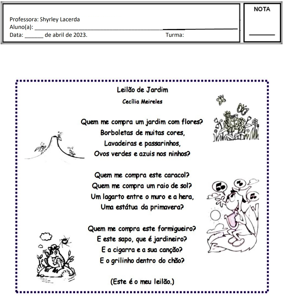 302 Escola Municipal Santa Tereza Prova de Língua Portuguesa – 1º Bimestre 50 pontos 1- O texto que você leu é: (Valor: _____/2 pontos) (A) uma receita (B) uma notícia de jornal (C) um conto de fadas (C) um poema 2- De acordo com o texto responda às questões a seguir. (Valor: _____/8 pontos) a) Qual é o título do texto? ________________________________________________________________________________________ b) Quem é o autor do texto? ________________________________________________________________________________________ c) Verso é cada linha de um poema. Quantos versos tem o poema que você leu? ________________________________________________________________________________________ d) Estrofe é um conjunto de versos. Quantas estrofes tem o poema? ________________________________________________________________________________________ 3- O que está a venda na poesia acima? (Valor: _____/5 pontos) ________________________________________________________________________________________ ________________________________________________________________________________________ 4- Rima é a repetição de sons semelhantes no final das palavras proporcionando sonoridade, ritmo e musicalidade. Transcreva do poema dois pares de rimas de cada estrofe. (Valor: _____/6 pontos) 1ª estrofe: ________________________________________________________________________________________ ________________________________________________________________________________________ 2ª estrofe: ________________________________________________________________________________________ ________________________________________________________________________________________ 3ª estrofe: ________________________________________________________________________________________ ________________________________________________________________________________________ 5- Escreva as palavras do quadro a seguir em ordem alfabética. (Valor: _____/4 pontos) __________________________________________________________________________________________________ __________________________________________________________________________________________________ __________________________________________________________________________________________________ __________________________________________________________________________________________________ __________________________________________________________________________________________________ __________________________________________________________________________________________________ 6- Separe as palavras em sílabas e classifique-as em monossílabas, dissílabas, trissílabas ou polissílabas. (Valor: _____/6 pontos) Palavra Divisão silábica Número Classificação borboletas jardim ovos chão passarinhos caracol 7- No poema “Leilão de Jardim”, de Cecília Meireles, aparecem os nomes de alguns animais. Escreva o nome deles no espaço abaixo e depois encontre-os no caça-palavras. (Valor: _____/8 pontos) 1- _______________________________________ 5- ________________________________________ 2- _______________________________________ 6- ________________________________________ 3- _______________________________________ 7- ________________________________________ 4- _______________________________________ 8- ________________________________________ 8- Substitua os símbolos por letras e forme o feminino de: (Valor: _____/3 pontos) 9- Escreva os nomes que estão no quadro abaixo no seu respectivo quadro, separando-os em duas colunas: substantivos próprios e substantivos comuns. (Valor: _____/4 pontos) 10- Use o acento agudo ( ) ou circunflexo (^) e acentue as palavras corretamente. (Valor: _____/4 pontos)fabrica – lapis – tenis – relampago – domino trico – cafe – silencio – pagina – pessego · Crie duas frases usando uma ou mais palavras do quadro acima. a) ______________________________________________________________________________________ b) ______________________________________________________________________________________ O que você aprende de verdade jamais é perdido e quanto mais estudar com concentração e qualidade, mais aprenderá. É por meio do estudo você encontrará tudo que precisa para conquistar seus sonhos.