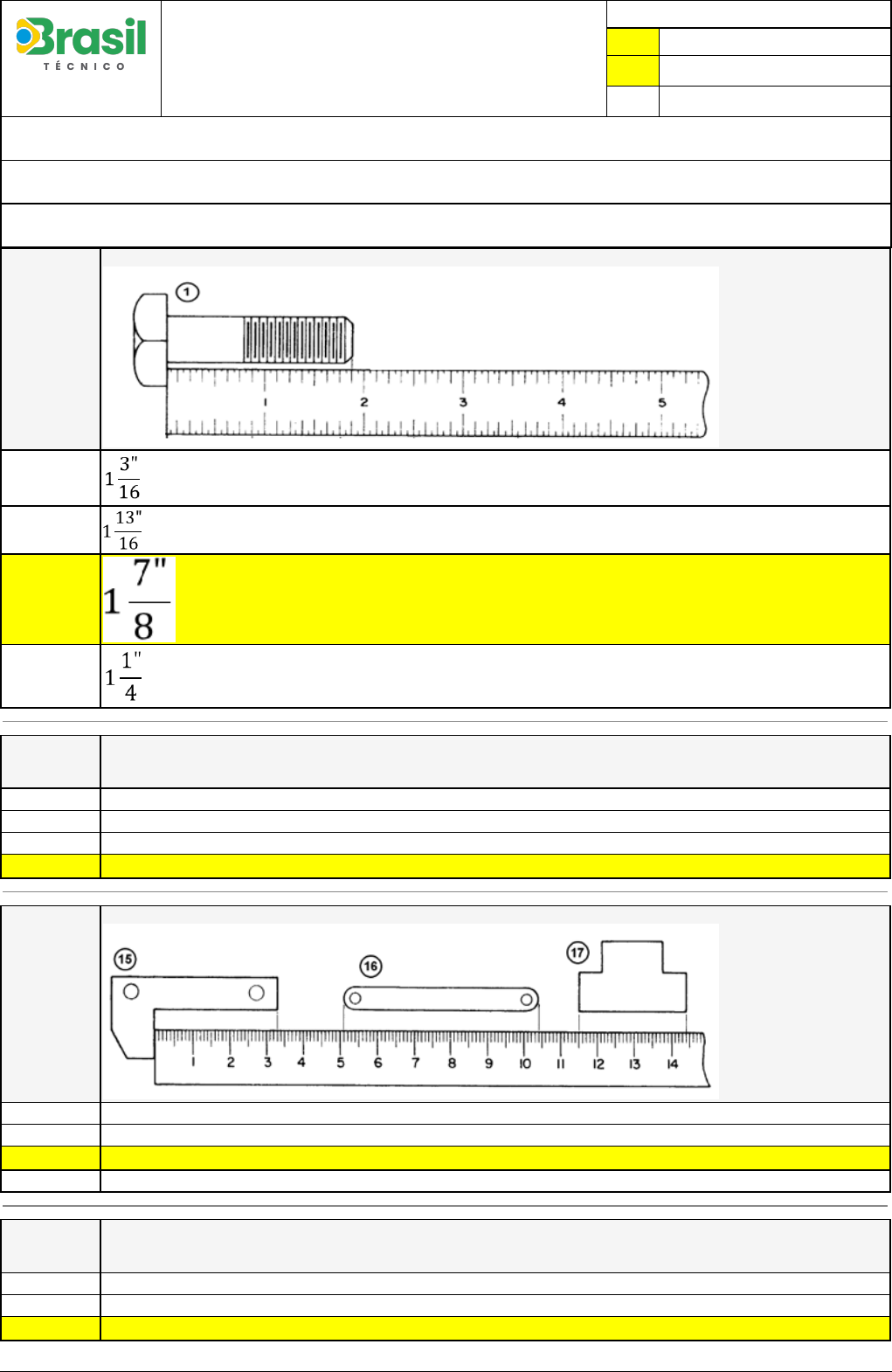 Pincel Atômico - 17/07/2023 09:15:46 1/2 PATRICK NEVES DE CARVALHO Exercício Caminho do Conhecimento - Etapa 4 (15343) Atividade finalizada em 17/07/2023 09:13:46 (1089068 / 1) LEGENDA Resposta correta na questão # Resposta correta - Questão Anulada X Resposta selecionada pelo Aluno Disciplina: METROLOGIA [534375] - Avaliação com 4 questões, com o peso total de 6,50 pontos [capítulos - 102] Turma: Curso Técnico: Mecânica - Grupo: BT PRES JAN/23 - BT PRES MEC V1 [77082] Aluno(a): 91417968 - PATRICK NEVES DE CARVALHO - Respondeu 4 questões corretas, obtendo um total de 6,50 pontos como nota [350184_28176] Questão 001 Dada a figura baixo, qual é a medida do objeto 1 em polegadas ? X [350185_40897] Questão 002 As réguas de profundidade são utilizadas para: Apenas material ferroso. Peças cilindricas. Faces irregulares. X Medição de rasgos e furos. [350186_28175] Questão 003 Dada a figura abaixo, quais são as medidas dos objetos 15, 16 e 17 em centímetros? 3,2; 10,4; 14,5 3,4; 10,4; 14,4 X 3,3; 5,3; 2,9 3,5; 5,3; 2,8 [350185_28174] Questão 004 Dos instrumentos apresentados abaixo, qual deles fornece medições rápidas e baixa precisão ? Goniômetro. Paquímetro. X Régua universal. Pincel Atômico - 17/07/2023 09:15:46 2/2 Relógio comparador.