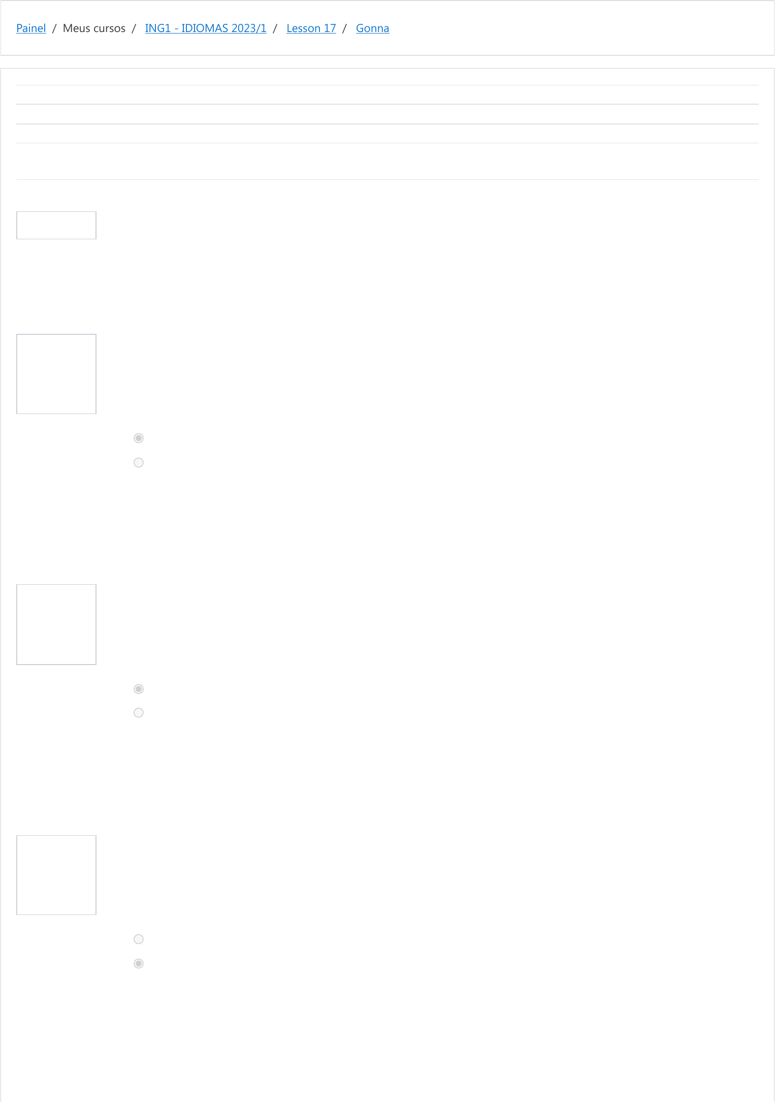 Painel / Meus cursos / ING1 - IDIOMAS 2023/1 / Lesson 17 / Gonna Informação Questão 1 Correto Atingiu 2,00 de 2,00 Questão 2 Correto Atingiu 2,00 de 2,00 Questão 3 Correto Atingiu 2,00 de 2,00 Iniciado em segunda, 17 jul 2023, 11:35 Estado Finalizada Concluída em segunda, 17 jul 2023, 11:37 Tempo empregado 1 minuto 46 segundos Avaliar 10,00 de um máximo de 10,00(100%) Billy is inviting Anderson to watch a movie at a friend's house. Listen to the conversation and aswer the questions. Check T (true) or F (false) Billy is gonna study on Saturday night. Escolha uma opção: F T Sua resposta está correta. A resposta correta é: F They boys are gonna watch a horror movie at Billy's house. Escolha uma opção: F T Sua resposta está correta. A resposta correta é: F They are gonna watch a movie at Tracy's house. Escolha uma opção: F T Sua resposta está correta. A resposta correta é: T https://moodle.ifsul.edu.br/novohamburgo/my/ https://moodle.ifsul.edu.br/novohamburgo/course/view.php?id=336 https://moodle.ifsul.edu.br/novohamburgo/course/view.php?id=336#section-26 https://moodle.ifsul.edu.br/novohamburgo/mod/quiz/view.php?id=53483 Questão 4 Correto Atingiu 2,00 de 2,00 Questão 5 Correto Atingiu 2,00 de 2,00 Lily is gonna be there Escolha uma opção: F T Sua resposta está correta. A resposta correta é: F They are gonna have some pizza Escolha uma opção: F T Sua resposta está correta. A resposta correta é: T ◄ Packing Documents Seguir para... Christine goes to New York ► https://moodle.ifsul.edu.br/novohamburgo/mod/quiz/view.php?id=53482&forceview=1 https://moodle.ifsul.edu.br/novohamburgo/mod/url/view.php?id=53484&forceview=1