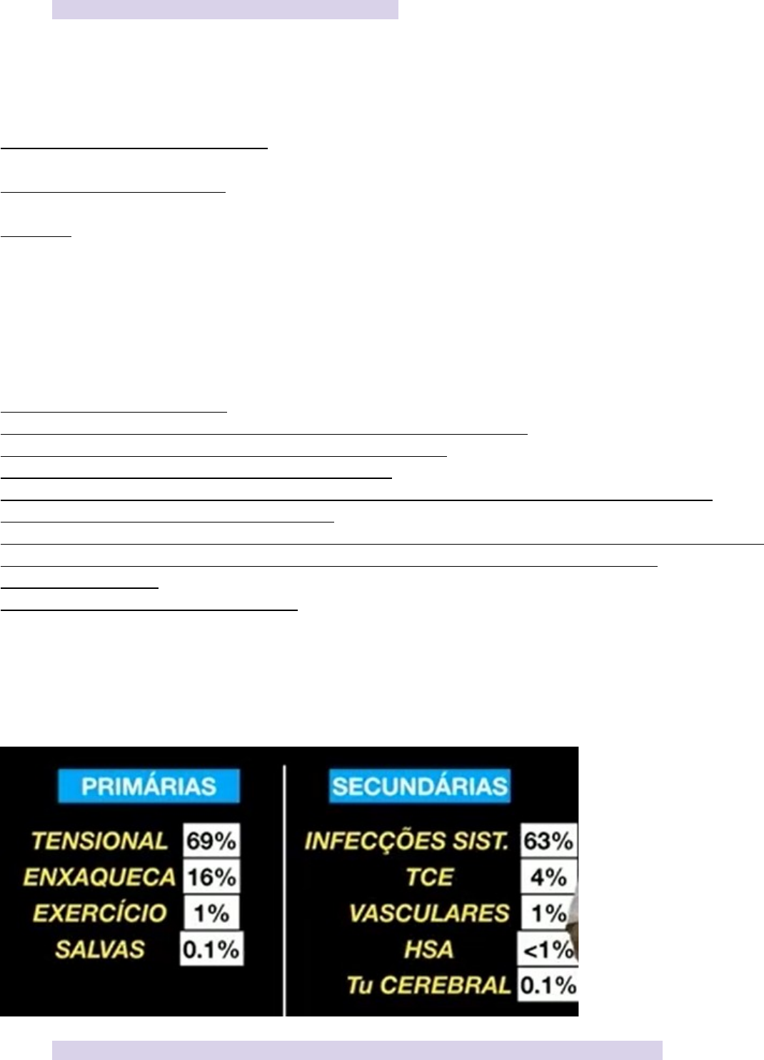 CEFALEIA E ENXAQUECA 1. identificar as principais causas de cefaleia CLASSIFICAÇÃO - Pela Classificação Internacional de Cefaleias da International Headache Society - 2013 1. primária: não é associada a lesões estruturais anatomicamente visíveis e causadas por mecanismos de disfunção neuroquímica e neurofisiológica do sistema nervoso · mais comum até os 50 anos → enxaqueca ou migrânea (16%): · 15-30% dos indivíduos e 9% deles apresentam episódios de cefaleia → cefaleia tipo tensão (69%) · em 35 a 78% da população e 3% apresentam episódios incapacitantes de dor → outras: cefaléia idiopática em facadas/pontadas, cefaleia da tosse, cefaleia do esforço físico (1%), cefaleia associada a atividade sexual, cefaleia hípnica, cefaleia em trovoada ou thunderclap headache, cefaléia por compressão extrínseca, cefaléia por estímulo frio, cefaleia numular e a nova cefaleia persistente diária. 2. secundária: associadas a lesões patológicas, como nas aneuralgias e dores neuropáticas do segmento cefálico. · a partir dos 50/60 anos → atribuída a infecção (63%) → atribuída a trauma craniano ou cervical (pós traumáticas) (4%) → atribuída à doença vascular craniana ou cervical (1%) → atribuída à doença intracraniana não vascular → atribuída ao uso de substâncias químicas, drogas, medicamentos ou à sua supressão → atribuída a transtornos da homeostase → dor crânio facial atribuída ao transtorno de ossos cranianos, pescoço, olhos, ouvidos, nariz, seios da face, dentes, boca, articulação temporomandibular a outras estruturas cranianas/cervicais → atribuída a transtorno psiquiátrico 3. neuralgias cranianas, dor facial primária e outras → neuralgias cranianas, dor facial neuropática e dor facial central (cefaléia por compressão externa, por estímulo frio, enxaqueca oftalmoplégica e dor facial atípica) → cefaleias, nevralgias e dores faciais não classificáveis ou não especificados 2. explicar os mecanismos fisiopatológico a das principais causas de cefaleia FISIOPATOLOGIA CEFALEIA → a dor é fisiologicamente decorrente de estímulos nociceptivos originados no tecido. Se identifica uma lesão tecidual pela dor, é possível sentir dor por um componente neuropático, ou seja, tem alteração de vias nociceptivas centrais sem que haja estímulo nociceptivo tecidual. As cefaleias podem ser causadas por 2 mecanismos: · estímulos nociceptivos teciduais: as estruturas da cabeça que doem são escalpo (pele que recobre a calota craniana), artérias meníngeas, seios durais, foice, segmentos proximais das artérias piais. · lesão ou ativação das vias nociceptivas gerando dor de padrão central: há 3 sistemas principais → sistema trigeminovascular (porção terminal desses nervos do trigêmeo estão em contato com vasos do crânio), tálamo ventro póstero medial (onde estão localizados neurônios do marcapasso do ritmo circadiano) e hipotálamo (sistema modulador descendente - sistema que emite neurônios cujos axônios fecham a porteira da dor, essas vias modulam o funcionamento dos sistemas). FISIOPATOLOGIA ENXAQUECA/MIGRÂNEA Sensibilização das terminações nervosas perivasculares com liberação de neuropeptídeos (CGRP, neuropeptídeo Y), que geram inflamação neurogênica e ativam fibras sensitivas trigeminais causando dor. CEFALEIA EM SALVAS, CLUSTER HEADACHE OU CEFALEIA DE HORTON → fisiopatologia: ativação da porção posterior do hipotálamo, seguida por ativação dos neurônios sensitivos trigeminais. 3. diferenciar as apresentações clínicas das diferentes causas MIGRÂNEA CEFALEIA TENSIONAL CEFALEIA EM SALVAS localização unilateral bilateral em faixa, frontal, occipital unilateral na região orbital e têmporas características fases: 1.pródromo: irritabilidade, raciocínio lento, desânimo 2.aura: dura até 60 min 3.cefaleia de forte intensidade, latejante 4.recuperação: exaustão início gradual, pulsátil, intensidade moderada a severa, piora com atividade física tipo pressão ou aperto surge no final do dia, se relaciona ao estresse físico, muscular ou emocional dor súbita, aumento de intensidade da dor em minutos, dor contínua e lancinante, evolui em surtos de 1-3 meses de duração com 1-8 crises por dia Pct desperta a noite pelas crises aparência do pct prefere ambiente silencioso e sem luz paciente pode estar ativo ou desejar descansar paciente ativo, inquieto duração 4-72 horas 30 min - 7 dias (variável) 30 minutos a 3 horas sintomas associados náuseas, vômitos, fonofobia, fotofobia e pode haver aura nenhum lacrimejamento e olho vermelho ipsilateral a dor, rinorreia, obstrução nasal e sensibilidade ao álcool → características da principais cefaleias secundárias · meningite: dor aguda, intensa, rigidez de nuca e febre · hemorragia subaracnóidea: em trovoada - hiperaguda (máximo de 5 min), rigidez de nuca SEM febre → paciente está bem e do nada vem a dor · tumor: insidiosa, remitente, mais arrastada, dor grave em 30% dos casos, piora com esforço e posição, vômitos precede a dor · arterite temporal: idosos 50+ anos, dor à palpação, claudica mandíbula, polimialgia reumática (40%), febre, perda ponderal, VHS alto (baixo não exclui) · glaucoma: intensa, inicia com dor ocular e vermelhidão (midríase fixa) → enxaqueca/migrânea: · pródromo: irritabilidade, raciocínio lento, desânimo, preferência por alimentos · aura: dura até 60 minutos, com distúrbios visuais associados a disfasia · Cefaleia de forte intensidade, latejante e dura de 4-72 horas. · sintomas associados: náuseas, vômitos, fotofobia, fonofobia · recuperação: exaustão → cefaleia tensional: · frontal, occipital ou holocraniana · pode melhorar na atividade física · dura cerca de 30 min a 7 dias · surge no final da tarde e se relaciona ao estresse físico, muscular ou emocional · pode ter hiperestesia e hipertonia da musculatura pericraniana percebida a palp