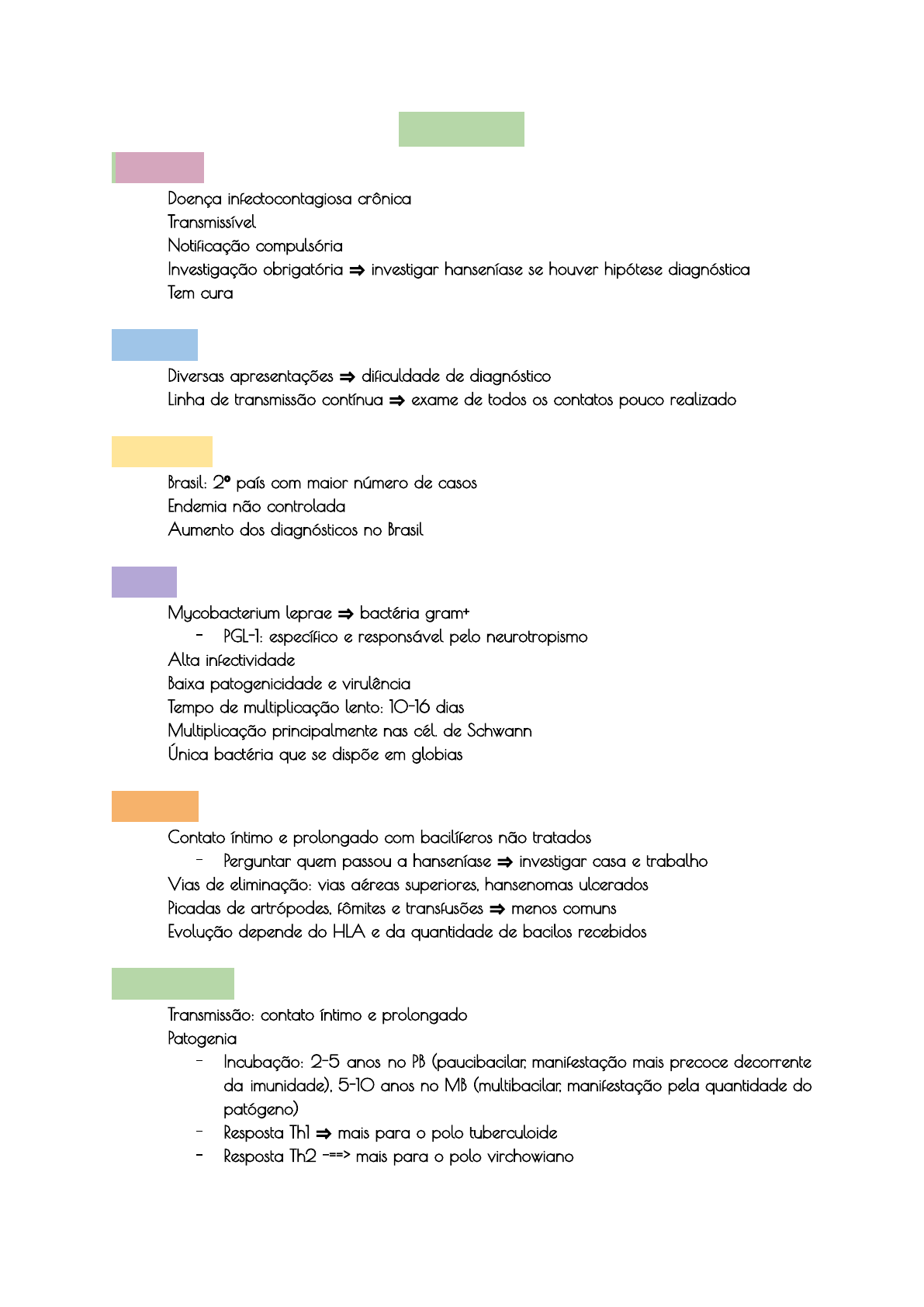 Hansenías� importância ● Doença infectocontagiosa crônica ● Transmissível ● Notificação compulsória ● Investigação obrigatória ⇒ investigar hanseníase se houver hipótese diagnóstica ● Tem cura dificuldades ● Diversas apresentações ⇒ dificuldade de diagnóstico ● Linha de transmissão contínua ⇒ exame de todos os contatos pouco realizado epidemiologia ● Brasil: 2º país com maior número de casos ● Endemia não controlada ● Aumento dos diagnósticos no Brasil Etiologia ● Mycobacterium leprae ⇒ bactéria gram+ - PGL-1: específico e responsável pelo neurotropismo ● Alta infectividade ● Baixa patogenicidade e virulência ● Tempo de multiplicação lento: 10-16 dias ● Multiplicação principalmente nas cél. de Schwann ● Única bactéria que se dispõe em globias transmissão ● Contato íntimo e prolongado com bacilíferos não tratados - Perguntar quem passou a hanseníase ⇒ investigar casa e trabalho ● Vias de eliminação: vias aéreas superiores, hansenomas ulcerados ● Picadas de artrópodes, fômites e transfusões ⇒ menos comuns ● Evolução depende do HLA e da quantidade de bacilos recebidos 10 mandamentos ● Transmissão: contato íntimo e prolongado ● Patogenia - Incubação: 2-5 anos no PB (paucibacilar, manifestação mais precoce decorrente da imunidade), 5-10 anos no MB (multibacilar, manifestação pela quantidade do patógeno) - Resposta Th1 ⇒ mais para o polo tuberculoide - Resposta Th2 -==> mais para o polo virchowiano Classificação ● Indeterminada ● Tuberculóide ● Dimorfa tuberculóide ● Dimorfa dimorfa ● Dimorfa virchowiana ● Virchowiana Baciloscopia ● Isquemia do lobo da orelha e perfuração de 2mm com a lâmina do bisturi, raspagem e análise microscópica ● Exame complementar ● Possibilidade de falso negativo ● Não esperar resultado para iniciar tratamento ● Índice Baciloscópico (Ridley) - Quantitativo ● Índice morfológico - Qualitativo (microrganismo vivo ou morto) teste de mitsuda ● Avalia a resistência ● Valor prognóstico ● Auxiliar na classificação ● Positivo (reage ao antígeno): menor chance de ter hanseníase ● Negativo (não reage ao antígeno): maior chance de ter hanseníase prova da histamina ● Não há formação do eritema reflexo secundário em paciente ccom hanseníase Sensibilidade tátil ● Teste mais importante para prevenir incapacidade ⇒ detecta precocemente a diminuição ou ausência de sensibilidade protetora da pele ● Monofilamentos de semmes-weinstein (ou ponta de caneta, algodão) ● fio dental nos olhos ● Quanto mais grosso precisa ser o fio para o paciente sentir, maior a perda Sensibilidade térmica ● Tubo de ensaio (quente e frio) em área sã ⇒ comparar com área de lesão - O paciente não sente o quente na área da lesão Sensibilidade dolorosa ● Alfinete/agulha ● Perguntar se o paciente sente a ponta ou a cabeça - Alteração se o paciente não conseguir identificar Força motora ● Perda em pacientes com a doença em estágio mais desenvolvido Definição de Caso ● Lesão com alteração de sensibilidade ● Acometimento de nervo periférico, com ou sem espessamento neural, associado a alterações sensitivas e/ou motoras e/ou autonômicas ● Baciloscopia + esfregaço intradérmico Lesões neurais ● Precedem as manifestações cutâneos devido ao tropismo para nervos periféricos ● Espessamento de troncos neurais ● Perda de sensibilidade em mãos e pés ● Nervo mais acometido: ulnar - Mão em garra - Amiotrofia dos enterócitos ● Ramúsculos nervosos: alterações essencialmente sensitivas ● Troncos neurais: lesões motoras, alterações simpáticas, distúrbios sensitivos Quadro Clínico- Hanseníase Indeterminada ● Mitsuda + ou - ● Baciloscopia negativa (primeira manifestação da doença) ● lesão hipocrômica ou eritêmato-hipocrômica ● Maioria: única sensibilidade alterada é a térmica ● Pode ter perda de pelo ● 70% evolui para cura espontânea Hanseníase Tuberculóide ● Th1 ● Paucibacilar: baciloscopia negativa ● Mitsuda +++ (boa resposta imune celular) ● Tendência à cura espontânea ● Máculas ou placas eritematosas, eritemato-acastanhadas ou hipocrômicas bem delimitadas (lesão única) ● Assimétricas ● Troncos nervosos acometidos em pequeno número Hanseníase Tuberculóide Nodular na Infância ● Crianças de 2-4 anos, filhos de mais MHV ● Baciloscopia negativa ● Mitsuda Positiva ● Pápulas ou nódulos Hanseníase Virchowiana ● Multibacilar ● Mitsuda negativo ⇒ sem resistência ● Baciloscopia +++ ● Lesões polimorfas: máculas, placas, nódulos, etc. ● Distribuição simétrica ● Madarose (infiltração perianexial) ● Pavilhão auricular espessado, fácies leonina ⇒ várias lesões na face com cabelo preservado ● Nervos: acometimento extenso Hanseníase Dimorfa ou Borderline ● Maioria dos casos ● Resistência imune ou celular intermediária ● Mitsuda positivo (mais para tuberculóide) ou negativo (mais para virchowiano) ● Baciloscopia muitas vezes negativo ● Lesões de aspecto tuberculóide em maior número ● Pode ter acometimento de vários troncos nervosos Hanseníase Dimorfa Dimorfa ● Forma mais imunologicamente instável ● Mitsuda negativo na maioria das vezes ● Baciloscopia positiva ● Lesões bizarras em grande quantidade ⇒ placas esburacadas, limites nítidos na parte interna, limites imprecisos na parte externa Hanseníase Dimorfa Virchowiana ● Mitsuda negativo ● Baciloscopia sempre positiva ● Lesões menos polimorfas ⇒ predomínio de numerosas placas e nódulos acastanhados ● Pode ter incapacidades graves, reações tipo 1 e tipo 2 Classificação ● Paucibacilar: indeterminado e tuberculóide ● Multibacilar: dimorfo e virchowiano Tratamento ● 3 semanas do início ⇒ não transmite mais por vias aéreas ● Rifampicina, Clofazimina e Dapsone ⇒ pauci ou multibacil