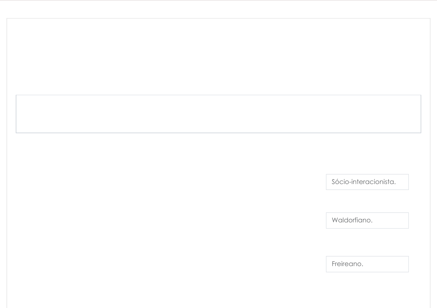 20/07/2023, 14:44 4.5 Teste seus conhecimentos: Revisão da tentativa https://moodle.ifrs.edu.br/mod/quiz/review.php?attempt=13368335&cmid=292080 1/7 Iniciado em quinta, 20 jul 2023, 14:31 Estado Finalizada Concluída em quinta, 20 jul 2023, 14:44 Tempo empregado 13 minutos 2 segundos Avaliar 9,00 de um máximo de 10,00(90%) Questão 1 Correto Atingiu 1,00 de 1,00 Associe os conceitos com os termos. Acredita que a aprendizagem se dá pela interação da pessoa com a sociedade e que o conhecimento se constrói ao longo da vida. O professor tem o papel de incentivar progressos que teriam dificuldade ou não aconteceriam normalmente. É o método utilizado nas escolas Waldorf. Incentiva a autonomia e desenvolvimento humano, levando em conta suas individualidades. Através de três diferentes divisões de faixa etária, designa o desenvolvimento de atividades corporais, manuais e artísticas, focando em questões da natureza e necessidades do dia a dia. Estimula o pensamento crítico e o desenvolvimento cognitivo, a partir das experiências do dia-a-dia dos alunos. Foi utilizado para alfabetizar trabalhadores rurais, os quais foram alfabetizados em 40 horas. Vale ressaltar a liberdade e autonomia, visto que o professor também aprende com os alunos, rompendo a educação elitista. Sócio-interacionista. Waldorfiano. Freireano. 20/07/2023, 14:44 4.5 Teste seus conhecimentos: Revisão da tentativa https://moodle.ifrs.edu.br/mod/quiz/review.php?attempt=13368335&cmid=292080 2/7 Questão 2 Correto Atingiu 1,00 de 1,00 Questão 3 Correto Atingiu 1,00 de 1,00 Aprendizes sequenciais tendem a processar as informações de forma linear, em etapas logicamente encadeadas. Escolha uma opção: Verdadeiro Falso Associe os conceitos com os termos. Método com total autonomia do aluno, pois ele estudará sozinho e é quem irá decidir o que e como estudar, pela sua curiosidade e independência. O professor tem o papel de auxiliar os alunos nas dificuldades que encontrarem. A mais comum no Brasil e no mundo. O professor com papel de protagonista na transmissão do conhecimento, aluno com postura passiva. Nesse método o estudante possui então, falta de autonomia. Aluno com postura ativa, estimulando o seu senso crítico. O papel do professor é o de intermediar as atividades que incentivem o aluno em seu aprendizado. Montessoriano. Tradicional. Construtivista. 20/07/2023, 14:44 4.5 Teste seus conhecimentos: Revisão da tentativa https://moodle.ifrs.edu.br/mod/quiz/review.php?attempt=13368335&cmid=292080 3/7 Questão 4 Incorreto Atingiu 0,00 de 1,00 Questão 5 Correto Atingiu 1,00 de 1,00 Podemos dizer que organização de ensino são as formas de organização de um currículo. A estratégia de ensino Reativa tem lições com base nas dúvidas e questões do aluno. A reação do tutor é obtida através da simulação dos efeitos e implicações que as ideias do aluno provocam no conhecimento e no domínio de atuação do tutor. 20/07/2023, 14:44 4.5 Teste seus conhecimentos: Revisão da tentativa https://moodle.ifrs.edu.br/mod/quiz/review.php?attempt=13368335&cmid=292080 4/7 Questão 6 Correto Atingiu 1,00 de 1,00 As estratégias constituem as informações de como ensinar e que devem gerar uma sequência de táticas de modo a efetivar a apresentação de conteúdos, as questões relevantes e exercícios importantes, além da condução do ensino. Escolha uma opção: Verdadeiro Falso 20/07/2023, 14:44 4.5 Teste seus conhecimentos: Revisão da tentativa https://moodle.ifrs.edu.br/mod/quiz/review.php?attempt=13368335&cmid=292080 5/7 Questão 7 Correto Atingiu 1,00 de 1,00 Questão 8 Correto Atingiu 1,00 de 1,00 Associe os conceitos com os estilos de aprendizagem. O reconhecimento de que você percebe e processa as informações de forma diferente dos seus colegas já começa a ajudar. É recomendável, ao ler um material pela primeira vez, procurar entender quais os objetivos pretendidos, além disso, procurar ter uma ideia completa do assunto, evitando curtos períodos de leitura e ter que voltar várias vezes. Compreende e retêm melhor a informação se percebe como ela se relaciona com o mundo real. Pode se sentir desconfortável ao participar de uma aula em que o assunto é tratado de uma forma teórica e abstrata. Retém melhor a informação se identificar maneiras de utilizá-la de forma prática. É recomendável trabalhar ou estudar com um grupo, no qual os integrantes expliquem diferentes tópicos uns aos outros. Perfil global. Perfil sensorial. Perfil ativo. Para ser um aprendiz eficiente e bom solucionador de problemas, você precisa estar apto a utilizar as dimensões e .sensorial intuitiva 20/07/2023, 14:44 4.5 Teste seus conhecimentos: Revisão da tentativa https://moodle.ifrs.edu.br/mod/quiz/review.php?attempt=13368335&cmid=292080 6/7 Questão 9 Correto Atingiu 1,00 de 1,00 Questão 10 Correto Atingiu 1,00 de 1,00 Associe os conceitos com os termos. É um plano de ações, isto é, uma sequência de ações denominadas táticas de ensino, com o objetivo de que o aluno possa alcançar uma aprendizagem efetiva, seguindo suas características psicopedagógicas. É a forma da apresentação do conteúdo a ser ensinado ou aprendido pelo aluno. É a seleção e o sequenciamento do conteúdo a ser apresentado ao aluno. Estratégia. Instrução (de acordo com Halff, 1988). Currículo (de acordo com Halff, 1988). Para aprendizes sequenciais, o domínio do conhecimento se dá por etapas, que vão sendo sucessivamente superadas. Escolha uma opção: Verdadeiro Falso 20/07/2023, 14:44 4.5 Teste seus conhecimentos: Revisão da tentativa https://moodle.ifrs.edu.br/mod/quiz/review.php?attempt=13368335&cmid=292080 7/7 ◄ 4.4 Mapeamento de Estilos de Aprendizagem e Estratégias de Ensino Seguir para... 5.1 Avaliação da aprendizagem ► https://moodle.ifrs.edu.br/mod/page/view.php?id=292079&forceview=1 https://moodle.ifrs.edu.br/mod/page/view.php?id=292082&forceview=1