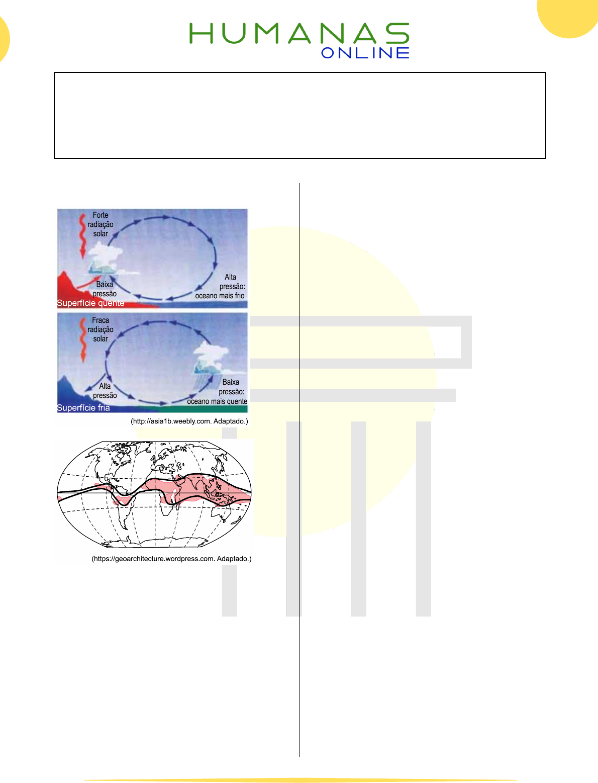 1 1. Observe as imagens e o mapa. O fenômeno esquematizado nas imagens, cuja área de ocorrência está delimitada no mapa, corresponde a) à condensação atmosférica, responsável pelo resfriamento do ar úmido em superfície, o que resulta na ocorrência de orvalho e de nevoeiro. b) às monções de inverno e de verão, caracterizadas por sistemas de circulação atmosférica que determinam períodos de seca e chuva. c) à frente estacionária, classificada como uma frente fria sem movimentação por um longo período, o que resulta em chuvas torrenciais. d) à inversão térmica, provocada pela resistência aos movimentos de ar verticais que formam as precipitações convectivas. e) às ressacas, constituídas por episódios de ventos fortes em direção ao litoral que geram ciclones extratropicais. 2. Com relação ao clima e ao relevo do continente asiático, o maior e mais populoso continente do mundo, é correto afirmar que a) os climas predominantes são o siberiano, o mediterrâneo, o tropical úmido, o desértico e o de monções. b) na porção oeste faz fronteira com a Europa, sendo também delimitado pelo Mar Mediterrâneo e Mar Cáspio. c) o clima de monções ocorre no litoral da Índia e acontece em virtude das diferenças de pressão atmosférica entre a parte continental e a parte oceânica próxima ao continente. d) o Everest faz parte de uma cadeia de montanhas denominada Cordilheira dos Alpes, fruto do choque entre duas placas tectônicas. e) é banhado por três oceanos: a leste pelo Pacífico, ao norte pelo Glacial Ártico e ao Sul pelo Atlântico. 3. As equipes de resgate trabalham contra o tempo neste domingo [23.06.2013] para salvar os milhares de pessoas que permanecem ilhadas no norte da Índia devido aos deslizamentos de terra e às inundações provocadas pelas chuvas, que podem ter provocado mil mortes. As pesadas chuvas, que atingem o subcontinente de junho a setembro, costumam provocar alagamentos, mas começaram mais cedo este ano, pegando muitas pessoas de surpresa e expondo a falta de preparo para prever e enfrentar a situação. http://noticias.terra.com.br. Adaptado. As chuvas torrenciais abordadas pelo texto estão associadas ao fenômeno climático denominado a) Monções de verão. b) El Niño. c) La Niña. d) Monções de inverno. e) Aquecimento global. GEOGRAFIA FISICA (FRENTE A) CLIMATOLOGIA V Aulas 43, 44 e 45 - Aula 43 – Massas de Ar II; Aula 44 - Fenômenos Climáticos I; Aula 45 – Fenômenos Climáticos II Exercícios: Climatologia V – Lista 21 2 4. As figuras a seguir representam tipos climáticos predominantes no Sul e no Sudeste asiático. As imagens retratam monções de a) verão (chuvosa) e de inverno (seca). b) verão (seca) e de inverno (chuvosa). c) inverno (chuvosa) e de verão (seca). d) inverno (seca) e de verão (chuvosa). 5. A foto abaixo registra uma das frequentes enchentes que ocorrem em Bangladesh. Os temporais que atingem anualmente a população de vários países asiáticos são resultado a) do aquecimento global, que provoca alterações climáticas e atinge indistintamente todos os continentes. b) das chuvas de Monções, provenientes do Oceânico Índico, que ocorrem no verão e são muito intensas no sudeste deste continente. c) do El Niño, que provoca chuvas intensas na costa pacífica da América do Sul e seca em outros locais. d) da falta de estrutura das cidades asiáticas, que submete a população pobre a morar em áreas de riscos. e) dos ventos alísios provenientes dos trópicos que provocam chuvas nas regiões equatoriais. 6. “A disposição da massa de terras asiáticas e do Oceano Índico gera uma circulação atmosférica singular: o regime dos ventos de monções”. Fonte: MAGNOLI, D. e ARAÚJO, R.. Geografia: Paisagem e Território. São Paulo: Moderna, 2001. Considerando o regime dos ventos de monções, é incorreto afirmar que a) caracteriza o verão, com chuvas torrenciais nos vales fluviais e inundações em áreas urbanas. b) se refere ao movimento de gangorra dos centros de baixa pressão atmosférica que se alternam sazonalmente entre o oceano e o continente. c) se trata de uma dinâmica permanente que caracteriza o clima semiárido da Ásia Ocidental e do Sudeste Asiático. d) se percebe que os atrasos das chuvas, a sua escassez ou excesso causam perdas de safras e graves prejuízos a uma imensa população. 7. As precipitações geralmente são classificadas de acordo com sua origem ou com o processo responsável pela formação das massas de ar. As precipitações orográficas ocorrem quando a) formam-se células convectivas com movimentos verticais. b) o relevo atua como uma barreira física à advecção do ar. c) o ar úmido ascende de forma forçada ao longo de suas rampas. d) formam-se células de alta pressão com movimentos verticais descendentes. 8. A Amazônia brasileira possui um elevado índice médio anual de chuvas que se reflete nitidamente em diversos aspectos paisagísticos. Essas chuvas dominantes na região são decorrentes: a) da ascensão do ar em face das elevações do Planalto Central e da cobertura vegetal nele predominante. b) dos baixos valores de evapotranspiração potencial existentes na região. c) da ascensão do vapor d’água das partes mais inferiores da troposfera; o ar aquecido ascendente se resfria e se condensa. d) do encontro de massas de ar termicamente diferentes com predomínio de anticiclones. e) da baixa nebulosidade dominante e das densas florestas perenifólias que propiciam a ascensão orográfica do ar úmido. 3 9. Os três principais tipos de chuva são: 1) chuva frontal, 2) chuva de relevo ou orográfica, e 3) chuva de convecção ou chuva de verão. Analise as proposições sobre os tipos de chuva. I. As chuvas orográficas ocorrem em alguns lugares do planeta onde barreiras de relevo obrigam as massas de ar a atingir altitudes superiores, o que causa queda de temperatura e condensação do vapor. II. Chuvas de convecção ocor