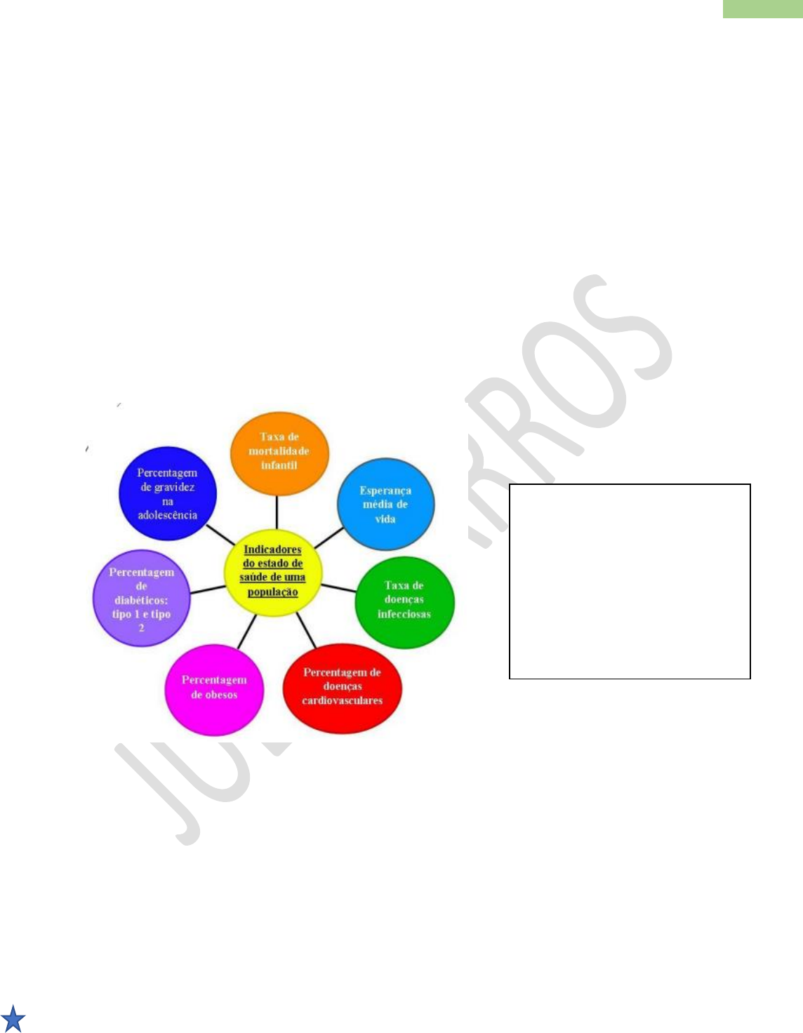 1 Resumo Epidemiologia – P2 – Por Júlia Barros Aula 01: INDICADORES DE SAÚDE “Um indicador de saúde deve revelar a situação de saúde de um indivíduo ou população”. “É uma medida que reflete uma característica ou aspecto particular, via de regra, não sujeitos à observação direta”. Indicadores são medidas que contêm informação relevante sobre determinados atributos e dimensões do estado de saúde, bem como do desempenho do sistema de saúde. Devem refletir a situação sanitária de uma população e servir para a vigilância das condições de saúde. São medidas que contêm informações relevantes sobre como anda o sistema de saúde, simplificando, são a matéria-prima essencial para a análise de saúde. Instrumento de mensuração para o gerenciamento, avaliação e planejamento das ações em saúde. Possibilita mudanças efetivas nos processos e nos resultados, por meio do estabelecimento de metas e ações prioritárias que garantam a melhoria contínua e gradativa de uma situação ou agravo. Segundo a OMS, os indicadores de saúde têm com o objetivo: I- Avaliar a higidez; II- Fornecer subsídios aos planejamentos de saúde; III- Permitir o acompanhamento das flutuações e tendências históricas do padrão sanitário de diferentes coletividades em diversos períodos de tempo. Essa temática tem sido estudada internacionalmente, pela necessidade de relacionar situações de vida entre diferentes países, estados ou comunidades num horizonte temporal. Características importantes para a escolha de um indicador: - Apresentar simplicidade técnica: o indicador deve ser de fácil entendimento e percepção; - Deve ter uniformidade; PERMITEM: - Avaliar o estado de saúde da população; - Melhorar, manter ou prevenir doenças; - Planejar, avaliar e administrar as ações de saúde. 2 Resumo Epidemiologia – P2 – Por Júlia Barros - Deve atingir o maior número possível de variáveis; - Permite comparações entre situações; - Principalmente deve ser confiável; - É relevante respeitar os aspectos éticos. O que saber: o que são indicadores de saúde e como caracterizá-los; saber a importância de escolher os indicadores de saúde adequados para avaliar o resultado das ações realizadas pela equipe de Atenção Primária à saúde. Para escolher um tipo de indicador, devemos nos preocupar com três fatores fundamentais: - Eficiência (custo e benefício) – ato de fazer; diz respeito a um trabalho bem feito; é quando algo é realizado da melhor maneira possível, ou seja, com menos desperdício ou em menor tempo. - Eficácia (obtenção dos objetivos propostos) – fazer o que precisa ser feito; é quando um projeto/produto/pessoa atinge o objetivo ou a meta; - Efetividade (resultados) - é a capacidade de fazer uma coisa (eficácia) da melhor maneira possível (eficiência). Assim o melhor indicador é aquele que reúne os três “E” e nos fornece as respostas às nossas indagações. Os dados obtidos serão representados através da FREQUÊNCIA ABSOLUTA (valor total de ocorrência do problema) e da FREQUÊNCIA RELATIVA (amostra – população em estudo (índice, coeficientes ou taxas)). Os principais indicadores utilizados são: - Mortalidade / sobrevivência; - Morbidade / gravidade / incapacidade: taxa de indivíduos portadores de determinada doença dentro de um grupo específico, a partir de certo período de análise; - Nutrição / crescimento e desenvolvimento; - Aspectos demográficos; - Condições socioeconômicas; - Saúde ambiental; - Serviços de saúde. Além da avaliação do nível de vida, os indicadores de saúde são utilizados para: I- Identificação dos principais problemas de saúde pública; II- Elaboração de políticas; III- Avaliação da efetividade das ações de prevenção e assistência. Classificação dos Indicadores segundo a OMS (1957): - Saúde de indivíduos ou de populações (ou sua falta): medidas de mortalidade, morbidade, estado nutricional, demográficas, fatores de risco, satisfação com o próprio estado de saúde. 3 Resumo Epidemiologia – P2 – Por Júlia Barros - Condições do meio ambiente: saneamento - acesso à água tratada; rede de esgoto sanitário; qualidade do ar; - Serviços de saúde: indicadores de insumos (N° de médicos por 1.000 habitantes ), indicadores de processo (proporção de gestantes atendidas no pré-natal) e indicadores de resultado (incidência de sífilis congênita (tendo em vista sua eliminação)). Os indicadores de saúde são expressos por meio de medidas de frequência, tais como: proporções (taxas - estimam o risco de ocorrência de um problema de saúde, como adoecimento, ou a morte em relação a uma determinada população suscetível, por unidade de tempo) e coeficientes (número de casos em uma população de um determinado local, por um tempo determinado. Os números absolutos não são utilizados para avaliar o nível de saúde, pois não levam em conta o tamanho da população. Desta forma, os indicadores de saúde são construídos por meio de razões (Frequências Relativas), em forma de proporções ou coeficientes. Como expressar os resultados? 1. EM FREQUÊNCIA ABSOLUTA: Valor total de ocorrência do problema; são pouco utilizadas em Epidemiologia, pois não permitem medir o risco de uma população adoecer ou morrer por determinado agravo. 2. EM FREQUÊNCIA RELATIVA: são mais utilizadas quando se deseja comparar a ocorrência dos problemas de saúde em populações distintas ou na mesma população ao longo do tempo. 3. EM ÍNDICE. Coeficiente ou Taxa (Geral) Expressa a velocidade ou a intensidade com que um fenômeno qualquer varia. Ex.: Casos de doença: 5000 População exposta: 500.000 5000/500.00 X Constante Ano: 2004 Proporção (Específico) Expressa o quociente entre duas frequências de mesma unidade, ou seja, no denominador estão subconjuntos dos eventos registrados no numerador. Razão Expressa o quociente entre 2 fre