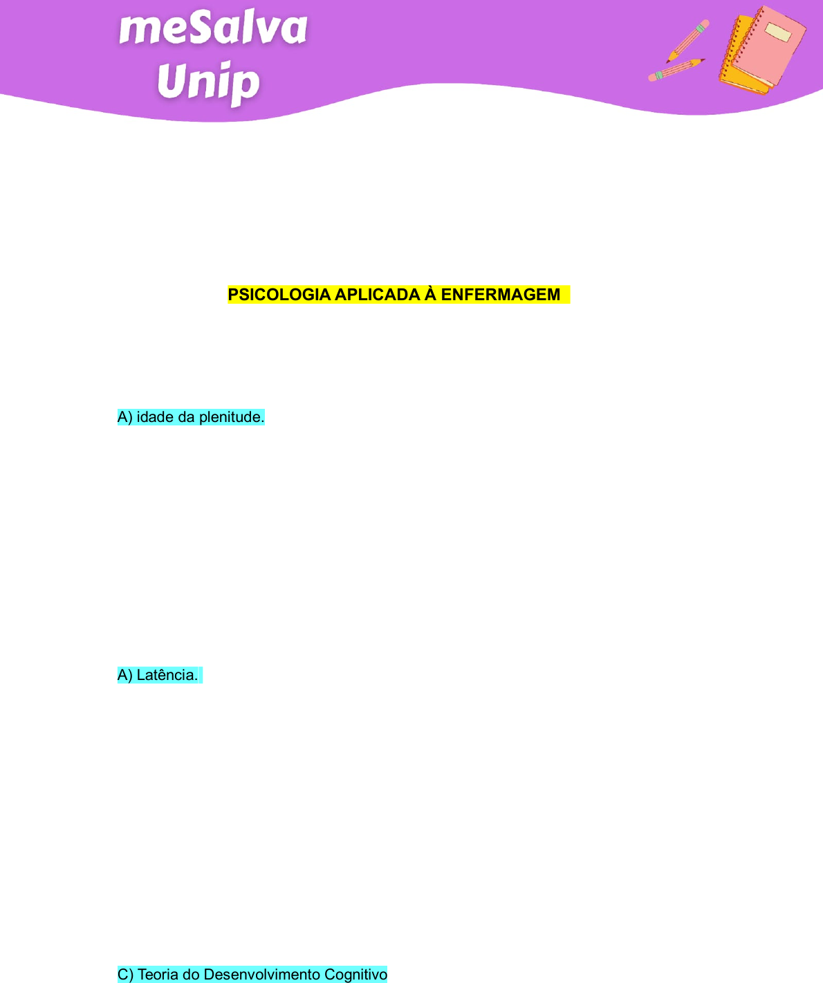 PSICOLOGIA APLICADA À ENFERMAGEM Questão 1: A idade do amadurecimento é também considerada: A) idade da plenitude. B) idade da juventude. C) idade da decadência. D) idade da transferência. E) idade da afetividade. Questão 2: Qual dos estágios de desenvolvimento psicossexual abaixo se caracteriza por uma ausência de ligação da libido a um determinado objeto? A) Latência. B) Anal. C) Oral. D) Fálico. E) Sensório-motor. Questão 3: A Teoria de Jean Piaget chama-se: A) Teoria do Desenvolvimento Humano. B) Teoria do Desenvolvimento do Processo Ensino Aprendizagem. C) Teoria do Desenvolvimento Cognitivo. D) Teoria do Desenvolvimento Afetivo Emocional. E) Teoria da Psicanálise. Questão 4: No século XIX, a Psicologia Científica se estabelece com Wundt em qual contexto? A) Clínica. B) Social. C) Laboratório. D) Sala de aula. E) Hospitalar. Questão 5: O que define a Psicologia enquanto científica? I. Objetivo e campo de estudo. II. Métodos e teorias. III. Clínica e laboratório. IV. Experimento e subjetividade. A) I e II estão corretas. B) II e III estão corretas. C) III e IV estão corretas. D) Somente a alternativa IV está correta. E) Nenhuma das alternativas. Questão 6: Os séculos XIX e XX se destacam pelo desenvolvimento de diferentes teorias, também no campo da Psicologia. Com isso, assinale a alternativa que corresponde às correntes teóricas do século XIX: A) Behaviorismo, humanismo e associacionismo. B) Gestalt, psicanálise e humanismo. C) Psicanálise, behaviorismo e estruturalismo. D) Gestalt, cognitivismo e humanismo. E) Estruturalismo, funcionalismo e associacionismo. Questão 7: A juventude pode ser denominada: I. segunda adolescência. II. adolescência superior. III. período de amadurecimento adolescente. IV. vida matrimonial. A) Somente as afirmativas I e II estão corretas. B) Somente as afirmativas II e III estão corretas. C) Somente as afirmativas I, II e III estão corretas. D) Somente as afirmativas III e IV estão corretas. E) Todas as afirmativas estão corretas. Questão 8: As Explicações dentro da teoria do desenvolvimento podem ser fundadas em perspectivas de ordem hereditária, ambiental, se as pessoas são passivas ou ativas e se o desenvolvimento se dá de modo contínuo e/ou etapista. Com isso, assinale a alternativa que corresponde ao conceito de desenvolvimento etapista: A) Apenas considera o desenvolvimento anterior. B) Segue o modelo mecanicista, tratando as pessoas como máquinas. C) Série de etapas distintas de ordem qualitativa. D) Segue o modelo organicista, em que o sujeito é ativo em seu desenvolvimento. E) É a estrutura do pensamento. Questão 9: Para Freud, aquilo que é ativamente reprimido e impedido de se tornar consciente denomina-se: A) inconsciente. B) eu C) corpo. D) cérebro. E) intelecto. Questão 10: Qual das características abaixo não é encontrada no adolescente? A) Independência. B) Ambivalência. C) Escolha de parceiro sexual. D) Reparação. E) Conflito.
