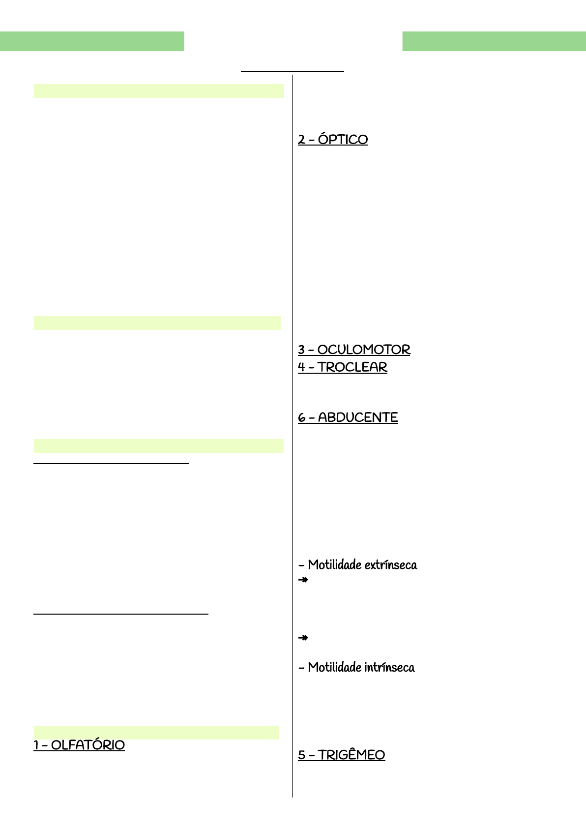 1 Integradora - HAM 2 Enízia Simões - 2º período SINAIS MENÍNGEOS—----------------- TESTE DE BRUDZINSKI - Examinador flexiona a cabeça do paciente, e o sinal é positivo se tiver uma reação de flexão espontânea de quadril e joelho, além da dor TESTE DE KERNIG - Perna deve estar flexionada a 90 graus e depois o examinador estica o joelho. É positivo quando o paciente sente dor ao estender o joelho *Positivo em UMA perna: radiculopatia *Positivo nas DUAS perna: irritação meníngea RIGIDEZ NA NUCA - Examinador flete a cabeça do paciente, se o movimento for fácil não tem rigidez SINAIS RADICULOPATIA—------------- -Testa compressão de raízes nervosas LASÉGUE - Estende a perna e o sinal é positivo de tiver dor (em 30 graus de elevação mais ou menos) LASEGUE SENSIBILIZADO/BRAGARD - Estende a perna igual em lasegue e faz dorsiflexão do pé REFLEXOS—------------------------- SUPERFICIAIS/CUTÂNEO - Reflexo cutâneo plantar: se o paciente fletir os dedos significa sinal de Babinski positivo. Em condições normais espera-se uma flexão ou nenhuma reação. Indica lesão da via piramidal ou corticoespinhal - Reflexo cutâneo abdominal:(vai de T8 a T12) resposta normal é a contração de músculos abdominais, com leve deslocamento da cicatriz umbilical para o lado afetado. Indica lesão na via piramidal PROFUNDOS/TENDINOSOS *Cada reflexo de estiramento envolve segmentos espinais - Reflexo aquileu: S1 - Reflexo patelar: L2, L3 e L4 - Reflexo supinador(braquiorradial): C5 e C6 - Reflexo bicipital: C5 e C6 - Reflexo tricipital(cotovelo): C6 e C7 NERVOS CRANIANOS---------------- 1 - OLFATÓRIO - Função: olfação - emerge do bulbo olfatorio Parosmia: ocorre uma distorção, ou seja, o cheiro sentido é diferente do normal/ do que devia sentir - Anosmia: perda de olfato 2 - ÓPTICO - Função: visão central (acuidade visual), periférica (campo visual) e fundos oculares. As imagens são recolhidas na retina por meio dos cones e bastonetes, e conduzidas ao centro da visão no lobo occipital - Emergência cranial é o canal óptico e encefálica é o quiasma óptico - Acuidade visual (tabela de snellen) *Ambliopia: diminuição da acuidade - Campo visual (até onde pode ver) - Fundoscopia *Visão de túnel: perda de visão periférica, pode ser um tumor na base do crânio 3 - OCULOMOTOR 4 - TROCLEAR - emerge do véu medular (posterior a ponte e o bulbo) 6 - ABDUCENTE - Avalia o reflexo motor e a ptose palpebral (OCULOMOTOR) - abducente emerge do sulco bulbo pontino - Inspecionar pupilas (OCULOMOTOR) *Anisocoria: diferença entre pupilas *Isocórica: tem mesmo diâmetro e reagem igualmente a luz - Função: motricidade ocular extrínseca e intrínseca do olho - Motilidade extrínseca ↠ Tendo predomínio de algum músculo do globo ocular, pode ocorrer o estrabismo (desvio do olho), podendo ser horizontal (convergente ou divergente) ou vertical (superior ou inferior) ↠ Paciente desloca os olhos no sentido horizontal e vertical - Motilidade intrínseca *Discoria: tem diferença nas pupilas *Midríase: diâmetro da pupila aumentado (dilata) *Miose: diminui de tamanho (contrai) *Reflexo fotomotor consensual: contração da pupila contrária ao estímulo 5 - TRIGÊMEO - Função: Sensibilidade facial: e motricidade dos músculos mastigatórios - emergência encefálica entre a ponte e o pedúnculo cerebral médio - Palpar músculos masseter e temporal, pedindo que o paciente cerre a mandíbula (observar força de contração muscular) - Pedir para mover mandíbula de um lado e para outro - Reflexo córneo-palpebral (contração das pálpebras é reflexo normal) - Avaliar sensibilidade superficial e dolorosa 7 - FACIAL - Função: Mímica facial; secreção das glândulas lacrimal, sublingual e submandibular; gustação dos 2/3 anteriores da língua - emerge do sulco bulbo pontino - Pedir para fazer ações de mímica facial e perguntar sobre o paladar *Na paralisia unilateral observa-se lagoftalmia (olho sempre aberto), ausência do ato de piscar, desvio da boca para o lado normal. * Paralisia periférica: toda a hemiface é comprometida. Olho não fecha (quando tenta fechar aparece só o branco do olho - sinal de bell) testa não enruga e boca desvia para o lado contrário da lesão. Lesão no núcleo do facial (na ponte), ou abaixo desse núcleo (fibras que sai da ponte) e a lesão de um lado, causa paralisia do mesmo lado. * Paralisia central: Somente a metade inferior da face se mostra alterada. Olho fecha, testa enruga e boca desvia para o lado contrário da paralisia. A lesão se localiza acima do núcleo do facial (lesão de um lado, paralisia do outro) 8- VESTIBULOCOCLEAR - Função: equilíbrio e audição - Emerge do sulco bulbo pontino - AUDIÇÃO (COCLEAR) -Prova de rinne: diapasão da região mastóide e depois próximo ao ouvido. Em condições normais, rinne positivo. Transmissão óssea (mastóide) mais prolongada do que o aéreo, é rinne negativo e significa alguma deficiência auditiva de condução. -Prova de weber: diapasão no meio do crânio. Normalmente o som é ouvido igualmente, se tiver laterização, tem perda auditiva *Hipoacusia condutiva: som lateraliza para o lado afetado *Hipoacusia neurossensorial: som é localizado pela orelha não afetada - EQUILÍBRIO (VESTIBULAR) -Paciente queixa vertigem, náuseas vômitos e desequilíbrio -Romberg é positivo quando o paciente desequilibra para o mesmo lado que foi lesado 9 - GLOSSOFARÍNGEO E 10 - VAGO - Na lesão unilateral desses nervos, observa-se: desvio do véu palatino para o lado normal e disfagia (dificuldade para engolir) e diminuição do reflexo de vômito 11 - ACESSÓRIO - Inerva o músculo esternocleidomastoideo e parte superior do trapézio - Pedir ao paciente que levante os ombros contra a resistência do sua mão, verificando força e contração do trapézio - Pedir para movimentar a cabeça contra a resistência da sua mão, observando força do esternocleidomastoideo 12 - HIPOGLOSSO 