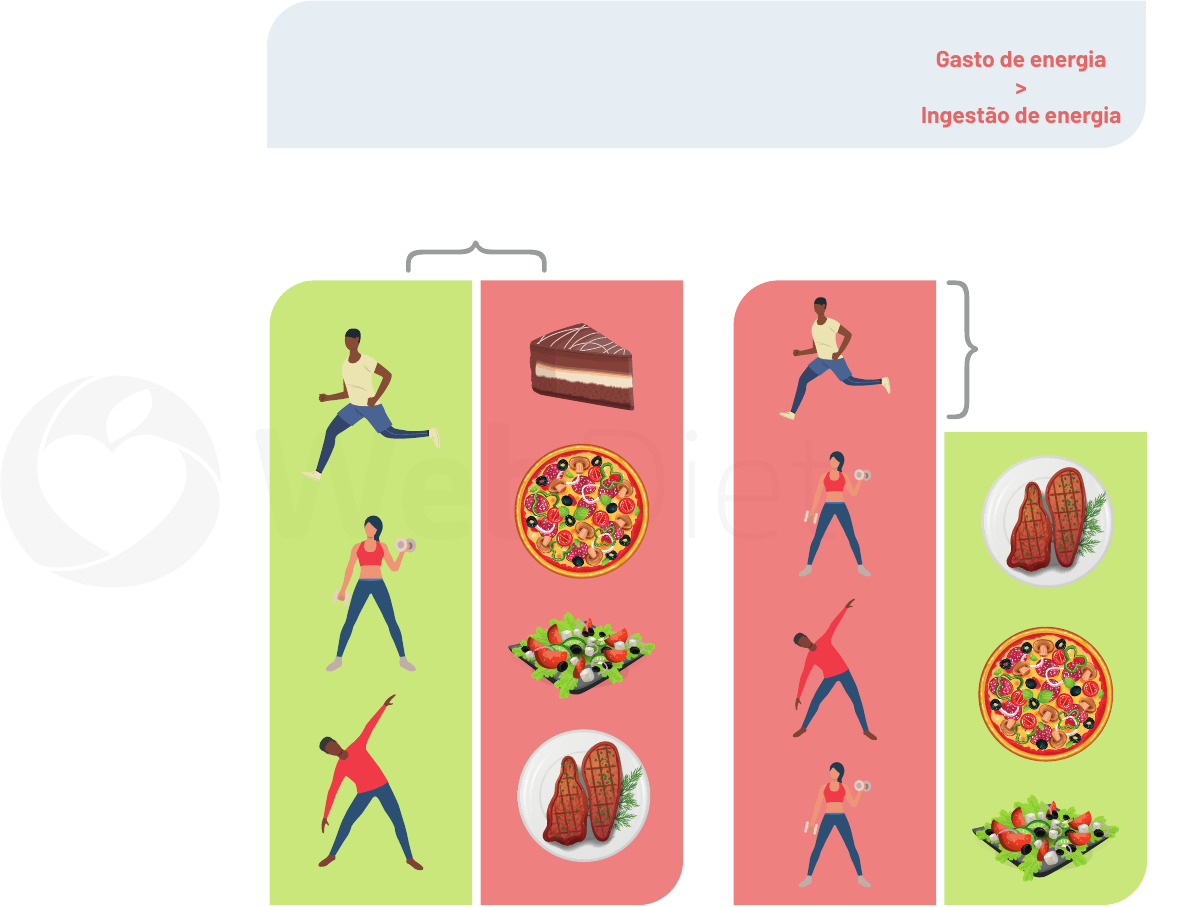 Entendendo o que é déficit calórico Referências: Lam, Yan Y., and Eric Ravussin. "Analysis of energy metabolism in humans: A review of methodologies." Molecular metabolism 5.11 (2016): 1057-1071. Taxa metabólica basal (TMB): Refere-se à energia necessária para sustentar o corpo em repouso e representa cerca de 70% do gasto energético total (GET) em indivíduos sedentários. A massa livre de gordura é o determinante mais forte e responde por 70% de sua variância. Balanço energético neutro SUPERÁVIT CALÓRICO: Gasto de energia < Ingestão de energia DÉFICIT CALÓRICO: Gasto de energia > Ingestão de energia BALANÇO ENERGÉTICO NEUTRO: Gasto de energia = Ingestão de energia Atividade física: É o componente mais variável do GET, responsável pela energia consumida no trabalho muscular durante a atividade física (atividades diárias como: caminhar, pegar ônibus etc.) ou atividade programada (exercícios como: musculação, natação etc.). Efeito térmico dos alimentos (TEF): Refere-se ao gasto de energia necessária para digerir, absorver, assimilar e armazenar nutrientes e, portanto, é influenciado pela composição de macronutrientes na dieta. O TEF foi relatado como 5-10%, 0-3% e 20-30% do conteúdo energético de carboidratos, lipídios e proteínas, respectivamente. Diariamente nosso corpo gera um gasto de energia, e os componentes responsáveis por esse dispêndio são: Gasto de energia 2000 calorias Ingestão de energia 2000 calorias Déficit calórico Gasto de energia 2100 calorias Ingestão de energia 1700 calorias
