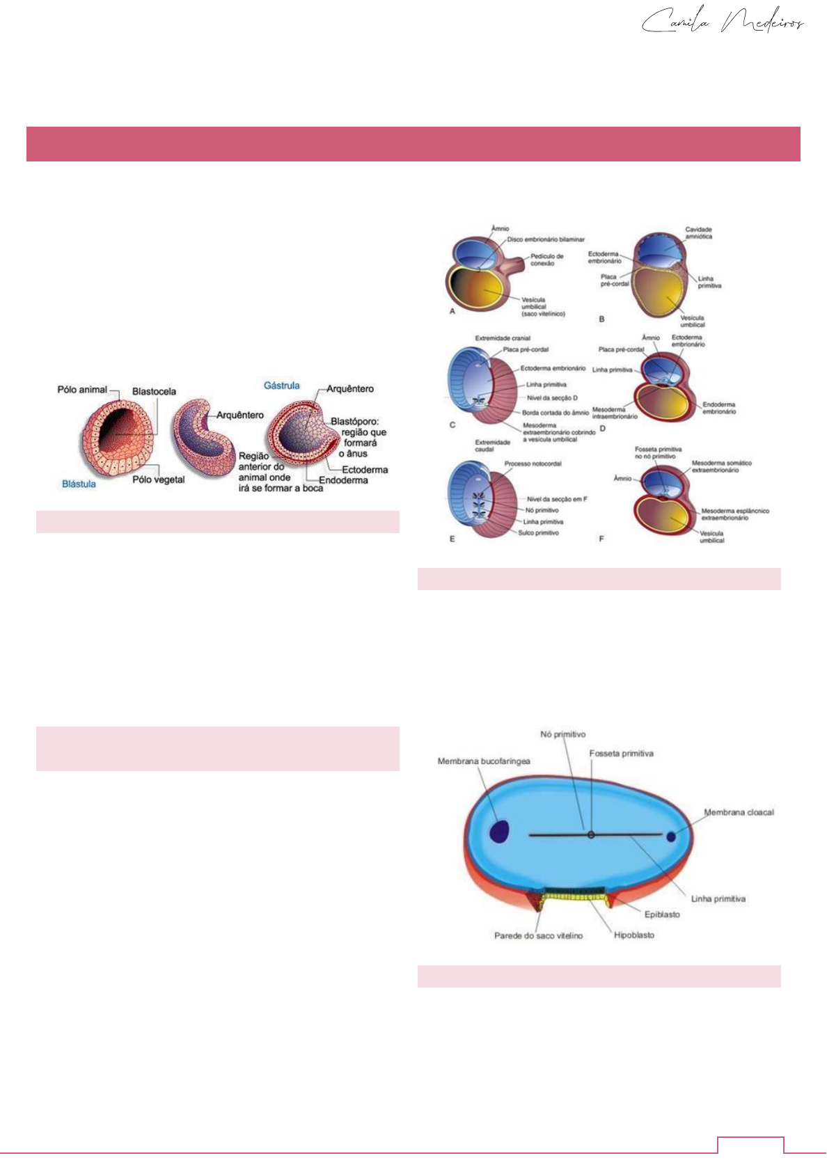 1 A gastrulação é uma etapa crítica do desenvolvimento embrionário que ocorre após a implantação do blastocisto no útero. É durante a gastrulação que as células do embrião se reorganizam e formam as três camadas germinativas primárias: o ectoderma, o mesoderma e o endoderma. Essas camadas germinativas darão origem aos diferentes tecidos e órgãos do corpo, desempenhando um papel fundamental na formação da estrutura básica do organismo. INÍCIO DA GASTRULAÇÃO A gastrulação começa com o início da migração e a reorganização das células do embrioblasto, que é a massa interna de células do blastocisto. Uma depressão aparece na superfície do embrioblasto, formando uma estrutura chamada estria primitiva. A estria primitiva é uma estrutura fundamental durante a gastrulação, pois é a partir dela que as células começam a se mover e se rearranjar para formar as três camadas germinativas. FORMAÇÃO DAS CAMADAS GERMINATIVAS À medida que as células migram, elas se organizam em três camadas distintas: 1. Ectoderma: A camada mais externa é o ectoderma, que dará origem a várias estruturas, incluindo a pele, o sistema nervoso (incluindo o cérebro e a medula espinhal) e os órgãos dos sentidos (como os olhos e os ouvidos). 2. Mesoderma: O mesoderma é a camada intermediária e dará origem a tecidos e órgãos, como os músculos, os ossos, o sistema circulatório, os sistemas excretor e reprodutivo, e partes dos sistemas respiratório e digestivo. 3. Endoderma: A camada mais interna é o endoderma, que dará origem ao revestimento interno do trato digestivo, incluindo o revestimento do estômago, intestinos, fígado, pâncreas e pulmões. FORMAÇÃO DA LINHA PRIMITIVA Durante a gastrulação, a estria primitiva se alonga e forma uma estrutura conhecida como linha primitiva. A linha primitiva se estende do futuro polo cranial ao futuro polo caudal do embrião. É ao longo da linha primitiva que ocorre a migração celular e a formação das três camadas germinativas. CONCLUSÃO A gastrulação é um processo crucial do desenvolvimento embrionário, responsável pela formação das três camadas germinativas primárias que darão origem aos diferentes tecidos e órgãos do organismo. Durante essa etapa, as células do embrião se reorganizam e migram para suas posições específicas, estabelecendo a base para a gastrulação EMBRIOLOGIA introdução 2 estrutura e a função do futuro organismo. O entendimento dos mecanismos da gastrulação é fundamental para a biologia do desenvolvimento e a compreensão de anomalias congênitas que possam ocorrer durante esse processo.