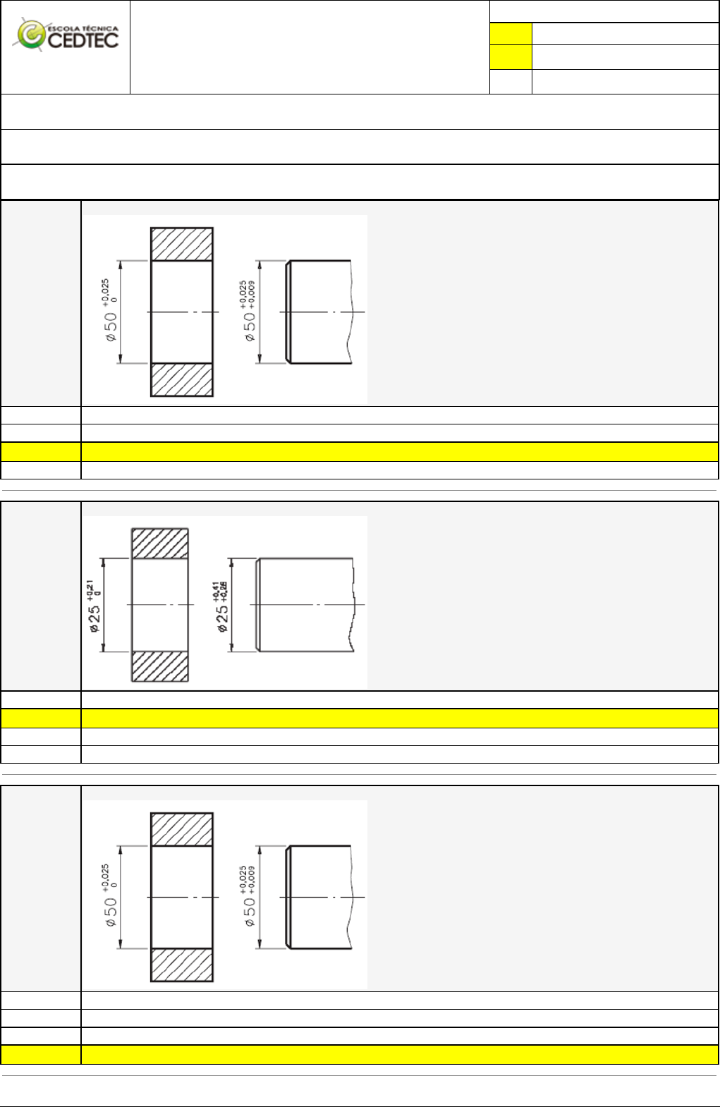 Pincel Atômico - 30/06/2023 19:01:20 1/2 MAGNO JOSÉ APARECIDO DA SILVA Exercício Caminho do Conhecimento - Etapa 10 (642) Atividade finalizada em 25/06/2023 17:52:30 (756268 / 2) LEGENDA Resposta correta na questão # Resposta correta - Questão Anulada X Resposta selecionada pelo Aluno Disciplina: DESENHO MECÂNICO [491240] - Avaliação com 4 questões, com o peso total de 13,00 pontos [capítulos - 114] Turma: Curso Técnico: Mecânica - Grupo: EAD - AGOSTO/22 - EAD MEC [70641] Aluno(a): 91347345 - MAGNO JOSÉ APARECIDO DA SILVA - Respondeu 3 questões corretas, obtendo um total de 9,75 pontos como nota [350246_55257] Questão 001 Qual é o tipo de ajuste do conjunto? Sem interferência Com interferência X Incerto Com folga [350245_55259] Questão 002 Qual o campo de tolerância para o eixo abaixo? 0,28 até 0,41 X 25,28 até 25,41 25,00 até 25,41 25,00 até 25,28 [350245_55256] Questão 003 Qual é a medida mínima e qual é a medida máxima toleradas para eixo respectivamente? 50,00 e 50,009 50,00 e 50,025 0,009 e 0,025 X 50,009 e 50,025 Pincel Atômico - 30/06/2023 19:01:20 2/2 [350246_55260] Questão 004 Analise o desenho mecânico abaixo e indique o afastamento inferior e o afastamento superior do furo respectivamente. +0,25 e 0,00 0,00 e +0,25 30,25 e 30,00 X 30,00 e 30,25