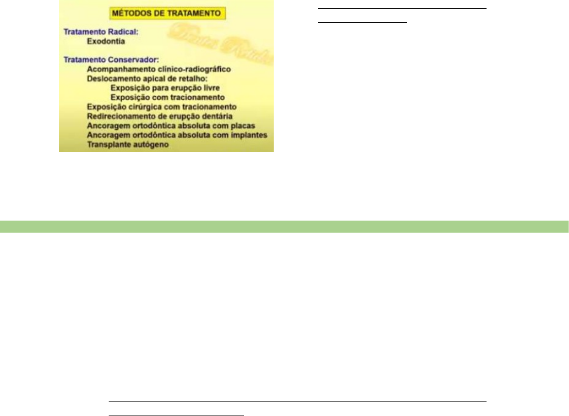 Taliane Aranha 2 Cirurgia com Finalidade Ortodôntica · Os dentes retidos, principalmente aqueles que são importantes na definição da mesa mastigatória, do arco dentário, podem passar por tratamentos conservadores. São cirurgias com finalidade ortodôntica. Importância do dente no arco – estética, funcional. Toda vez que detectarmos que aquele dente é importante no arco estético ou funcionamento, nós procuraremos aproveitá-lo. Mas para isso é preciso avaliar… Planejamento ortodôntico: • Espaço presente ou possibilidade de recuperação; • Condição dentária; (cárie, reabsorções) • Condições econômicas. Avaliar todos os conceitos e causas que levaram à retenção do dente e que podem influenciar no tratamento, sempre pesando os riscos e benefícios. · Lembrar que é possível tracionar dentes retidos em qualquer posição (alveolar, pré-alveolar, retro-alveolar ou trans-alveolar), mas antes é preciso fazer um planejamento cirúrgico com anamnese, exames clínicos e radiográficos (grau de impactação, profundidade de impactação, distância do seio maxilar e cavidade nasal, comprimento de raízes, câmara pulpar, relação com dentes vizinhos, osso alveolar compacto, reabsorção óssea, ângulo de inclinação, associação com cistos - aí não é indicado aproveitar o dente) de modo a definir tudo o que é preciso e evitar danos ao dentes adjacentes · - Por que é importante identificar a câmara pulpar de um canino retido em que será feito o tracionamento? Porque uma das técnicas de tracionamento é a perfuração da coroa quando não há condições de colagem ou laçagem. Assim, é preciso identificar a localização da câmara pulpar a fim de que ela não seja atingida durante o procedimento. Até para saber se tal dente não está com reabsorção coronária ou radicular. Métodos de Localização Radiográfica – periapical, oclusal, panorâmica, Miller-Winter, Parma, Donovan, Clark e Clark oclusal, Mataldi, outros… A radiografia, quando não é feita tomografia, é muito importante pois obrigatoriamente é preciso expor, acessar onde está a coroa, pois é por ela que o dente é tracionado. Todo esse planejamento é necessário para termos previsibilidade cirúrgica. Assim sabemos informações como o grau de abertura bucal do paciente, posição e anatomia do dente e raízes e a relação com os dentes vizinhos e estruturas anatômicas. O sucesso do tratamento vai depender da experiência do profissional, do grau de impactação e da cooperação entre cirurgião e ortodontista. MODALIDADES CIRÚRGICAS: Exposição cirúrgica • Sem tração ortodôntica: Uma das modalidades cirúrgicas é a exposição do dente através da ulectomia. É feita a ulectomia, removida a porção de gengiva que recobre a coroa ou parte da coroa. Se estiver com rizogênese incompleta, ele tem uma força eruptiva e erupciona. a segunda modalidade é realizar tracionamentos. Porém é uma técnica que deve ser preferida se o dente estiver em posição retro-alveolar ou transalveolar, cuja coroa esteja do lado palatino. Isso porque quando na posição alveolar ou pré-alveolar, a ulectomia remove parte importante da gengiva inserida, queratinizada. O dente vai erupcionar sem essa faixa de gengiva, com chances de retrações futuras. ULECTOMIA Indicações: • Durante período ativo de erupção espontânea; • Em impactação com inclinação dental favorável para erupção. Desvantagem – perda da gengiva inserida (quando realizada no vestibular). É uma das técnicas empregadas na região de terceiro molar, por exemplo. Pode ser feita inclusive com bisturi elétrico. DESLOCAMENTO APICAL DO RETALHO Indicações: • Durante período ativo de erupção espontânea • Em impactação com inclinação dental favorável para erupção Quando está pré-alveolar ou alveolar sendo preciso tirar mais gengiva, inclusive de vestibular para colar bracket ou erupção livre pode ser feito o deslocamento apical de retalho É feito um desenho incisional cujas incisões de alivio na vestibular são paralelas. Descolar toda a gengiva vestibular e deslocar para a apical do retalho. O retalho que estava no bordo incisal é deslocado e suturado lá em cima. A prevenção da impactação dental se dá pela identificação precoce de caninos impactados em radiografias panorâmicas. Canino impactado – quando não erupcionado após completa formação radicular ou se o dente contra-lateral já se encontra erupcionado por 6 meses. • Com tração ortodôntica: Há três maneiras: laçagem, perfuração ou colagem LAÇAGEM COM FIO DE AÇO: Vantagens: • Material usado simples e barato; • Em certos casos, facilidade de execução; • “Manutenção” da integridade dental. Desvantagens: • Uso limitado pelo posicionamento do dente retido; • Possibilidade de escapar o laço; • Em vários casos, traumatismo periodontal e ósseo grande; • Possibilidade de falta de zona de retenção para a laçagem; • Local não ideal para a aplicação de força ortodôntica; • Risco de reabsorção radicular. PERFURAÇÃO DENTAL: Vantagens: • Material usado simples e barato; • Em certos casos, facilidade de execução. Desvantagens: • Agressão a integridade da coroa dental; • Possibilidade de fratura do esmalte; • Em alguns casos, maior ostectomia para a abordagem. COLAGEM DENTAL: Desvantagem: • Material específico a ser usado. Botão ortodôntico para colagem com fio de amarrilho. Outras opções: braquete, tela ortodôntica. Para a técnica é utilizado microbrush, água destilada estéril, ácido fosfórico 37%, primer e resina fotopolimerizável. O uso da água destilada é justificado pelo fato de que o soro fisiológico possui cloreto de sódio e outros minerais. Se eu desmineralizo o dente com o ataque ácido, ao lavar com soro fisiológico, eu vou remineralizar. • Dificuldade de execução do perfeito condicionamento do ácido do esmalte (risco de s