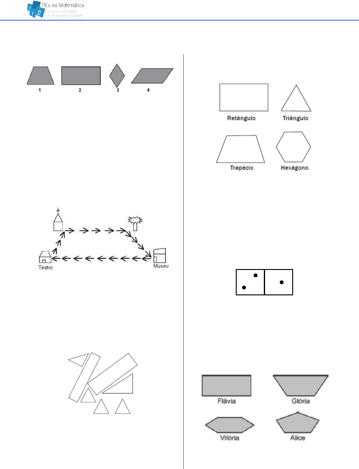 Questões referentes ao descritor 04 de Matemática do 5º ano 1 D4 – Identificar quadriláteros observando as posições relativas entre seus lados (paralelos, concorrentes, perpendiculares) Veja as figuras abaixo. O losango é a figura (A) 1 (B) 2 (C) 3 (D) 4 ________________________________________________________ Chegando a uma cidade, Fabiano visitou a igreja local. De lá, ele se dirigiu à pracinha, visitando em seguida o museu e o teatro, retornando finalmente para a igreja. Ao fazer o mapa do seu percurso, Fabiano descobriu que formava um quadrilátero com dois lados paralelos e quatro ângulos diferentes. O quadrilátero que representa o percurso de Fabiano é um: (A) quadrado (B) losango (C) trapézio (D) retângulo ________________________________________________________ (SPAECE). Sheila usou linhas retas fechadas para fazer este desenho. Quantas figuras de quatro lados foram desenhadas? (A) 2 (B) 3 (C) 4 (D) 5 ________________________________________________________ Nas figuras a seguir estão representados quatro polígonos diferentes. Qual dos polígonos anteriores possui dois lados paralelos e dois lados não paralelos? (A) Retângulo. (B) Triângulo. (C) Trapézio. (D) Hexágono. ________________________________________________________ A face superior das peças de um jogo de dominó tem formato de um quadrilátero. Observe um exemplo: Qual o quadrilátero que melhor caracteriza a face superior da peça de um jogo de dominó? (A) Trapézio. (B) Quadrado. (C) Retângulo. (D) Losango. ________________________________________________________ Alice e suas amigas desenharam algumas figuras geométricas. Quem fez o desenho de um retângulo? (A) Flávia (B) Glória Questões referentes ao descritor 04 de Matemática do 5º ano 2 (C) Vitória (D) Alice ________________________________________________________ Observe as figuras abaixo. O retângulo está marcado com a letra (A) X (B) Y (C) Z (D) K ________________________________________________________ Observe as figuras abaixo. Quais dessas figuras são quadriláteros? (A) Figuras 2, 3 e 4. (B) Figuras 1, 2 e 3. (C) Figuras 1, 2 e 4. (D) Figuras 1, 3 e 4. ________________________________________________________ Vera está fazendo um curso de dobradura. Ela fez um cisne usando duas cores de papel. Veja como ele ficou. Vera percebeu que a parte mais escura do cisne tem a forma de um (A) losango. (B) retângulo. (C) paralelogramo. (D) trapézio. ________________________________________________________ Observe as figuras geométricas abaixo: Quais das figuras geométricas são quadrilátero retos? (A) I e III (B) I e II (C) I e IV (D) III e IV ________________________________________________________ Um quadro de avisos tem forma retangular. Quantas diagonais têm este quadro? (A) 1 (B) 2 (C) 3 (D) 4 ________________________________________________________ Um quadro de avisos localizado no meu quarto tem forma retangular. Este quadro tem quantas diagonais? (A) 1 (B) 2 (C) 3 (D) 4 ________________________________________________________ João gosta de criar coisas diferentes. Um dia desenhou a planta de sua casa conforme a figura abaixo. Quais partes da planta da casa de João lembram a figura de um retângulo? (A) cozinha, banheiro. (B) quarto, banheiro. (C) jardim, garagem. (D) varanda, cozinha. ________________________________________________________ Observe o telhado da casa abaixo: Questões referentes ao descritor 04 de Matemática do 5º ano 3 O seu formato lembra qual quadrilátero? (A) retângulo (B) quadrado (C) losango (D) trapézio ________________________________________________________ Uma fábrica produz espelhos de vários formatos. Observe algumas peças: Qual par de espelhos possui seus lados com a mesma medida? (A) 1 e 2 (B) 2 e 3 (C) 3 e 4 (D) 1 e 4 ________________________________________________________ Gabriel ganhou uma quadra de futebol de botão no seu aniversário. Podemos afirmar que esse objeto tem (A) somente 2 lados paralelos. (B) exatamente 2 pares de lados paralelos. (C) exatamente lados opostos que não são paralelos. (D) exatamente 2 lados paralelos e 2 lados não paralelos. ________________________________________________________ Observe as figuras abaixo: Quais figuras têm dois pares de lados paralelos? (A) 1, 3 e 4 (B) 1, 2 e 5 (C) 2, 3 e 4 (D) 4, 2 e 5 ________________________________________________________