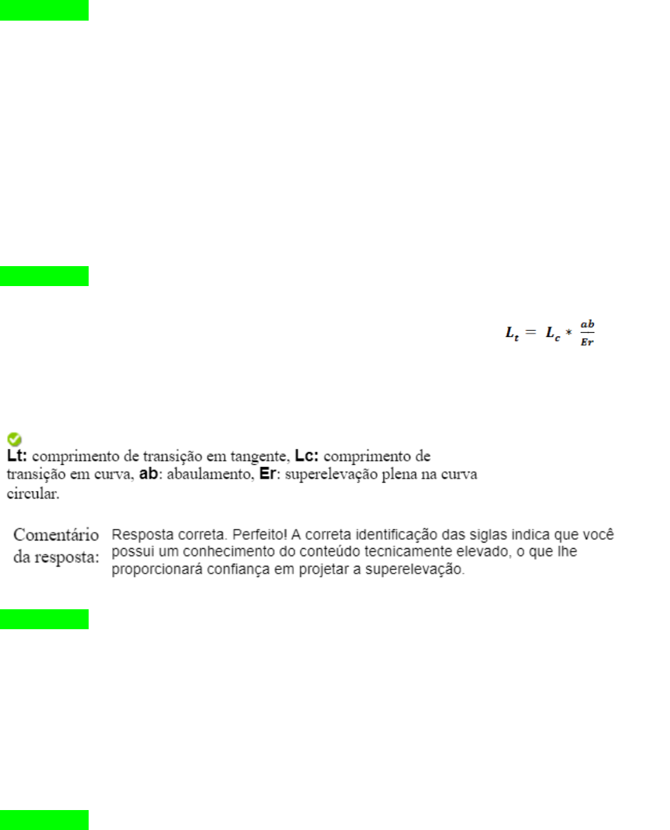 Atividade 2 – INFRAESTRUTURA VIÁRIA PERGUNTA 1 Com relação à geometria, as curvas de transição são necessárias para proporcionar trechos de transição da superelevação da pista e, também, para a transição da largura normal para a superlargura nas curvas, quando for o caso. Com base nessas informações e no conteúdo estudado, assinale a alternativa que apresenta corretamente os critérios relativos aos comprimentos máximos das curvas de transição. Resposta: (1) critério do máximo ângulo central da clotoide; (2) critério do tempo de percurso Feedback: Os critérios do máximo ângulo central da clotoide e do tempo de percurso são fundamentais para um correto projeto geométrico de rodovia, lembrando que devemos sempre respeitar os procedimentos e normas. PERGUNTA 2 O comprimento de transição em tangente pode ser calculado por simples proporção, para conhecimento específico em relação ao significado das siglas da equação: . Considerando a equação apresentada e o estudo do capítulo, assinale a alternativa que corresponde ao correto significado das siglas. Resposta: PERGUNTA 3 Existem duas distâncias de visibilidade básicas consideradas em projeto: a distância de visibilidade de parada e a distância de visibilidade de ultrapassagem. Com base nos estudos do capítulo, assinale a alternativa que define corretamente o conceito de distância de visibilidade de parada (Dp) Resposta: É definida como a distância mínima para que um veículo que esteja trafegando em uma estrada possa parar antes de colidir com determinado obstáculo. PERGUNTA 4 Na escolha do greide de uma rodovia, este é representado pelo eixo X que indica as cotas do traçado viário, e o eixo Y representa a altitude (cotas). Com isto determina o melhor traçado viário para uma determinada rodovia. BRASIL. Ministério dos Transportes. Departamento Nacional de Infraestrutura de Transportes - DNIT. Disponível em: < www.dnit.gov.br>. Acesso em: 06/08/2019. Considerando o estudo do capítulo, em relação à definição do greide de uma rodovia, analise a afirmativa a seguir e assinale a alternativa que completa a frase conforme a correta definição do conceito. O greide é o desenvolvimento altimétrico do perfil _________ do projeto _________ da rodovia, estudo importante para serem realizados parâmetros de _________ de uma rodovia. Resposta: longitudinal; geométrico; visibilidade PERGUNTA 5 A estrutura de um projeto geométrico de uma rodovia segue alguns critérios utilizados em sua elaboração, sendo que a concepção de um projeto de rodovia depende de características físicas e geométricas da via. Considerando essas informações e o conteúdo estudado, assinale a afirmativa que aponta os critérios corretos. Resposta: Prioridade à segurança, rolamento confortável aos usuários, padrão uniforme para manutenção da via e circunstâncias locais da região. PERGUNTA 6 A superlargura e a superelevação em curvas horizontais de uma rodovia são parâmetros de extrema importância para a segurança do usuário. Nesse sentido, é correto afirmar que a largura da pista de uma rodovia é determinada por características peculiares. Considerando essas informações e o conteúdo estudado, assinale a alternativa que apresenta corretamente exemplos dessas características peculiares. Resposta: Os veículos que compõem o tráfego atuante e a velocidade diretriz e operacional da via. PERGUNTA 7 Em projetos rodoviários, existem três tipos de concordância horizontal para conexão de dois trechos em tangentes em uma curva horizontal de transição, sendo que as curvas de transição proporcionam uma trajetória mais natural de ser seguida. Considerando essa afirmação e o estudo do capítulo, em qual circunstância é utilizada uma curva de transição? Resposta: Quando a curva proporcionar maior conforto e segurança aos motoristas. PERGUNTA 8 Uma estrada possui um projeto em perfil, sendo ele constituído de greides retos, os quais necessitam de curvas verticais para fazer a sua concordância. Com base nessas informações e no estudo do capítulo, assinale a afirmativa que corresponde respectivamente às siglas dos pontos de projeto de uma curva vertical: Curva vertical; Interseção vertical; Tangente vertical. Resposta: (PCV); (PIV); (PTV) PERGUNTA 9 Como sabemos, a segurança para o motorista ao trafegar por uma rodovia depende de algumas informações básicas, entre as quais: não encontrar grandes mudanças de velocidade e manter um padrão homogêneo ao longo do trecho, por exemplo. PONTES FILHO, Glauco. Projeto geométrico de rodovias. 2. ed. Uberaba: Universidade de Uberaba, 2013. Com base nessas informações e no estudo do capítulo, assinale a alternativa que demonstra corretamente como determinar a velocidade de projeto de uma rodovia. Resposta: Através da classe de projeto da rodovia; em relação à topografia do terreno (plana/ ondulada/ montanhosa) PERGUNTA 10 Existem duas distâncias de visibilidade básicas consideradas em projeto: a distância de visibilidade de parada e a distância de visibilidade de ultrapassagem. Com base nessas informações e no estudo do capítulo, assinale a alternativa que define corretamente a importância da necessidade utilizar o conceito de distância de visibilidade de ultrapassagem (Du). Resposta: É aquela necessária para que um veículo, que esteja trafegando atrás de outro veículo (muito lento), possa efetuar uma manobra de ultrapassagem em condições aceitáveis de conforto e segurança.