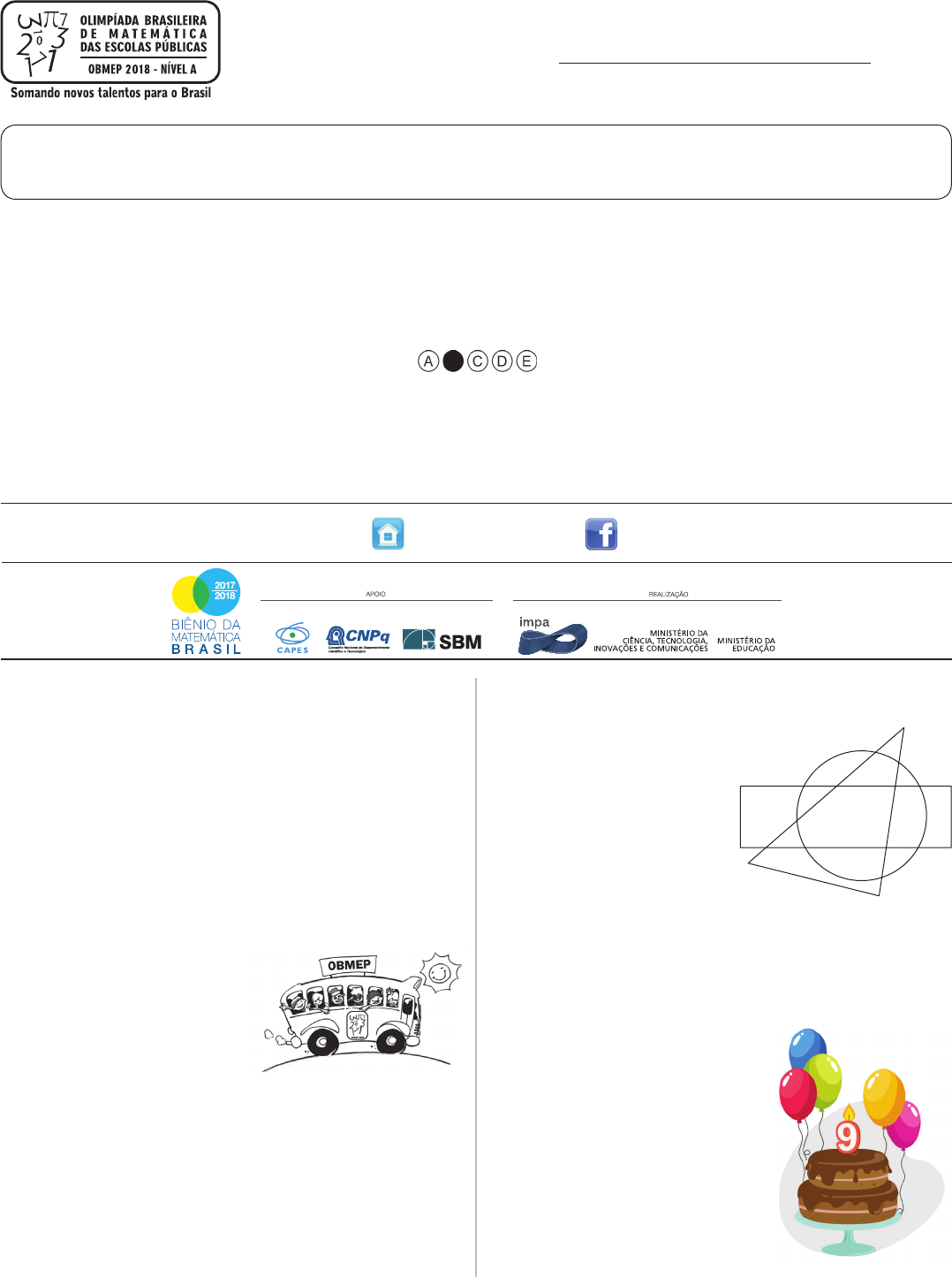 ANível4.º e 5.º anos do Ensino Fundamental Nome completo do(a) aluno(a): _______________________________________________________________________________ INSTRUÇÕES 1. Preencha o cartão-resposta com seu nome completo. 2. A duração da prova é de 90 minutos. 3. Cada questão tem cinco alternativas de resposta: A), B), C), D) e E) e apenas uma delas é correta. 4. Para cada questão marque a alternativa escolhida no cartão-resposta, preenchendo todo o espaço dentro do círculo correspondente, a lápis ou a caneta esferográfi ca azul ou preta. 5. Marque apenas uma alternativa para cada questão. 6. Não use instrumentos de desenho, calculadoras ou quaisquer fontes de consulta. 7. Não use celulares, tablets ou quaisquer outros equipamentos eletrônicos. 8. Os espaços em branco na prova podem ser usados para rascunho. 9. Ao fi nal da prova, entregue-a ao professor junto com o cartão-resposta. www.obmep.org.br www.facebook.com/obmep Visite nossas páginas na Internet: 1. Qual é o valor de 2018 8012+ ? A) 10 000 B) 10 010 C) 10 030 D) 10 218 E) 18 012 2. Um ônibus partiu com 25 pessoas. No caminho, desceram 7 pessoas e subiram 5. Quantas pessoas chegaram ao ponto fi nal? A) 20 B) 21 C) 22 D) 23 E) 24 3. Qual é a soma dos números que estão dentro do círculo e do retângulo, mas que estão fora do triângulo? A) 8 B) 9 C) 10 D) 11 E) 12 4. Quando a irmã de Geraldo nasceu ele tinha 5 anos. Hoje sua irmã faz 9 anos. Quantos anos tem Geraldo? A) 5 B) 9 C) 10 D) 14 E) 16 2 1 3 45 6 7 8 9 10 11 12 13 NÍVEL A OBMEP 20182 5. Qual dos caminhos abaixo é o mais curto entre a escola e o circo? 6. Matilde mediu a altura de uma fi gurinha com um pedaço de régua, graduada em centímetros, como mostra a fi gura. Qual é a altura da fi gurinha? A) 1 cm B) 2 cm C) 3 cm D) 4 cm E) 5 cm 7. Cinco quadrados de papelão foram colocados um a um sobre uma mesa, de acordo com a fi gura. Em que ordem os quadrados foram colocados na mesa? A) E C B D A B) E D B C A C) A B C D E D) E B C D A E) E D C B A 8. Beatriz faz aniversário 17 dias depois de seu colega Antônio. Neste ano o aniversário de Antônio será domingo. Em que dia da semana será o aniversário de Beatriz? A) Sábado B) Domingo C) Segunda-feira D) Terça-feira E) Quarta-feira E)D)C)B)A) A B C D E 3NÍVEL AOBMEP 2018 9. Na fi gura, quantos quadrados brancos você deve pintar de preto de modo que o número de quadrados pretos fi que igual ao número de quadrados brancos? A) 1 B) 2 C) 3 D) 4 E) 5 10. As fi guras da sequência abaixo são formadas por triângulos pequenos. A quarta fi gura tem 16 triângulos. Mantendo esse padrão, quantos triângulos pequenos tem a quinta fi gura da sequência? A) 20 B) 24 C) 25 D) 36 E) 49 11. As casas brancas do retângulo ao lado são transparentes. Qual dos retângulos abaixo fi cará totalmente preto se colocarmos o retângulo ao lado sobre ele? A) B) C) D) E) 12. Os 10 bombons da balança têm o mesmo peso. Quantos gramas pesa cada um? A) 40 B) 50 C) 60 D) 80 E) 100 13. Carlos escreveu um número em cada uma das quatro casas do tabuleiro ao lado. A soma dos números escritos na primeira linha é 8, na segunda linha é 3 e na primeira coluna é 7. Qual é a soma dos números que Carlos escreveu na segunda coluna? A) 4 B) 5 C) 6 D) 7 E) 11 14. Ao abrir um livro velho, Janaína viu que o número das páginas pulava de 24 para 55. Quantas páginas estão faltando entre essas duas páginas? A) 28 B) 29 C) 30 D) 31 E) 32 ... ? 7 ? 8 3 NÍVEL A OBMEP 2018 O pe ra ci on al iz aç ão : 4 15. Observe como montar um cubo de papel: Qual das fi guras abaixo pode ser usada para montar um cubo em que as faces opostas tenham a mesma cor? A) B) C) D) E) 16. Qual dos resultados abaixo é diferente de 52-39 ? A) 42 - 29 B) 72 - 59 C) 53 - 40 D) 54 - 37 E) 152 – 139 17. A turma de Tiago e Maria foi colocada em fi la. Maria tem 17 colegas atrás dela e um deles é Tiago. Tiago tem 14 colegas à sua frente e um deles é Maria. Há 5 alunos entre Tiago e Maria. Quantos alunos tem a turma? A) 14 B) 17 C) 23 D) 26 E) 31 18. Gabriela trouxe para José uma cesta cheia de maçãs e laranjas. José comeu a metade das laranjas e um quarto das maçãs. Das frutas que Gabriela trouxe, quanto sobrou na cesta? A) um quarto B) menos de um quarto C) metade D) mais da metade E) menos da metade 19. A fi gura mostra o caminho entre as cidades de Serrinha e Taquaral. Uma parte da estrada está interrompida para obras, indicada pela linha tracejada, e os viajantes devem passar pelo desvio. Quantos quilômetros a mais os viajantes terão que andar por causa do desvio? A) 20 B) 30 C) 40 D) 50 E) 60 20. Na Rua das Cores há uma casa azul, uma vermelha, uma amarela, uma rosa e uma verde. Essas casas são numeradas de 1 a 5, conforme a fi gura. • As casas vermelha e verde são vizinhas. • As casas amarela e azul também são vizinhas. • A casa rosa é vizinha das casas verde e azul. • A casa amarela não é a de número 5. De que cor é a casa de número 4? A) azul B) amarela C) vermelha D) verde E) rosa } 50 km 40 km 30 km 20 km Serrinha Taquaral