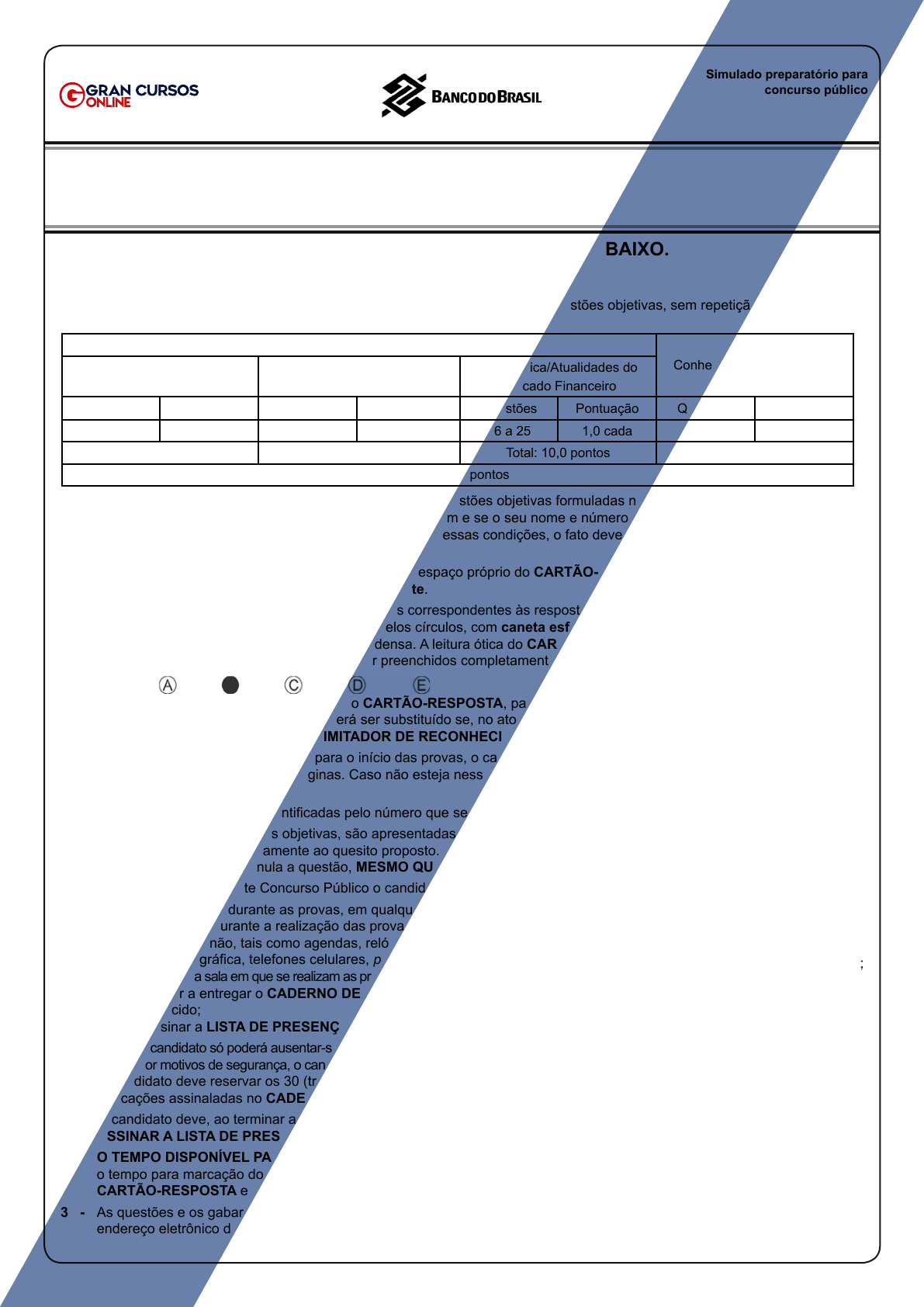 ESCRITURÁRIO AGENTE COMERCIAL LEIA ATENTAMENTE AS INSTRUÇÕES ABAIXO. 01 - O candidato recebeu do fiscal o seguinte material: a) este CADERNO DE QUESTÕES, com o enunciado das 70 (setenta) questões objetivas, sem repetição ou falha, com a seguinte distribuição: Conhecimentos Básicos Conhecimentos Específicos Língua Portuguesa Língua Inglesa Matemática/Atualidades do Mercado Financeiro Questões Pontuação Questões Pontuação Questões Pontuação Questões Pontuação 1 a 10 1,0 cada 11 a 15 1,0 cada 16 a 25 1,0 cada 26 a 70 1,0 cada Total: 10,0 pontos Total: 5,0 pontos Total: 10,0 pontos Total: 45,0 pontos Total: 70,0 pontos b) CARTÃO-RESPOSTA destinado às respostas das questões objetivas formuladas nas provas. 02 - O candidato deve verificar se este material está em ordem e se o seu nome e número de inscrição conferem com os que aparecem no CARTÃO-RESPOSTA. Caso não esteja nessas condições, o fato deve ser IMEDIATAMENTE notificado ao fiscal. 03 - Após a conferência, o candidato deverá assinar, no espaço próprio do CARTÃO-RESPOSTA, com caneta esferográfica de tinta preta, fabricada em material transparente. 04 - No CARTÃO-RESPOSTA, a marcação das letras correspondentes às respostas certas deve ser feita cobrindo a letra e preenchendo todo o espaço compreendido pelos círculos, com caneta esferográfica de tinta preta, fabricada em material transparente, de forma contínua e densa. A leitura ótica do CARTÃO-RESPOSTA é sensível a marcas escuras; portanto, os campos de marcação devem ser preenchidos completamente, sem deixar claros. Exemplo: 05 - O candidato deve ter muito cuidado com o CARTÃO-RESPOSTA, para não o DOBRAR, AMASSAR ou MANCHAR. O CARTÃO-RESPOSTA SOMENTE poderá ser substituído se, no ato da entrega ao candidato, já estiver danificado em suas margens superior e/ou inferior - DELIMITADOR DE RECONHECIMENTO PARA LEITURA ÓTICA. 06 - Imediatamente após a autorização para o início das provas, o candidato deve conferir se este CADERNO DE QUESTÕES está em ordem e com todas as páginas. Caso não esteja nessas condições, o fato deve ser IMEDIATAMENTE notificado ao fiscal. 07 - As questões objetivas são identificadas pelo número que se situa acima de seu enunciado. 08 - Para cada uma das questões objetivas, são apresentadas 5 alternativas classificadas com as letras (A), (B), (C), (D) e (E); só uma responde adequadamente ao quesito proposto. O candidato só deve assinalar UMA RESPOSTA: a marcação em mais de uma alternativa anula a questão, MESMO QUE UMA DAS RESPOSTAS ESTEJA CORRETA. 09 - SERÁ ELIMINADO deste Concurso Público o candidato que: a) for surpreendido, durante as provas, em qualquer tipo de comunicação com outro candidato; b) portar ou usar, durante a realização das provas, aparelhos sonoros, fonográficos, de comunicação ou de registro, eletrônicos ou não, tais como agendas, relógios de qualquer natureza, notebook, transmissor de dados e mensagens, máquina fotográfica, telefones celulares, pagers, microcomputadores portáteis e/ou similares; c) se ausentar da sala em que se realizam as provas levando consigo o CADERNO DE QUESTÕES e/ou o CARTÃO-RESPOSTA; d) se recusar a entregar o CADERNO DE QUESTÕES e/ou o CARTÃO-RESPOSTA, quando terminar o tempo estabelecido; e) não assinar a LISTA DE PRESENÇA e/ou o CARTÃO-RESPOSTA. Obs. O candidato só poderá ausentar-se do recinto das provas após 2 (duas) horas contadas a partir do efetivo início das mesmas. Por motivos de segurança, o candidato NÃO PODERÁ LEVAR O CADERNO DE QUESTÕES, a qualquer momento. 10 - O candidato deve reservar os 30 (trinta) minutos finais para marcar seu CARTÃO-RESPOSTA. Os rascunhos e as marcações assinaladas no CADERNO DE QUESTÕES NÃO SERÃO LEVADOS EM CONTA. 11 - O candidato deve, ao terminar as provas, entregar ao fiscal o CADERNO DE QUESTÕES e o CARTÃO-RESPOSTA e ASSINAR A LISTA DE PRESENÇA. 12 - O TEMPO DISPONÍVEL PARA ESTAS PROVAS DE QUESTÕES OBJETIVAS É DE 4 (QUATRO) HORAS, já incluído o tempo para marcação do seu CARTÃO-RESPOSTA, findo o qual o candidato deverá, obrigatoriamente, entregar o CARTÃO-RESPOSTA e o CADERNO DE QUESTÕES. 13 - As questões e os gabaritos das Provas Objetivas serão divulgados a partir do primeiro dia útil após sua realização, no endereço eletrônico da FUNDAÇÃO CESGRANRIO (http://www.cesgranrio.org.br). Simulado preparatório para concurso público Ba se ad o no fo rm at o de p ro va ap lic ad o pe la b an ca C es gr an rio FOLHA DE ROSTO ORIENTATIVA PARA PROVA OBJETIVA LEIA AS ORIENTAÇÕES COM CALMA E ATENÇÃO! INSTRUÇÕES GERAIS ● Atenção ao tempo de duração da prova, que já inclui o preenchimento da folha de respostas. ● Cada uma das questões da prova objetiva está vinculada ao comando que imediatamente a antecede e contém orientação necessária para resposta. Para cada questão, existe apenas UMA resposta válida e de acordo com o gabarito. ● Faltando uma hora para o término do simulado, você receberá um e-mail para preencher o cartão-resposta, a fim de avaliar sua posição no ranking. Basta clicar no botão vermelho de PREENCHER GABARITO, que estará no e-mail, ou acessar a página de download da prova. Você deve fazer o cadastro em nossa plataforma para participar do ranking. Não se preocupe: o cadastro é grátis e muito simples de ser realizado. – Se a sua prova for estilo Certo ou Errado (CESPE/CEBRASPE): marque o campo designado com o código C, caso julgue o item CERTO; ou o campo designado com o código E, caso julgue o item ERRADO. Se optar por não responder a uma determinada questão, marque o campo “EM BRANCO”. Lembrando que, neste estilo de banca, uma resposta errada anula uma resposta certa. Obs.: se não houver sinalização quanto à prova ser estilo Cespe/Cebraspe, apesar de ser no estilo CERTO e ERRADO, você não terá questões anuladas no cartão-resposta em caso de respostas erradas. – Se a sua prova f