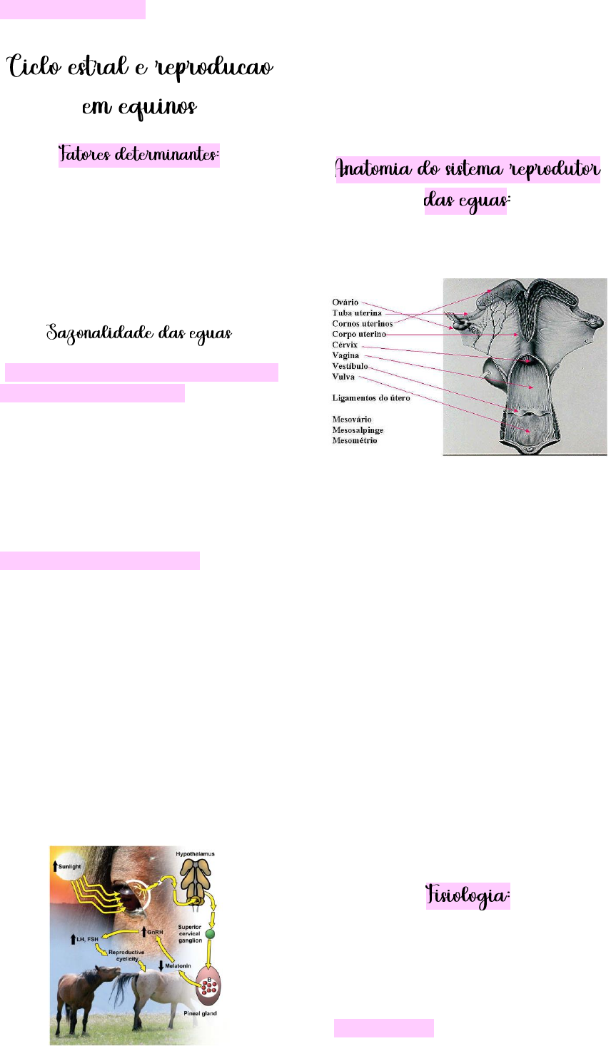 @academicosmedevet Sazonalidade das éguas. Eixo hipotalâmico hipofisário gonadal. Anestro sazonal. Ciclicidade. -São animais monovulatórios poliéstricos estacionais de dias longos (Produção e concentração de melatonina). Nas estações de dias longos as éguas irão ter muitos estros, ovulando apenas uma vez por estro, por ciclo. -Ciclam na primavera e verão (Éguas são animais que ciclam nas estações de dias longos). Equinócio de primavera- 21 de setembro. Solstício de verão- 21 de dezembro. Equinócio de outono- 21 de março. Começam a ciclar quando os dias deixam de ser mais curtos, para quando os dias começam a ficar mais longos. -Lábios vulvares (Externamente) -Clitóris -Vestíbulo vaginal (Internamente) -Orifício uretral da égua -Cérvix (que é a porta de entrada para o útero). -Corpo uterino. -Cornos uterinos direito e esquerdo. -Tubos uterinos levam até os: -Ovários direito e esquerdo. Hormônios que agem no eixo hipotalâmico hipofisário gonadal: -Glândula pineal @academicosmedevet Produz o hormônio melatonina, que é produzido durante a noite. Sua função nesse eixo hipotalâmico hipofisário gonadal é inibir a atividade gonadotrófica, ou seja, bloquear o eixo. Nas estações de outono e de inverno que os dias estão mais curtos e as noites mais longas, é onde se tem a maior produção de melatonina, é quando se tem o bloqueio do eixo é aquela sazonalidade anestro sazonal. -Hipotálamo: O hipotálamo é a região do cérebro formado por neurônios na qual ocorre a junção e controle do sistema nervoso e do sistema endócrino para a produção de hormônios que serão transmitidos à adeno- hipófise e à neuro-hipófise. Hormônios armazenados na adeno-hipófise: hormônio Folículo Estimulante (FSH), hormônio Tireoestimulante (TSH), hormônio adrenocorticotrófico (ACTH), entre outros. • Hormônios armazenados na neuro- hipófise: ocitocina e vasopressina (ADH). FSH – chega até os testículos para a produção de testosterona seguida à produção de espermatozoides. Ao alcançar o nível aceitável de testosterona ocorre o feedback negativo ou a retroalimentação negativa que alcança a adeno-hipófise fazendo com que o hipotálamo pare o envio de neurotransmissores e cesse a sintetização de FSH. • TSH – segue para a tireoide para estimular a produção de T3 e de T4 que atuam no organismo como um todo regulando o metabolismo das células. Quando o nível desses hormônios voltar a circular normalmente, uma resposta inibidora irá até o hipotálamo para que cesse a sintetização de TSH. • ACTH – estimula o córtex da glândula suprarrenal para produzir o cortisol, também responsável por regular o metabolismo de todas as células do organismo. A quantidade diária de cortisol liberada no organismo dos animais é também chamada de Ciclo Circadiano. A quantidade liberada varia de espécie para espécie. • LH - No início de cada ciclo estral, a hipófise libera pequenas quantidades de FSH e LH (hormônio luteinizante) que provocam o crescimento e amadurecimento dos folículos ovarianos. O crescimento destes folículos induz ao aumento da produção de estrógeno que estimula a ovulação, fazendo com que os animais alcancem o estro. Após a ovulação, os elementos residuais do folículo rompido formam o corpo lúteo que secreta estrogênio e grandes quantidades de progesterona com o objetivo de manter a gestação. Os hormônios produzidos pela neuro- hipófise são denominados neurotransmissores, são eles: • Ocitocina – estimula ovários, útero e glândulas mamárias. No caso do útero gravídico, promove a contração da musculatura uterina no momento do parto. Assim que o último filhote nasce, o hipotálamo recebe o feedback para que o estímulo de contração produzido pela neuro-hipófi se cesse. • ADH - também conhecida como hormônio antidiurético (ADH) ou vasopressina (VP), é um hormônio hipotalâmico com ação nas células renais, hepatócitos e células vasculares, produzindo antidiurese, aumentando a @academicosmedevet gliconeogênese e atuando como um importante vasoconstritor. Hipotálamo: GnRH( Hormônio liberador de gonadotrofinas) Promove a liberação de FSH e LH No hipotálamo temos a produção do hormônio GnRH, que vai até a hipófise anterior promover a liberação do hormônio folículo estimulante e do hormônio luteinizante. •Hipófise: Na hipófise anterior, existe a produção de FSH(Hormônio folículo estimulante), que é responsável pelo recrutamento folicular, estimula o crescimento e a maturação dos folículos. Na hipófise anterior também é produzido o LH(Hormônio luteinizante), que promove a maturação oocitária, a ovulação e luteinização do folículo pós ovulação. •Nas gôndolas, nos ovários: -Folículos, corpo lúteo. Esses folículos são responsáveis pela produção do E2 ou hormônio estrógeno: responsável pelo comportamento sexual. -Inibina: inibe a liberação de FSH. A inibina é um Hormônio que faz um feedback negativo na hipófise. É produzida a inibina quando o folículo se torna dominante, um folículo grande. •Corpo lúteo(Ou CL): Responsável pela produção de P4 ou progesterona em função da preparação do endométrio e manutenção da prenhez. •Útero: Onde o endométrio- é produzido a prostaglandina F2 (Alfa), lise do corpo lúteo, a luteolise do corpo lúteo. : Em dias mais longos, nas estações de maior dias, aumentando a incidência de luz solar na retina do animal, a retina mandará um sinal para glândula pineal que entenderá que não se tem mais tanta noite para produção de melatonina, logo ela acaba diminuindo a produção de melatonina que no eixo hipotálamo hipofisário gonadal tinha a função de bloqueá-lo. Logo, com a maior produção e com a menor concentração na circulação de melatonina começamos a ativação no eixo hipotalâmico hipofisário gonadal. Aqui o ovário, a glândula hipofisário e o