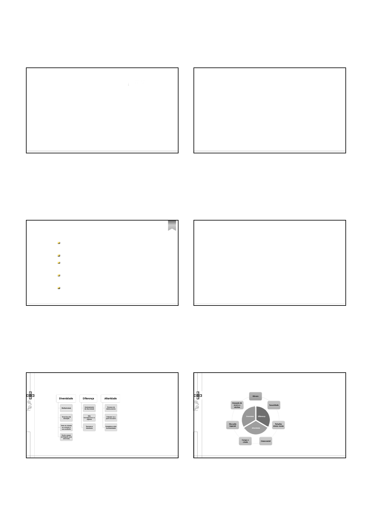 1 Aula 6 Temas contemporâneos: da diversidade de gênero à faixa geracional Profa. Dr. Diego Coletti Oliva Conversa inicial Temas apresentados nesta aula Repensando a diversidade Relacionar os temas Discriminação e educação Bullying e o espaço escolar A atuação em sala de aula Repensando a diversidade Como definimos a diversidade? Temas trabalhados na diversidade 2 Relacionar para compreender Diversidade acontece de forma muito mais dinâmica Relacionar os conceitos trabalhados é fundamental Exercício de alteridade Atenção Não existe alteridade plena Importante não perder o foco que o exercício é limitado Não há como vivermos plenamente o lugar de outra pessoa, mas podemos exercitar essa ideia Relacionar os temas Conceito articulador Interseccionalidade Diferentes formas de subalternidade Compreensões mais complexas da realidade Leitura básica para o tema Atualidade do conceito de interseccionalidade para a pesquisa e prática feminista no Brasil de Cristiano Rodrigues Interseccionalidade Consequências estruturais e dinâmicas da interação entre dois ou mais eixos da subordinação Racismo, o patriarcalismo, a opressão de classe e outros sistemas discriminatórios 3 Raça, gênero, classe social, geração, etc. reconfiguram-se mutuamente Multidimensionalidade Do ponto de vista da reflexão e da ação política, todas as dimensões estão relacionadas Discriminação e educação Quebre o silêncio O silêncio reforça preconceitos O silêncio geralmente é acompanhado pela cumplicidade com as chamadas “brincadeiras” O silenciamento das diferenças é oposto ao reconhecimento Discriminação na escola A escola é um espaço de formação de indivíduos e de saberes Fundamental para um processo de construção da diferença e enfrentamento do silêncio Promover a mudança O papel do docente Constante processo de autorreflexão Questionar aquilo que entendemos como “normal” Direito básico de existir, falar e se expressar no espaço escolar Bullying e o espaço escolar 4 O que é bullying? “Intimidação” Atos sistemáticos de violência física ou simbólica Promovidas pelos próprios colegas de sala ou escola Características interseccionais Leitura básica deste tema Previna o bullying – Jogos para uma cultura da paz de Simão de Miranda e Miriam Dusi Alguns dados sobre bullying 70% dos estudantes já presenciaram violências dentro da escola 28% dos estudantes já foram vítimas de violência dentro da escola 21% das violências aconteceram dentro da sala de aula Brincadeira e bullying Divertir-se “com” o outro implica reciprocidade, compartilhamento Divertir-se “à custa” do outro, ao contrário, implica, intimidação, coisificação do outro As diferenças entre os caminhos são nítidas Sugestões para fomentar o debate No livro-base para este tema, 10 atividades são elencadas O Diário de Davi Filmes sobre bullying: Tiros em Columbine (2002) Elefante (2003) Aos Treze (2003) Carrie, a estranha (1976 ou 2013) 5 A atuação em sala de aula A importância da prática Prática inclusiva é fundamental Prevenir as violências, opressões e discriminações Aplique o que viu aqui Não se sente apto? Convide alguém que trabalhe com isso A prática da docência é múltipla Interseccional Interseccionalidade Alteridade Educação pela diferença O espaço escolar Papel fundamental na constituição dos sujeitos Reforça identidades e identificações e compreende sua relação com o mundo Combater preconceitos, silêncios e formas de discriminação Na prática 6 Como foi sua história na escola? Sofreu algum tipo de violência? Conhece alguém que sofreu? O que você faria se algum dos casos que conhece acontecessem dentro da sua sala de aula? Finalizando Série de fatores que devem ser encarados dentro de seus contextos Dados, referências, teorias e conceitos A diversidade não deve ser negligenciada Temática contemporânea
