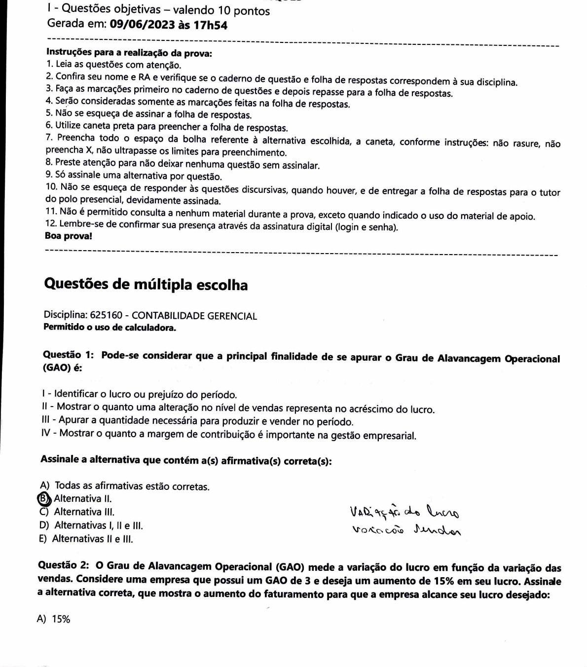Questão 2: O Grau de Alavancagem Operacional (GAO) mede a variação do lucro em função da variação das